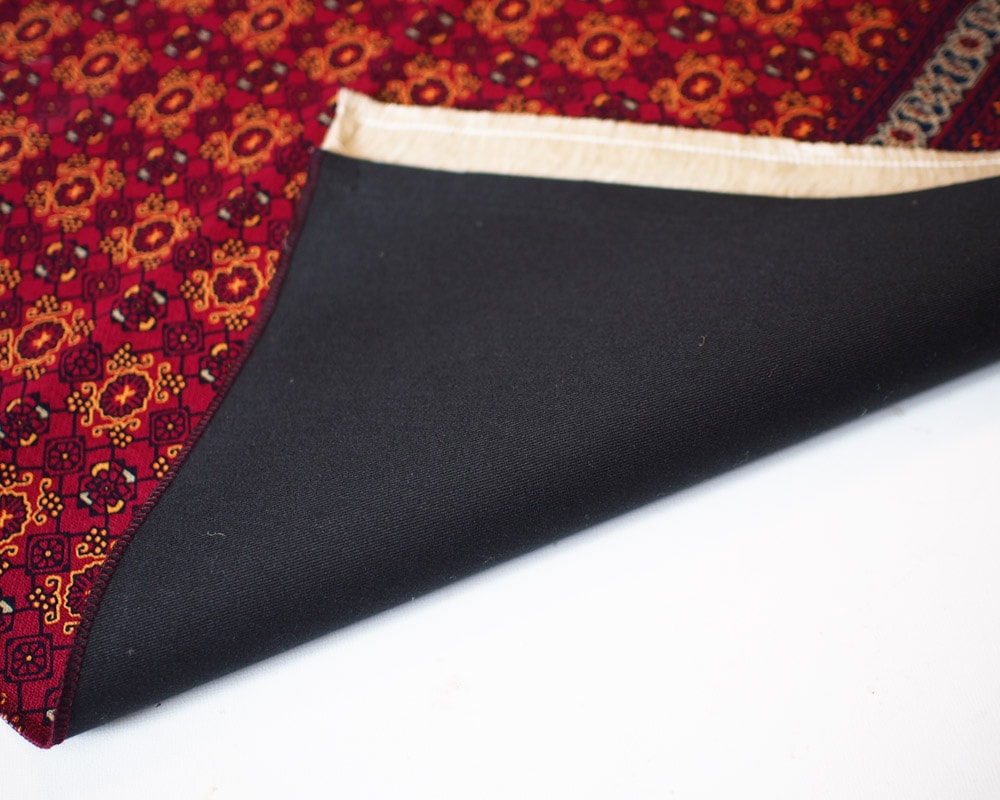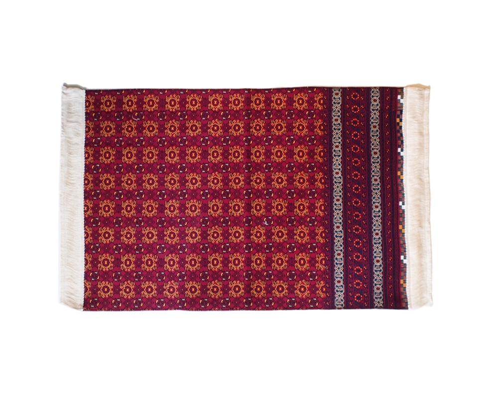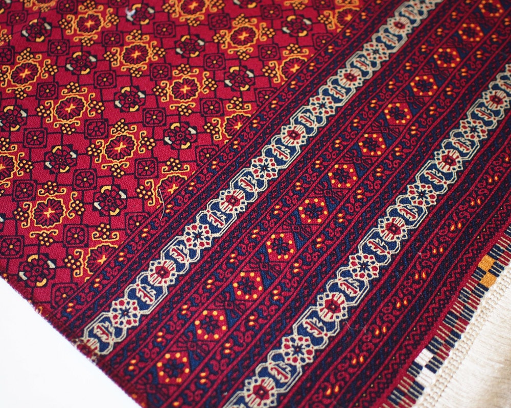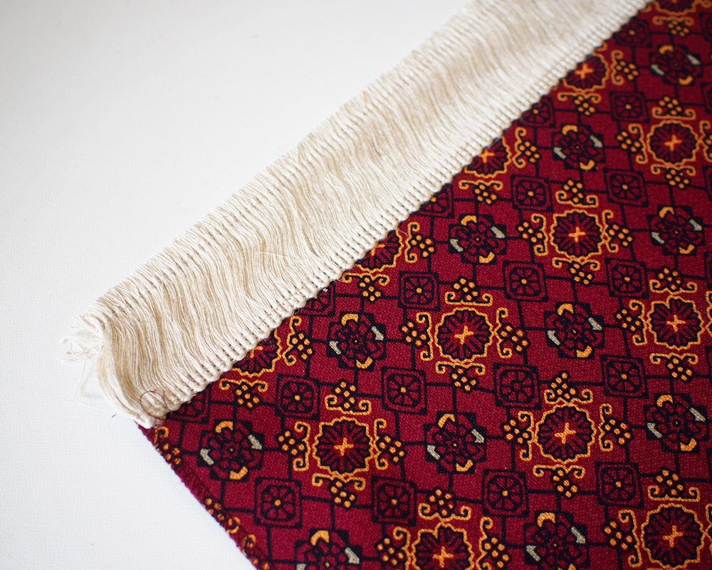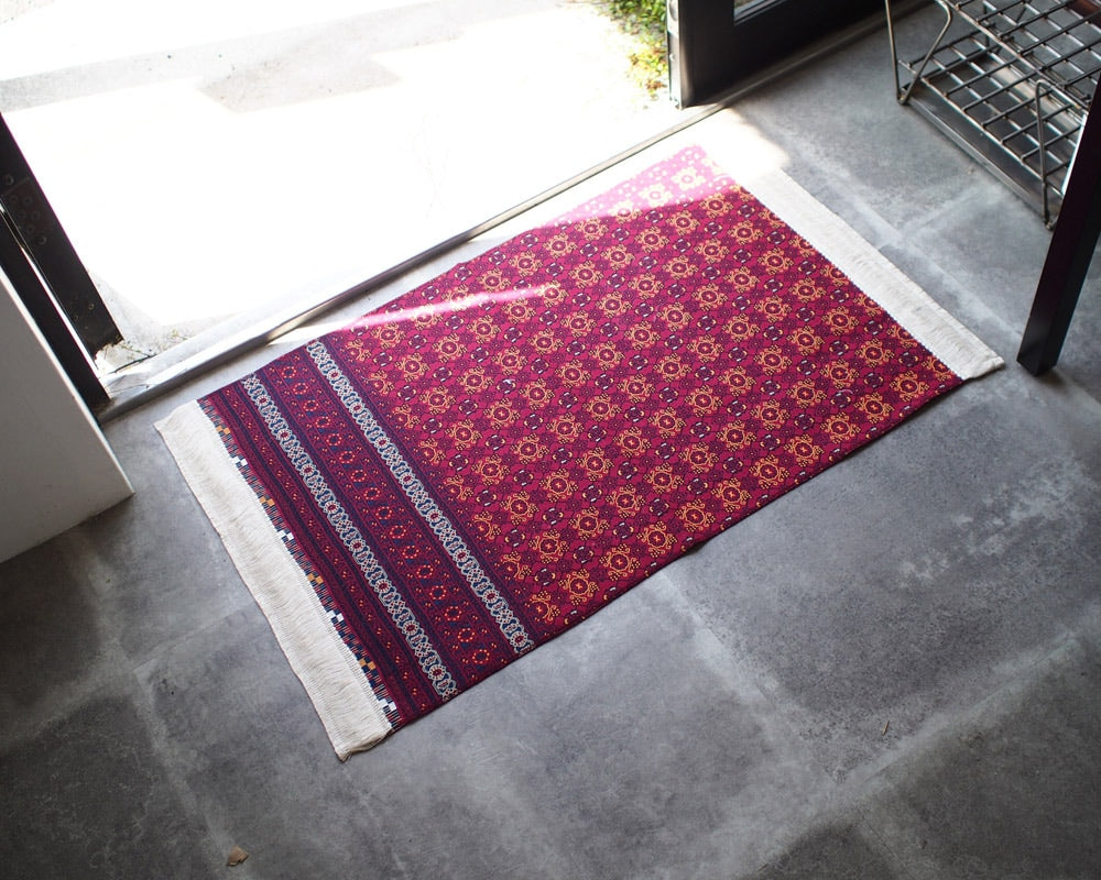 キリムをモチーフにデザインされた生地「AFG Rug」を使ったランドスケーププロダクツのオリジナルマット。 テキスタイルブランドcoccaと共同でデザイン、制作された「AFG Rug」という名の生地。 この生地はアフガニスタンの絨毯:キリムをモチーフに、表情のあるコットンにそのデザインをプリントして作られています。 その生地「AFG Rug」にブラックの厚手の生地を裏側につけることで「マット」に仕上げられています。 また、両端にはリネンのフリンジをあしらい、さながらキリムのような雰囲気をかもし出しています。 ラグといっても綿素材なので、水洗いも可能でいつでも清潔に保っていただけます。