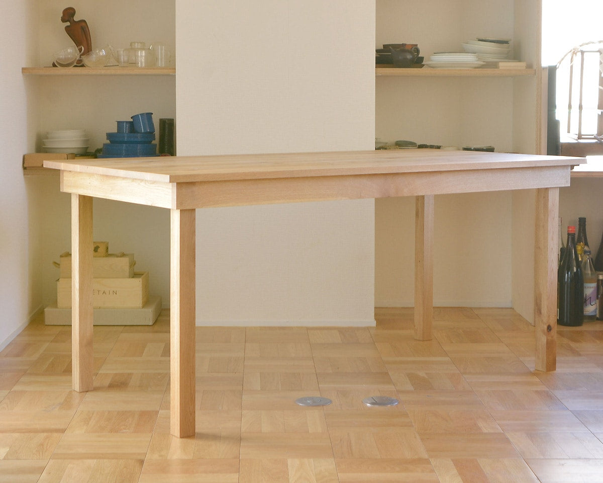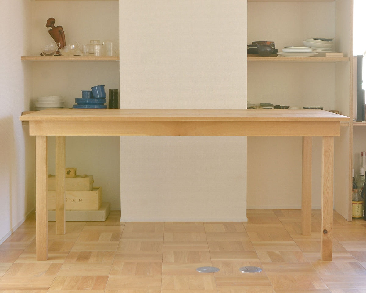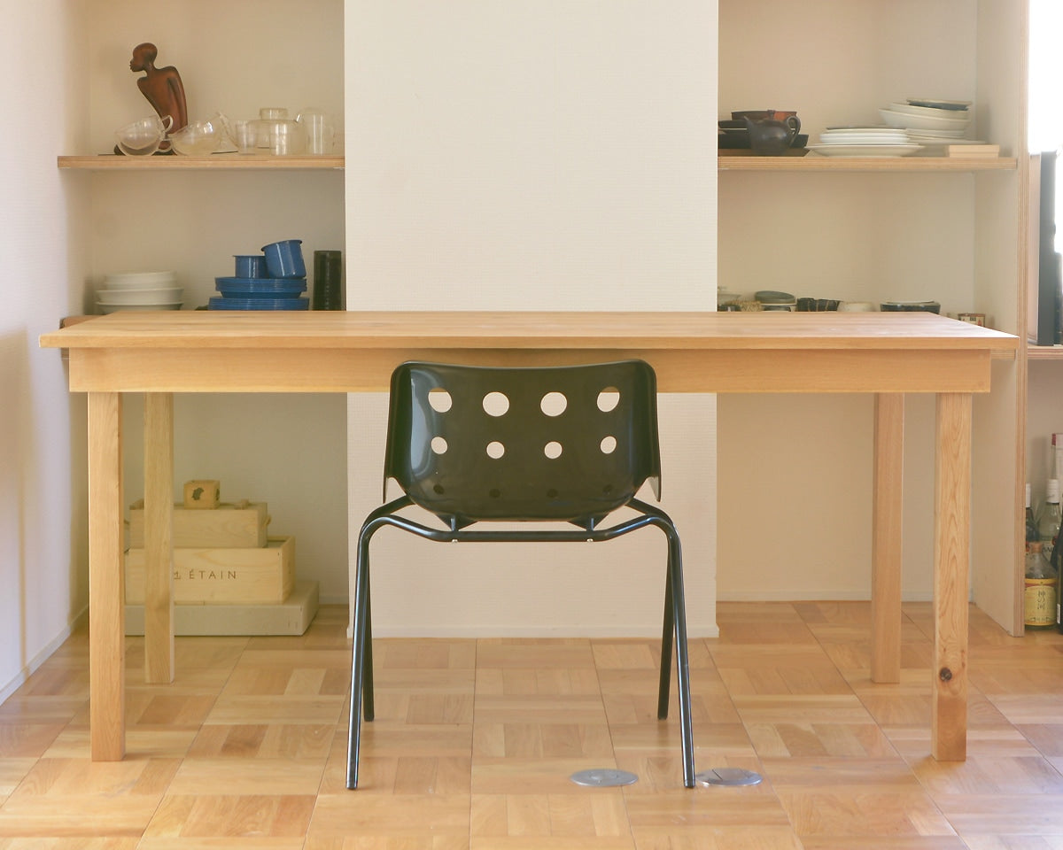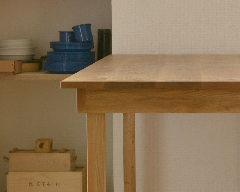 ランドスケープのシンプルで美しいフォルムのダイニングテーブル「Flaming Dinning Table(フレミングダイニングテーブル)」です。 脚と幕板を組み合わせたダイニングテーブルで、脚を幕板の内側に納め、厚みを抑えた天板によって重量を軽量化。大人二人がいれば簡単に動かすことができます。