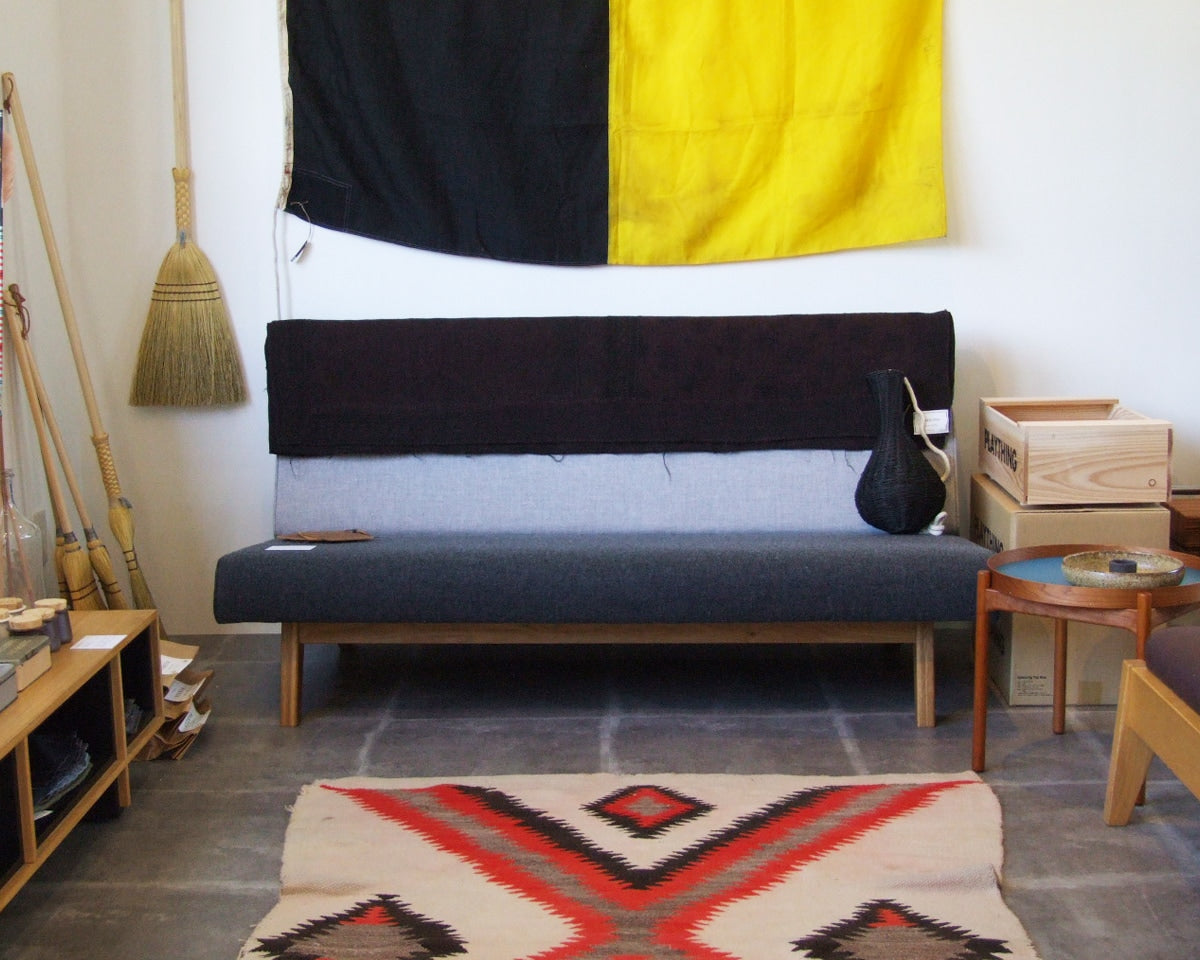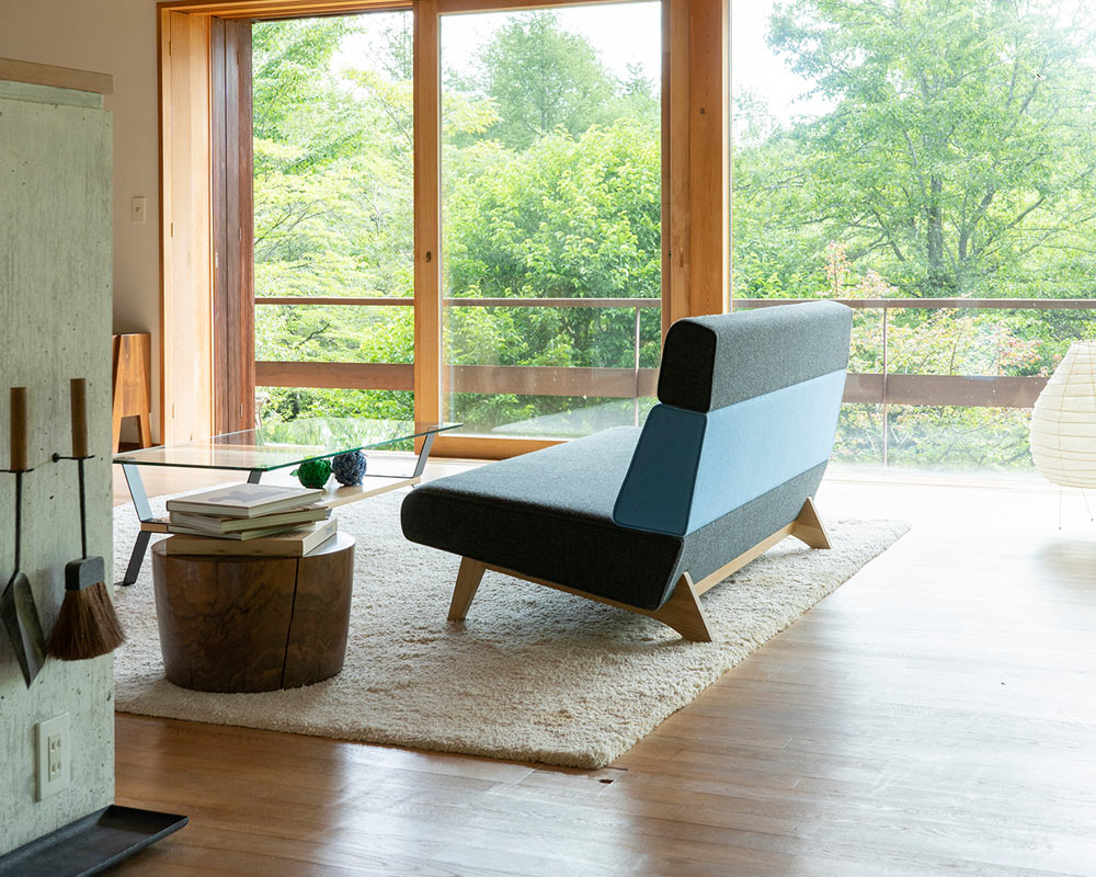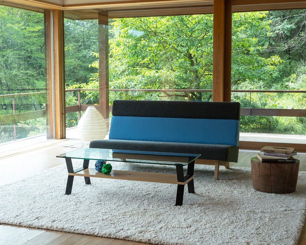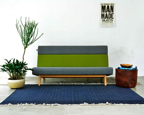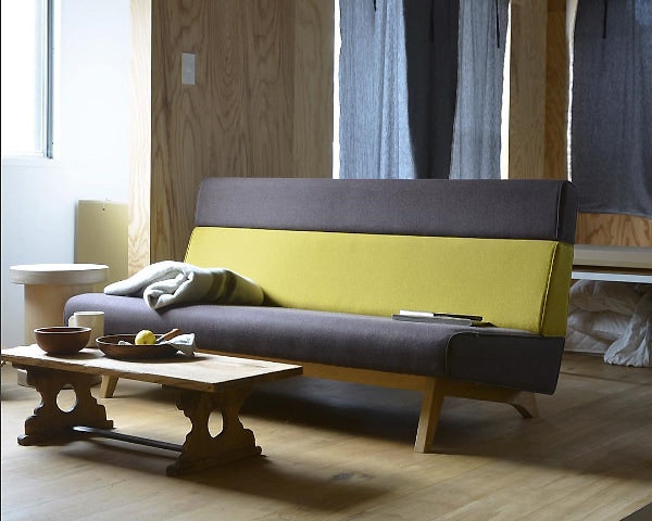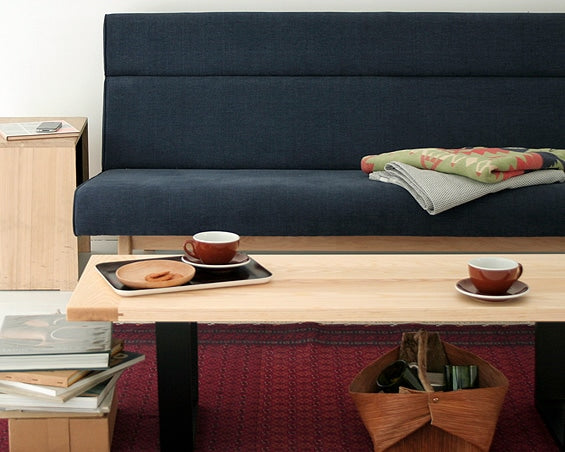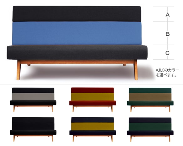 ランドスケーププロダクツ定番のソファ「Tac Sofa(タックソファ)」です。 『見た目通りの安定した座り心地』 見た目の重量感通りの安定した座り心地のソファです。 サイズは2.5シーターで、2人でゆったり座れることができるのも魅力的。 低めのシートハイは小柄な方でも座りやすく、正面から後方へかけてつけられた座面の緩やかな傾斜により、自然と座る体制に馴染んでいく形になっています。 『自由な姿勢で』 座面は一般的なソファより奥行きがあるので、ソファの上であぐらをかいたり、寝そべったりと自由な姿勢でくつろげます。 また背もたれは高めに設定し、自然な姿勢で座ったときに首元をしっかり支えてくれます。 『お好みの配色で自分だけのソファを』 TAC Sofaの最大の特徴でもある配色は、背もたれ上部(A)・背もたれ下部(B)・座面(C)をお好みでお選びいただき製作することができます。 張地にはリバコ社製ファブリック。(右画像をクリックで拡大) シンプルに単色で作ることも、3箇所のカラーを全て変えて製作することが可能です。
