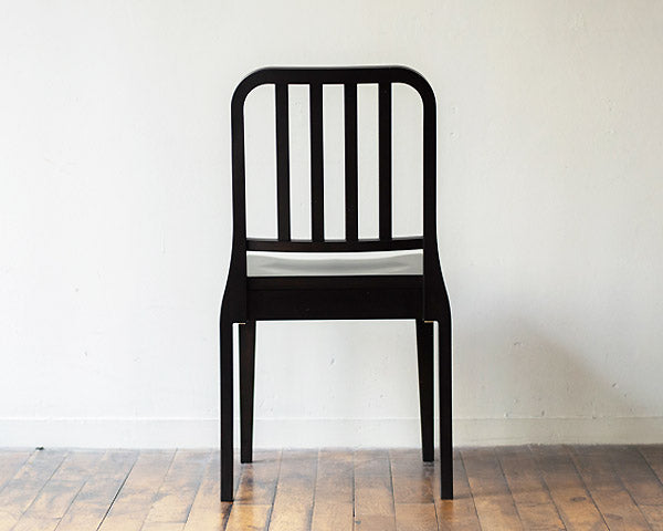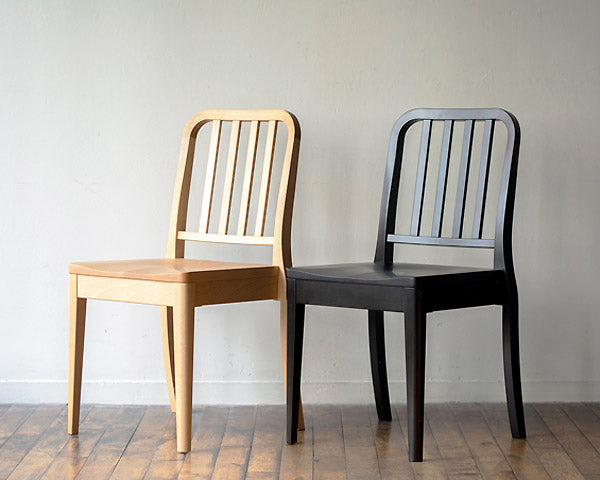 ランドスケーププロダクツのOld Navy Chair(オールドネイビーチェア)の黒染色仕様です。 ベーシックなフォルムと、ブナ無垢材の主張しすぎない色合いは安定感と、どんなダイニングテーブルにも合わせやすい魅力を持っています。 特にTights Dining Tableとの相性は非常に良く、センスの良いダイニングセットとしてお勧めできます。 スタッキングが可能ですので、不要なときは省スペースに片付けておくこともできます。 丁寧に削り出され作られたこのOld Navy Chairの座面は、体のラインに合わせて加工がされており、クッションが無くても長時間くつろぐことができます。 染色により黒色に着色しているため、木目の雰囲気も残る上質な雰囲気です。