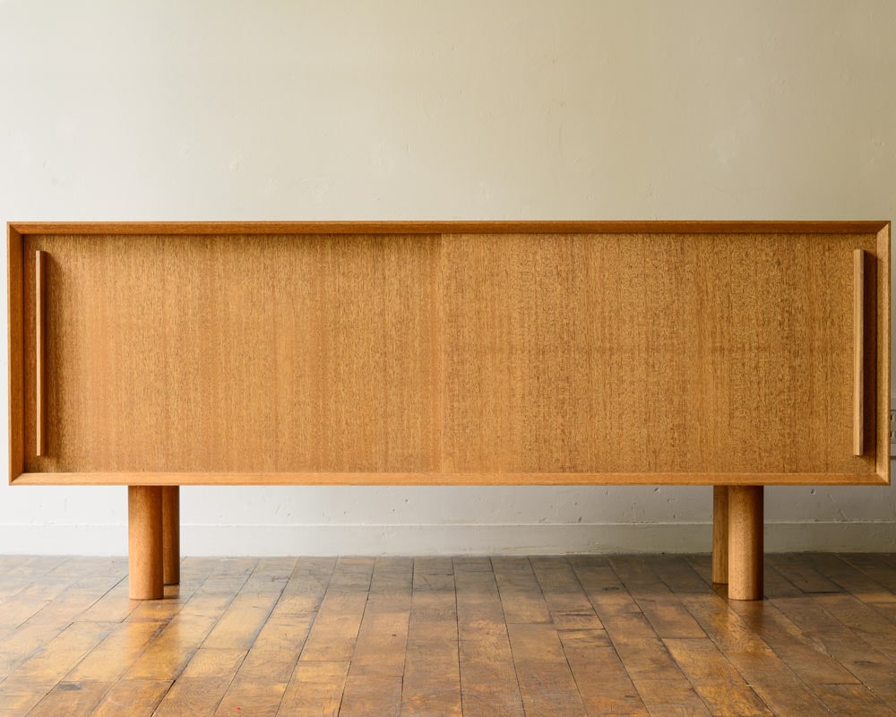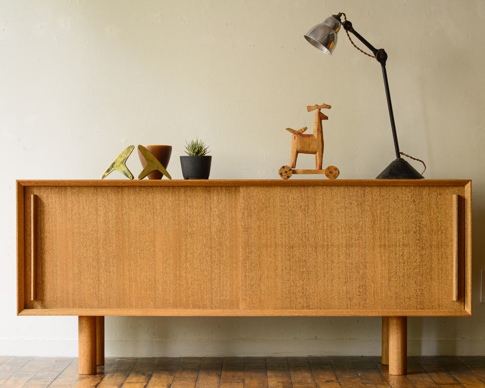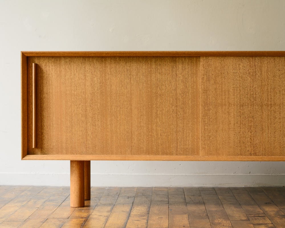 Landscape Products(ランドスケーププロダクツ)の南洋材を全面に使用した表情のあるキャビネット「Melapi Low /メラピーロー キャビネット」です。 南洋材の木は薄い合板に加工され、20世紀中頃のモダン住宅建築などにもよく見受けられる素材でした。時間経過した素材はよい表情です。 この素材感から発想を得て、製作されたランドスケーププロダクツデザインの存在感のある表情のキャビネットになります。 高い収納力でダイニングはもちろん、リビングにも書斎にも、場所を選ばずお使いいただけます。 背が低く、広々と収納が可能なこちらはテレビボードとしてもおすすめな仕様となります。