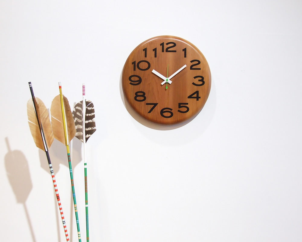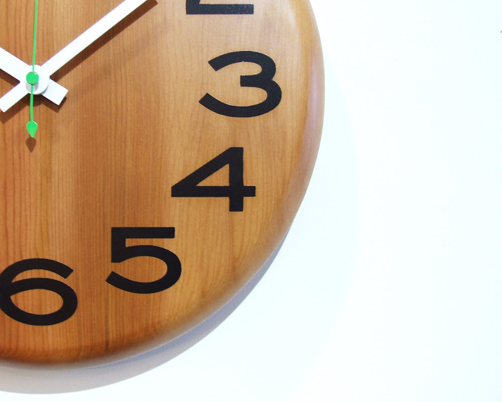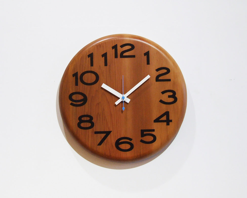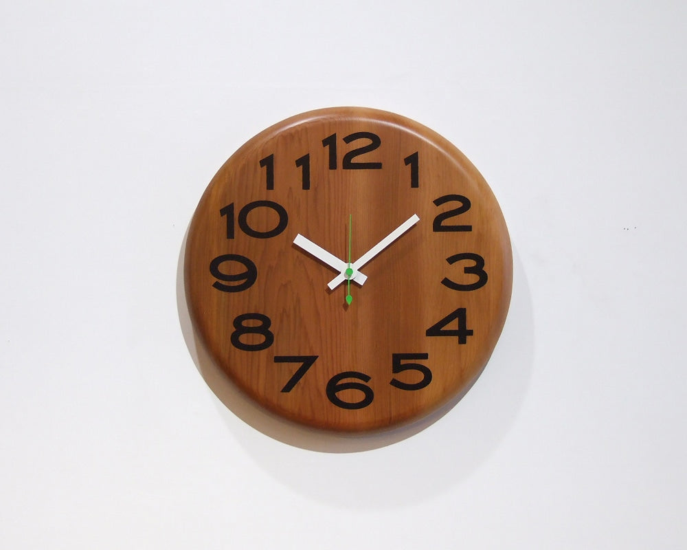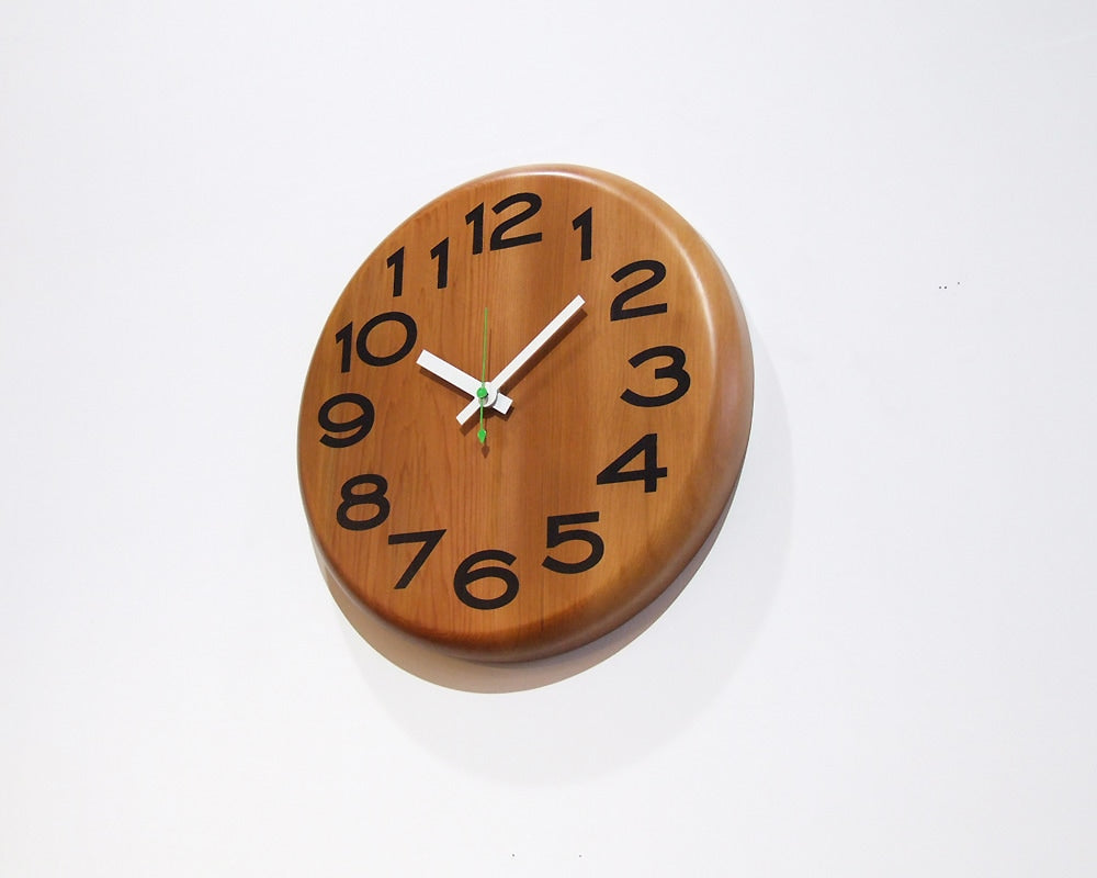 ミッドセンチュリー期のクロックをイメージしてデザインされた、ランドスケーププロダクツのウォールクロックです。 ヨーロッパのチーズの思わせるシルエットと、気泡のような木材の節をそのまま活かし、非常に暖かみのある表情と、無垢の木をそのまま削りだした素朴さが合わさった、掛け時計です。 アイボリーの時針・分針に合わせた秒針はライトブルーとライトグリーンからお選びいただけ、柔らかなアクセントになっています。 自然の木材を使用しているため、木目や節は1点ずつ異なり同じものが2個とないのも特徴です。 ムーブメントは電池式で秒針が滑らかに動くスイープセコンドタイプです。