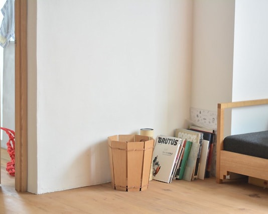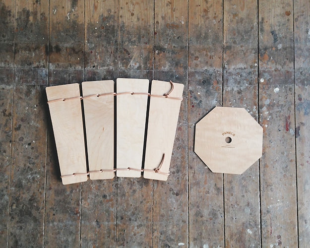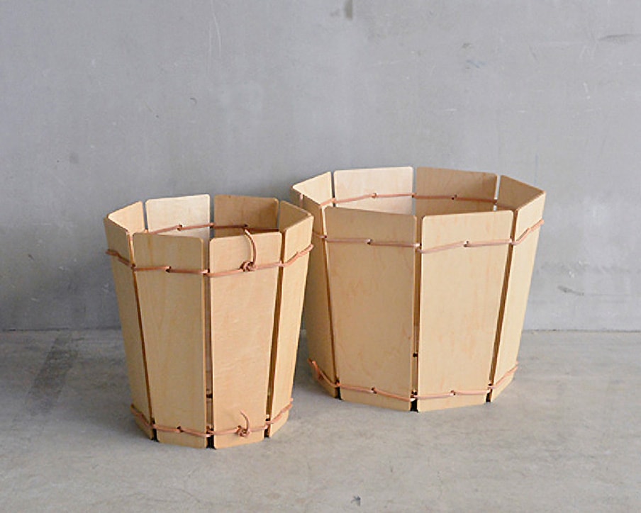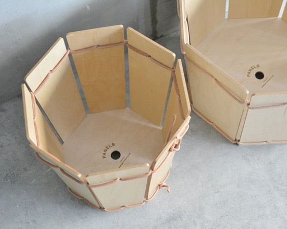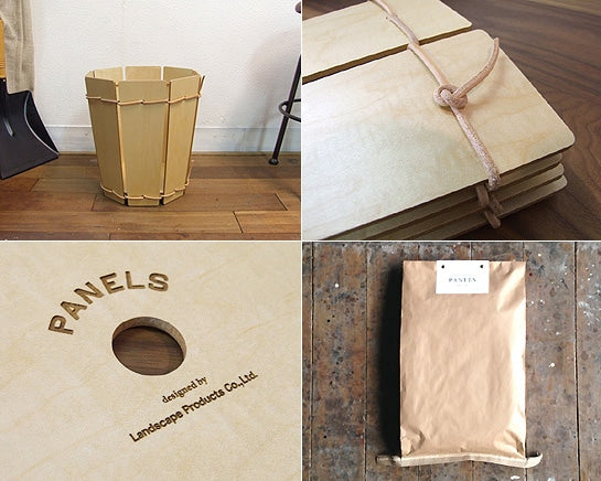 ランドスケーププロダクツの8枚のMDFパネルを革レースで丁寧に編み繋いだユーティリティバスケット「PANELS」です。 メープル材の突板を施した8枚のMDFパネルを、手仕事を感じさせる革レースで丁寧に編み繋いだバスケットです。 多面体のスタイリッシュなフォルムながら、木と革の天然素材の質感があたたかみを感じさせ、インテリアにも自然に取り入れることができます。 また、革とウッドの経年変化も楽しめます。 ブランケットや雑誌をちょっと入れておいたり、玄関でスリッパ入れにしてみたり、多様な用途でご提案が可能です。 底板を外して折り畳むことが出来るので、写真にあるような小さなクラフト袋のパッケージでのお届けとなります。