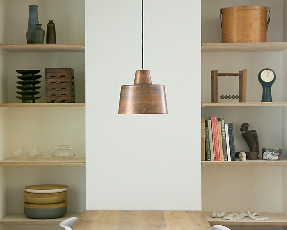 ランドスケーププロダクツ定番のCeiling Lampシリーズに新しく無垢の銅を使用した、「Copper」が新しく加わりました。 北欧のアンティーク照明にヒントを得てデザインされた、ぽってりとした照明は、ダイニングテーブルの上だけでなく、室内のどんな場所でもすんなりとなじんでくれます。 銅の素材感を生かすためにあえて絞り痕をのこしたシェードはオイルで仕上げられ、月日を経るごとに味わいが増していきます。 その絶妙な磨き具合は幾度もの試作を経てたどり着いたもので、複数灯を吊るせば、ひとつひとつの表情の違いも楽しむことが出来ます。 コード色はブラックを採用しシェード上部の留め具は真鍮製で、モダンながら多少無骨な雰囲気も演出しています。 また、深めのシェードは直接電球が目に入りにくく、シンプルで、機能的なフォルムです。 シンプルでモダンな空間に映える、ラフな存在感が特徴の照明器具です。