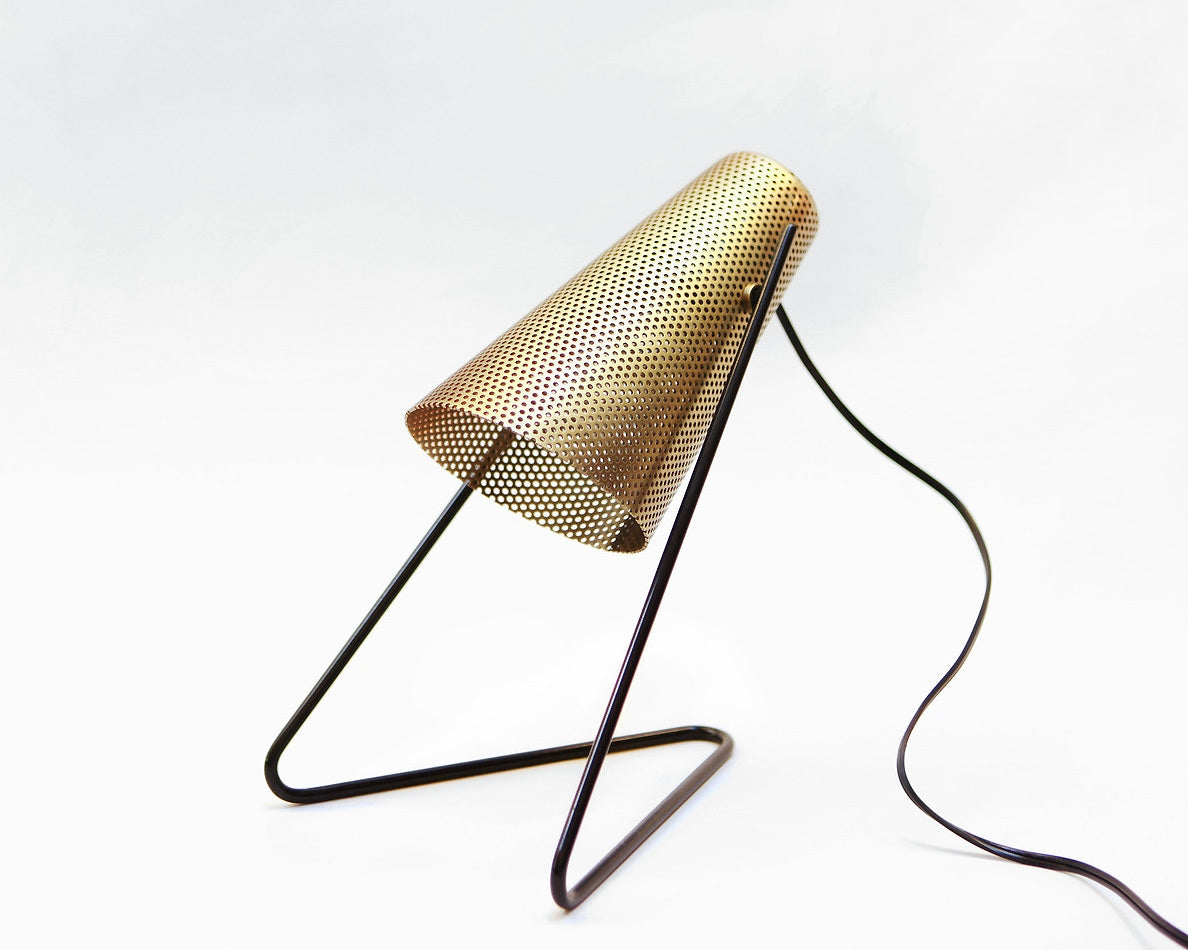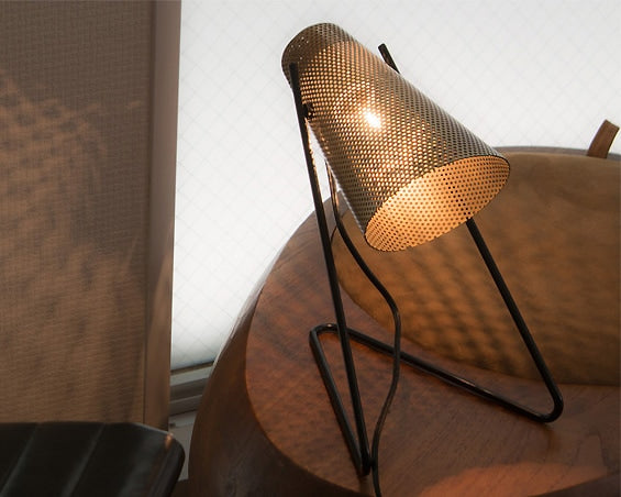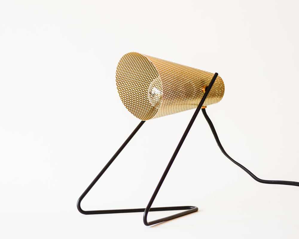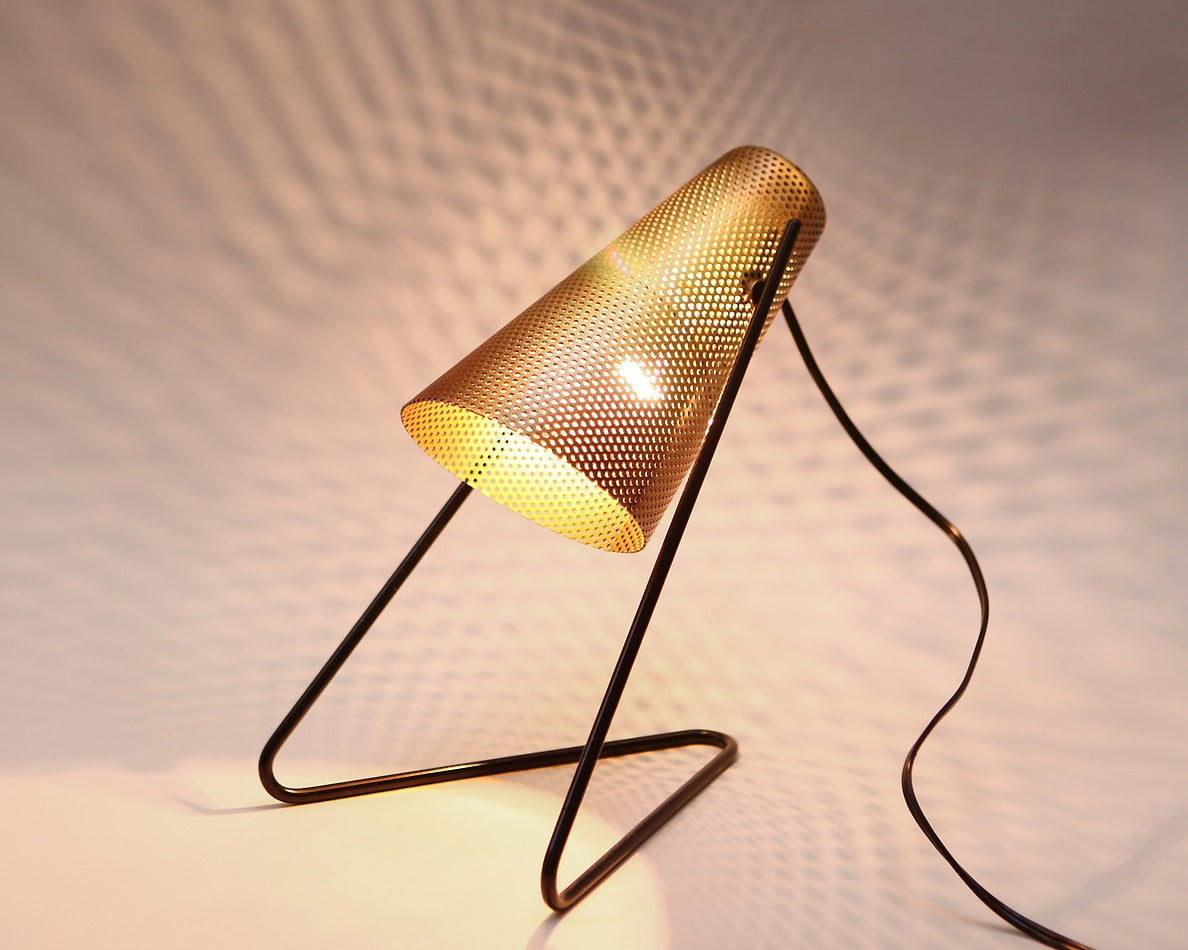 LAを拠点にデザイン活動をする「commune(コミューン)」と「Atelier de Troupe(アトリエ・ド・トループ)」との共作による照明器具「V-LITE(Vライト)」です。置き方によって、テーブルランプとしても、またウォールランプとしても使える照明器具です。ランプを灯すとパンチングメタルのシェードを通して、リズミカルな影を生み出し、まるでアトリエやホテルの一室のような雰囲気を楽しめます。「Atelier de Troupe(アトリエ・ド・トループ)」はLAを拠点とするデザイン集団「commune(コミューン)」の依頼で「ACE HOTEL(エース・ホテル)」の照明を手掛けたことで、現在世界的に注目されているデザインスタジオです。このV-LITEは「Atelier de Troupe」がLAの工房で全てを手作業で作り上げています。人の手で作られた独特の暖かみのある仕上がりがお部屋をより暖かみのある空間へを変えてくれます。商品には壁付け用の真鍮無垢のボールフックが付属し、そのフックを壁に取り付けV-LITEを掛けることで壁面照明にもなります。