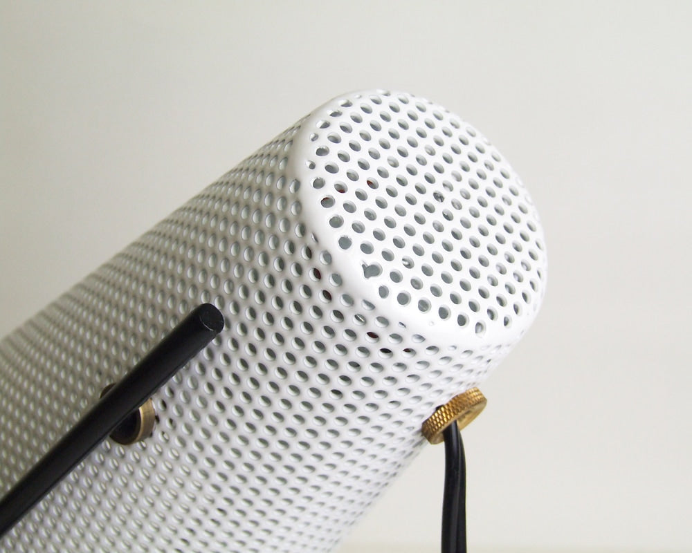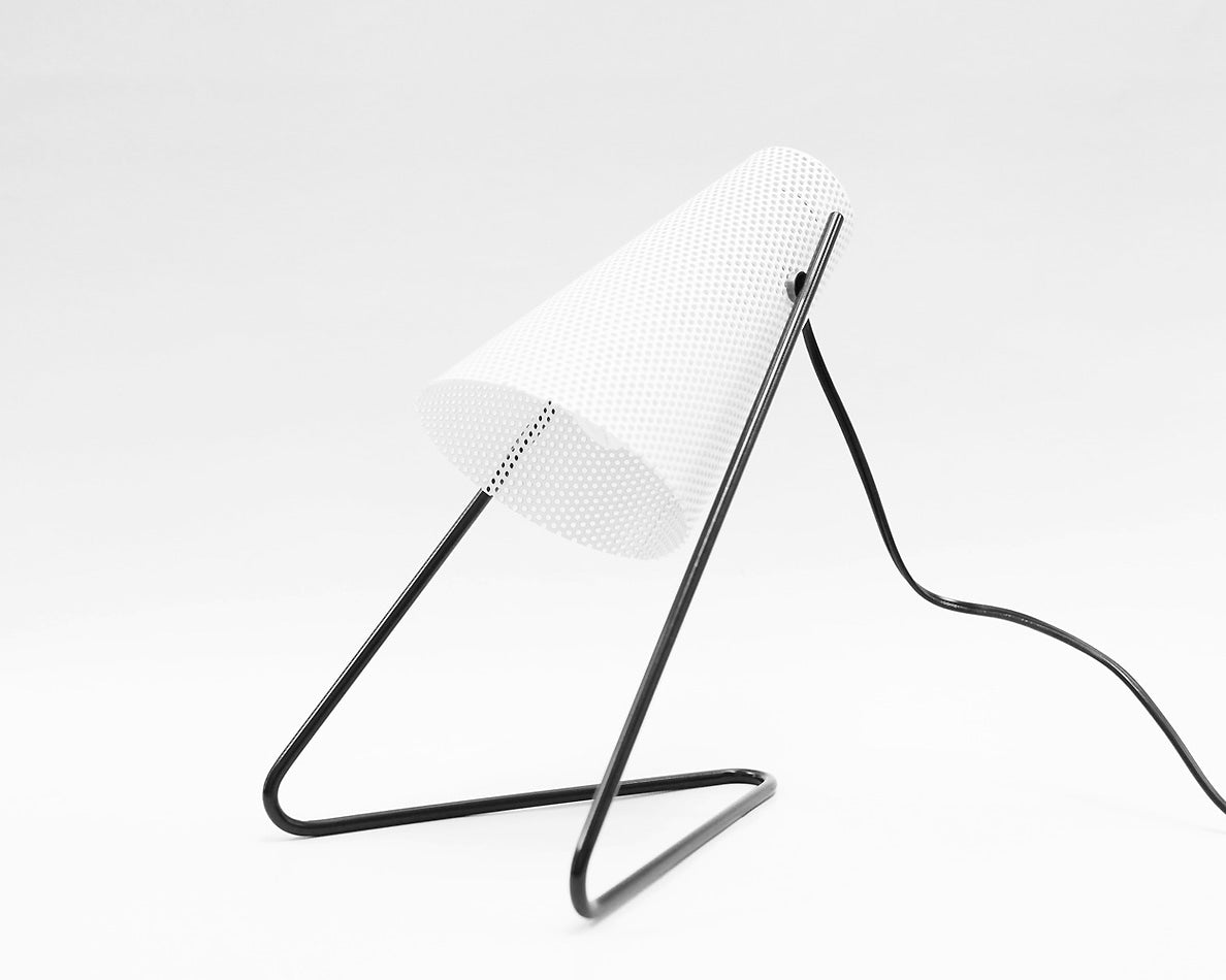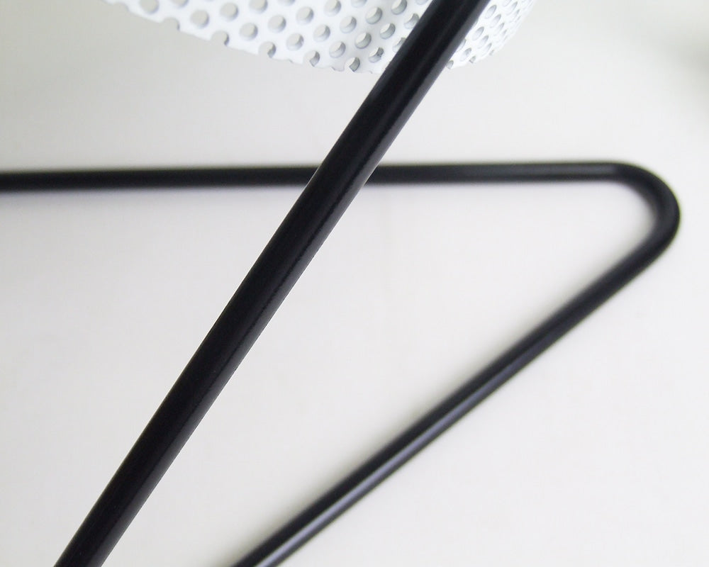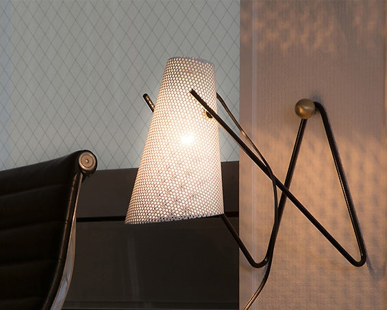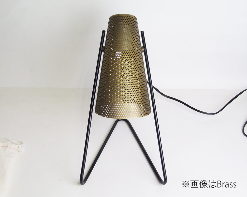 LAを拠点にデザイン活動をする「commune(コミューン)」と「Atelier de Troupe(アトリエ・ド・トループ)」との共作による照明器具「V-LITE(Vライト)」です。置き方によって、テーブルランプとしても、またウォールランプとしても使える照明器具です。ランプを灯すとパンチングメタルのシェードを通して、リズミカルな影を生み出し、まるでアトリエやホテルの一室のような雰囲気を楽しめます。「Atelier de Troupe(アトリエ・ド・トループ)」はLAを拠点とするデザイン集団「commune(コミューン)」の依頼で「ACE HOTEL(エース・ホテル)」の照明を手掛けたことで、現在世界的に注目されているデザインスタジオです。このV-LITEは「Atelier de Troupe」がLAの工房で全てを手作業で作り上げています。人の手で作られた独特の暖かみのある仕上がりがお部屋をより暖かみのある空間へを変えてくれます。商品には壁付け用の真鍮無垢のボールフックが付属し、そのフックを壁に取り付けV-LITEを掛けることで壁面照明にもなります。