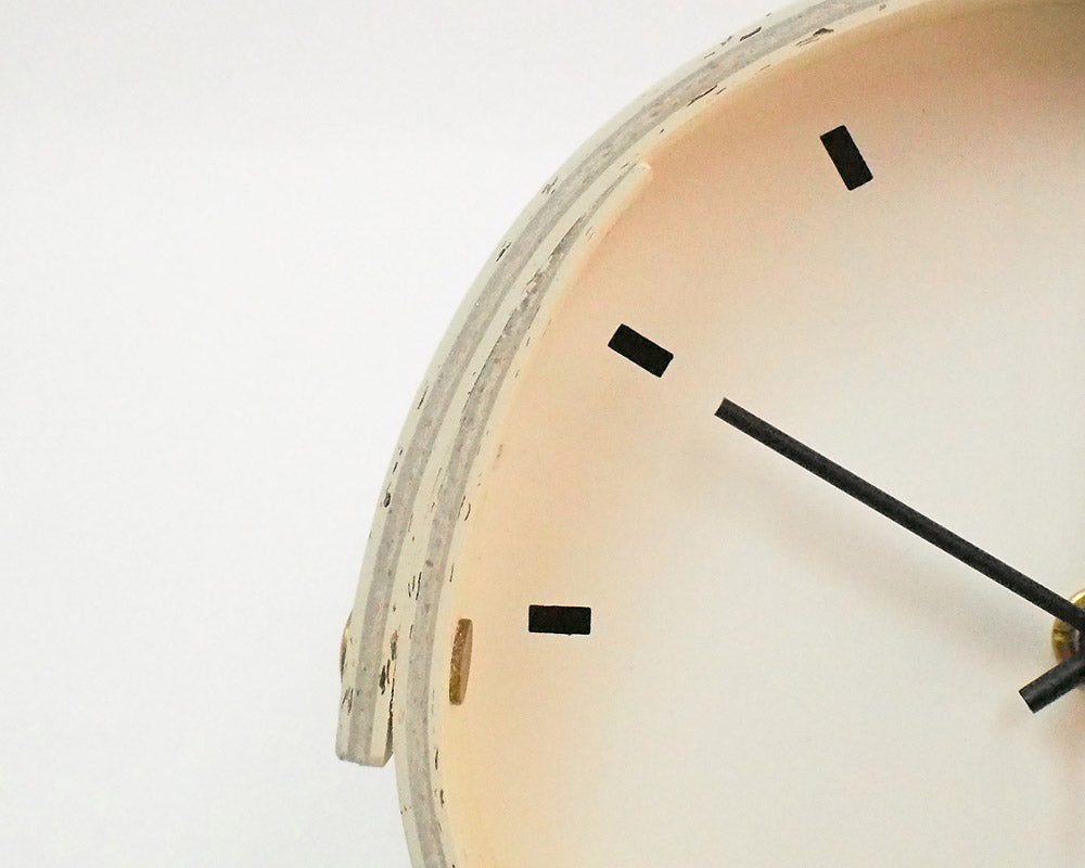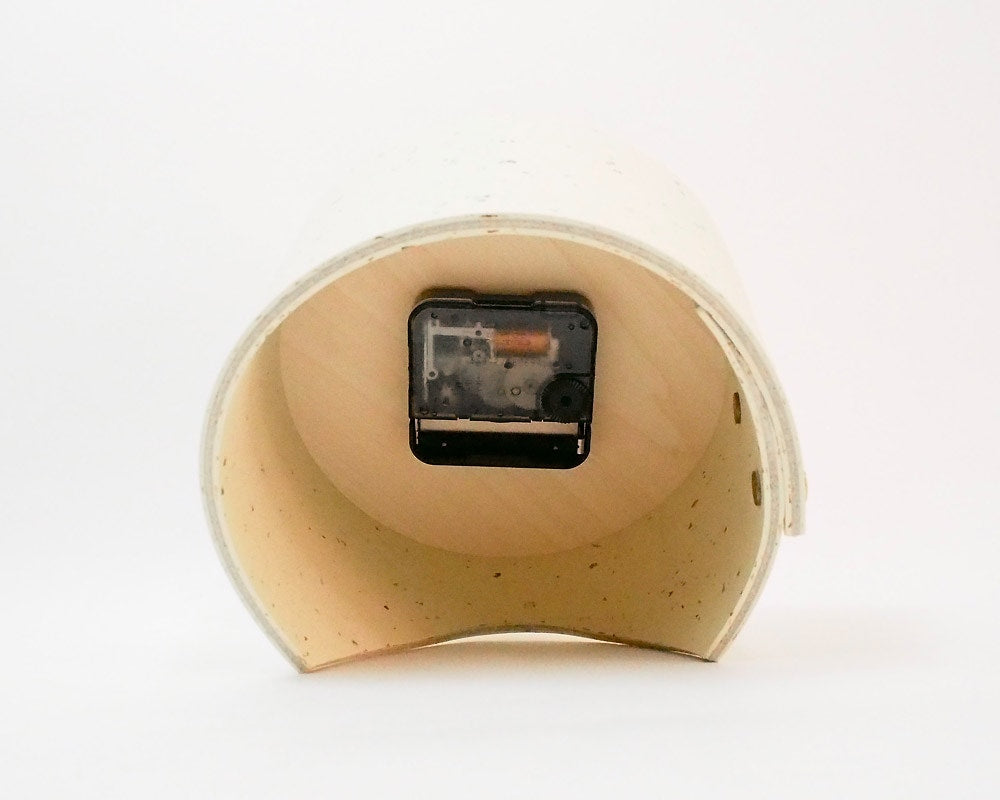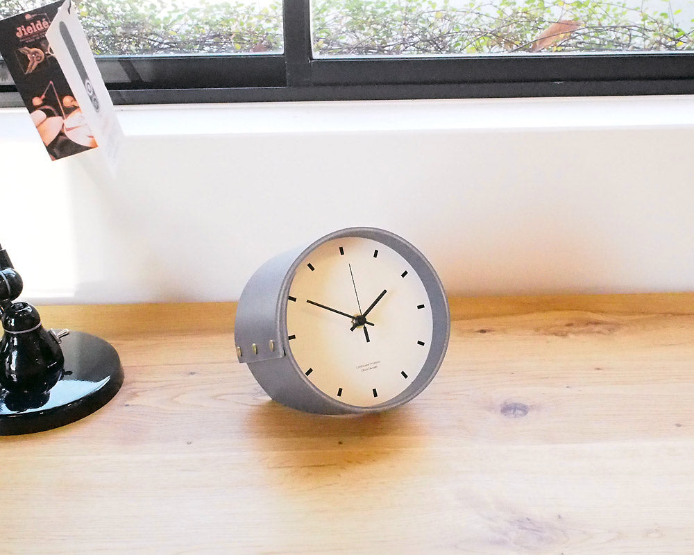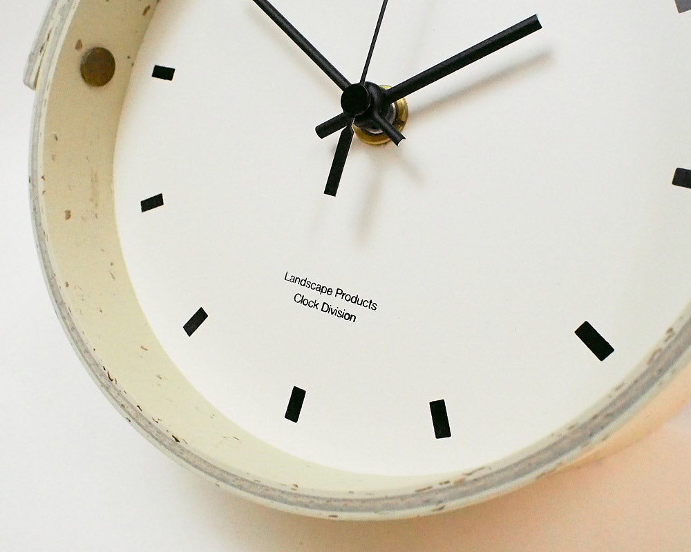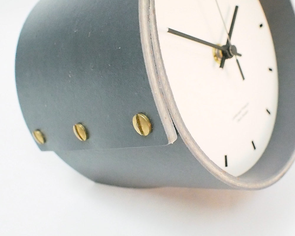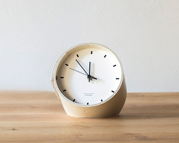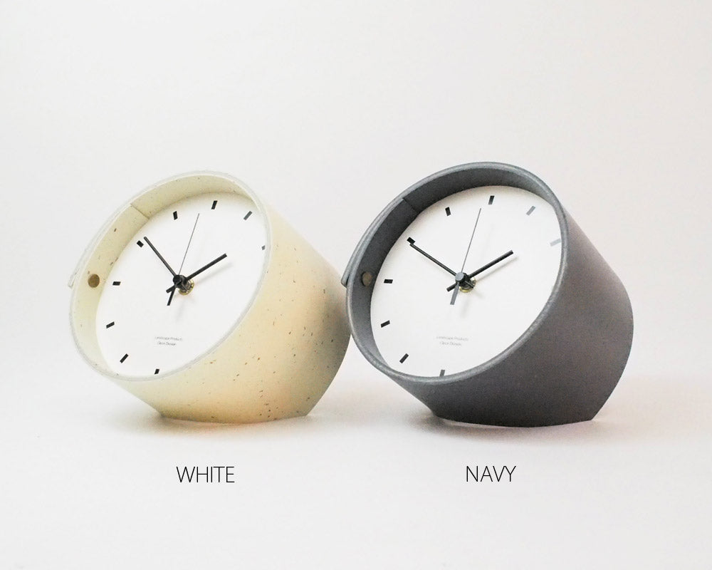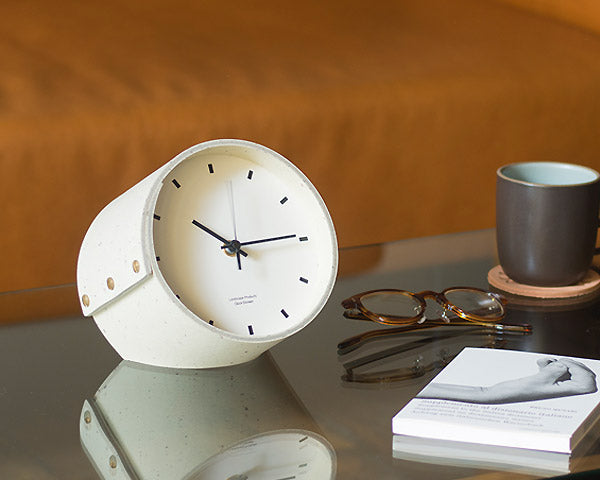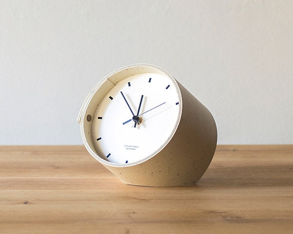 Landscape Products/ランドスケーププロダクツのマーモリウムシリーズのデスククロックです。 Alvar Aalto/アルバー・アアルトやMagnus Olesen/マグナス・オルセンをはじめ世界中の様々なデザイナーに使用されたことで知られる天然素材のリノリウム。その一種で床材でもあるマーモリウムの可塑性に着目したプロダクトシリーズです。 様々なカラーの用意されたマーモリウムは、その経年の変化にも着目してしまう素材です。そんな素材をランドスケーププロダクツの家具へも使用できないかなと、資料を見ていたときに、面材でありながら可塑性があり、床から壁に緩やかに立ち上げたり、曲面成形ができるその素材の持つ素晴しい特性に着目しました。 今回使用したマーモリウムはリノリウムの床用の素材で、チョコレートの製造時に残ったカカオ豆の粉砕した殻を素材へ加えたグラフィカルな表情が特徴です。 シンプルな文字盤に、マーモリウムの筒型を締め成形をしています。デスクやサイドテーブル、キャビネットなどの上に程よいサイズ感です。