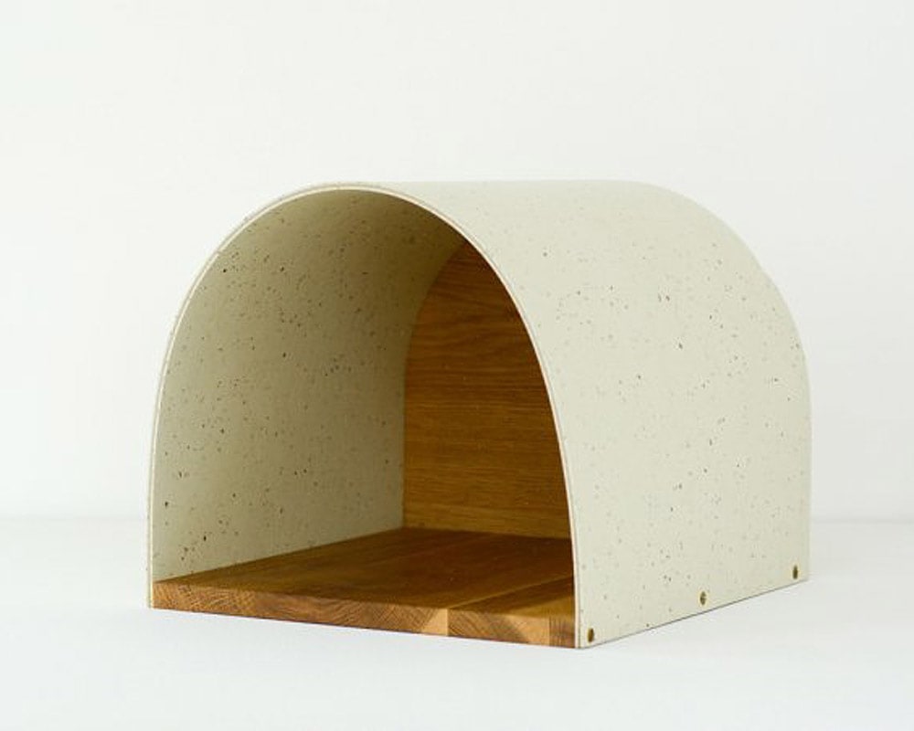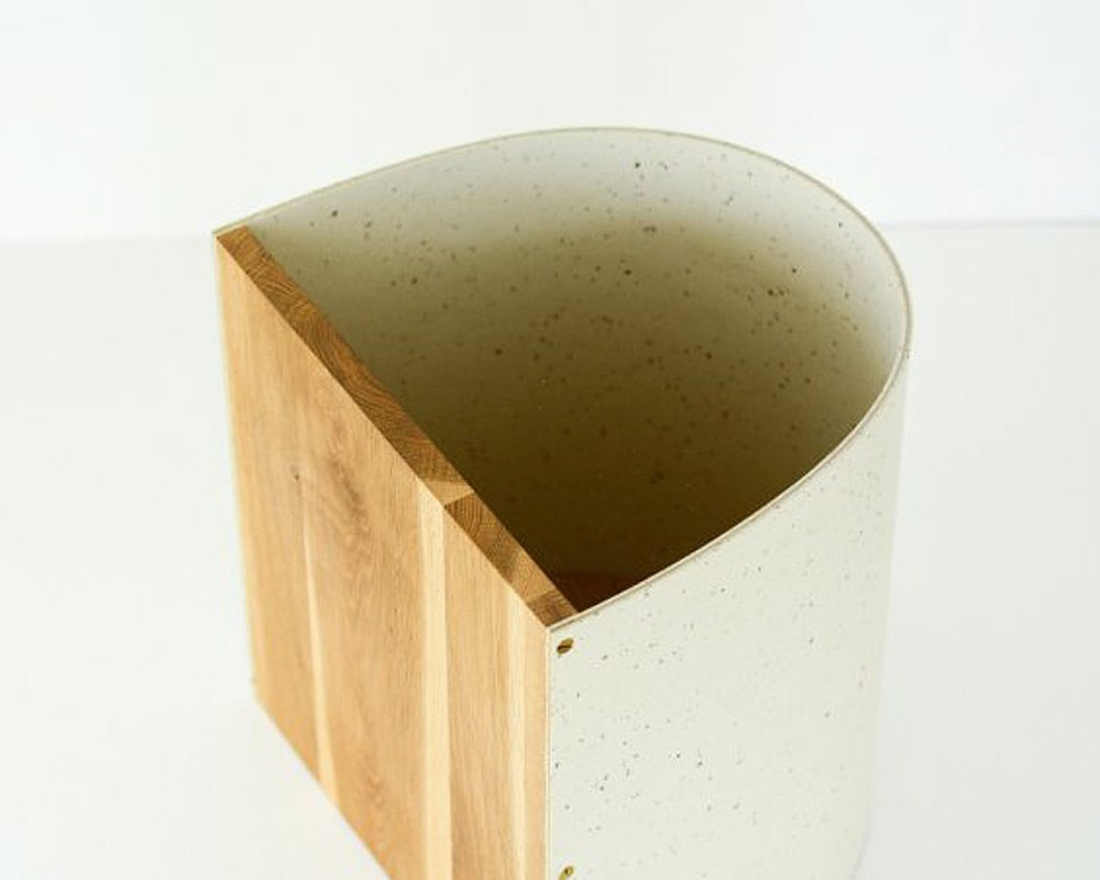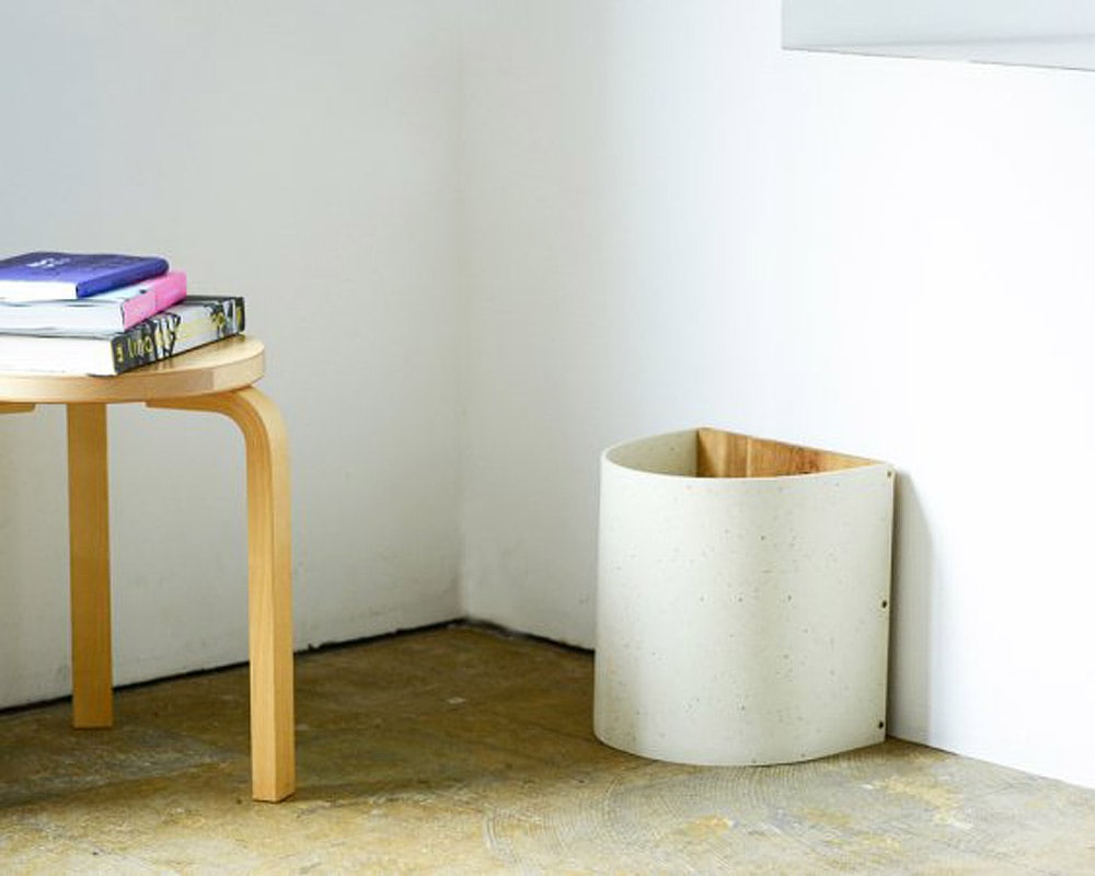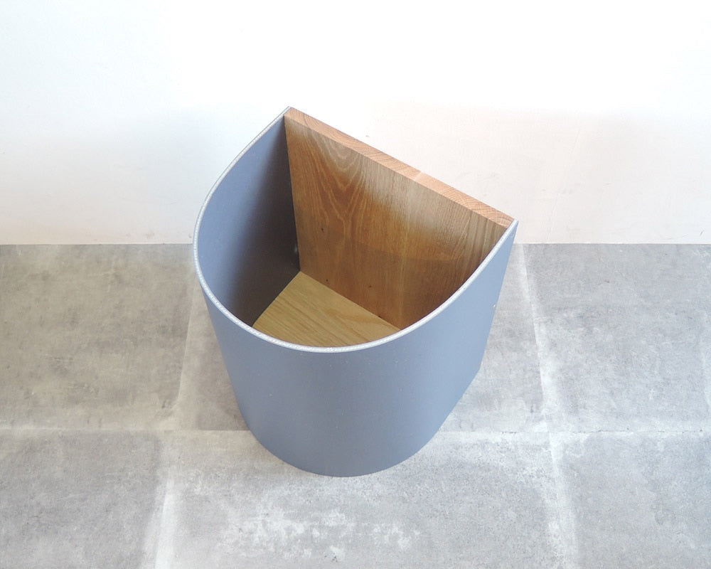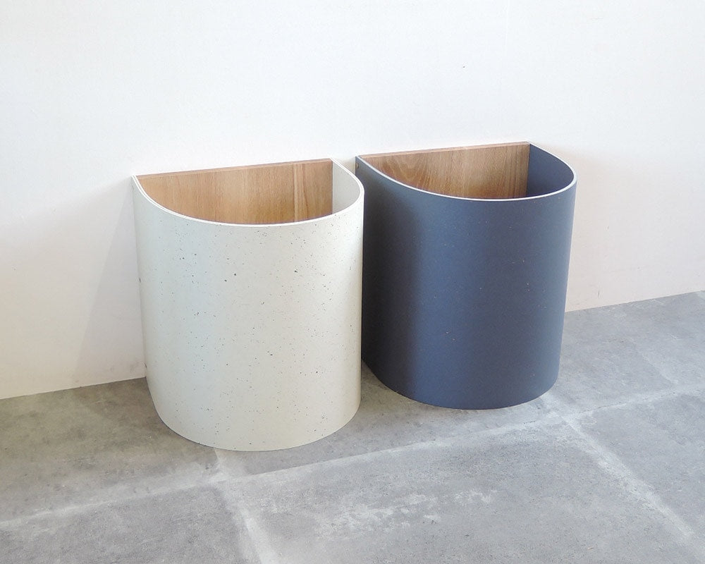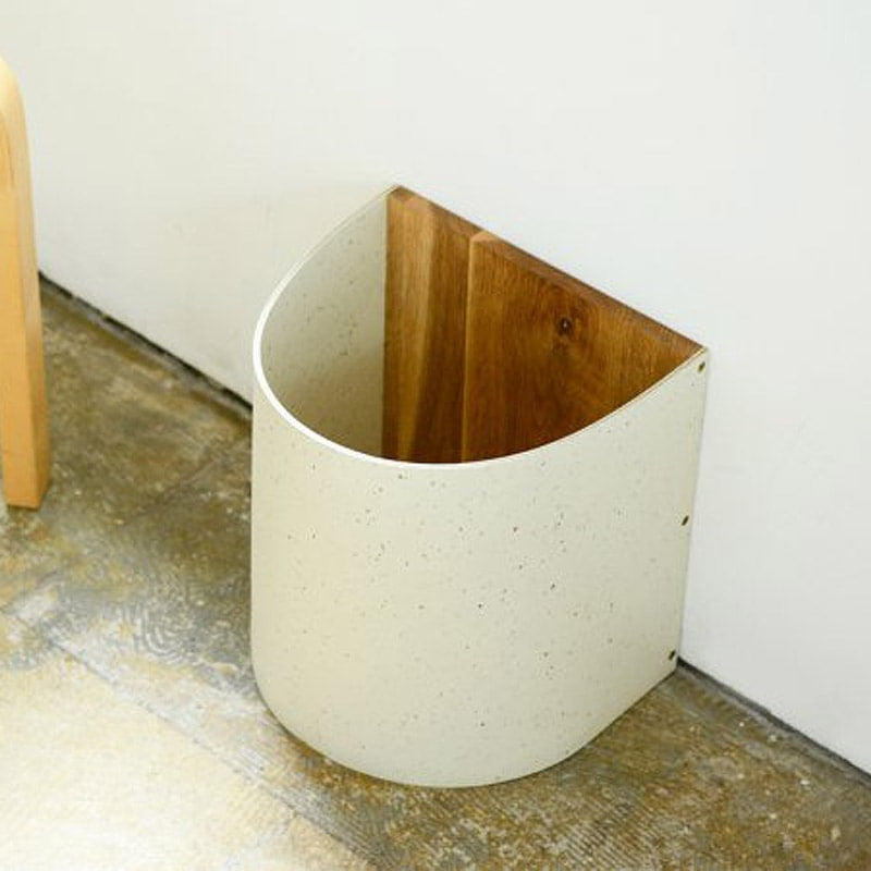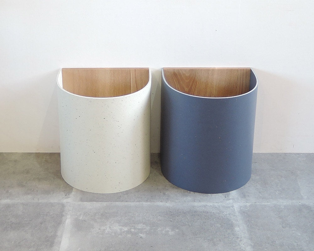 Landscape Products/ランドスケーププロダクツのマーモリウムシリーズのコンテナ/収納ボックス、ゴミ箱です。 Alvar Aalto/アルバー・アアルトやMagnus Olesen/マグナス・オルセンをはじめ世界中の様々なデザイナーに使用されたことで知られる天然素材のリノリウム。その一種で床材でもあるマーモリウムの可塑性に着目したプロダクトシリーズです。 様々なカラーの用意されたマーモリウムは、その経年の変化にも着目してしまう素材です。そんな素材をランドスケーププロダクツの家具へも使用できないかなと、資料を見ていたときに、面材でありながら可塑性があり、床から壁に緩やかに立ち上げたり、曲面成形ができるその素材の持つ素晴しい特性に着目しました。 今回使用したマーモリウムはリノリウムの床用の素材で、チョコレートの製造時に残ったカカオ豆の粉砕した殻を素材へ加えたグラフィカルな表情が特徴です。 木板とマーモリウムを筒型に組み合わせたシンプルで小ぶりな造形。 背面がフラットなため壁面に収まりが良いことでスペースを無駄にしないことも特徴の一つとなっています。 くず入れや小物の収納など様々な使い方をお楽しみください。