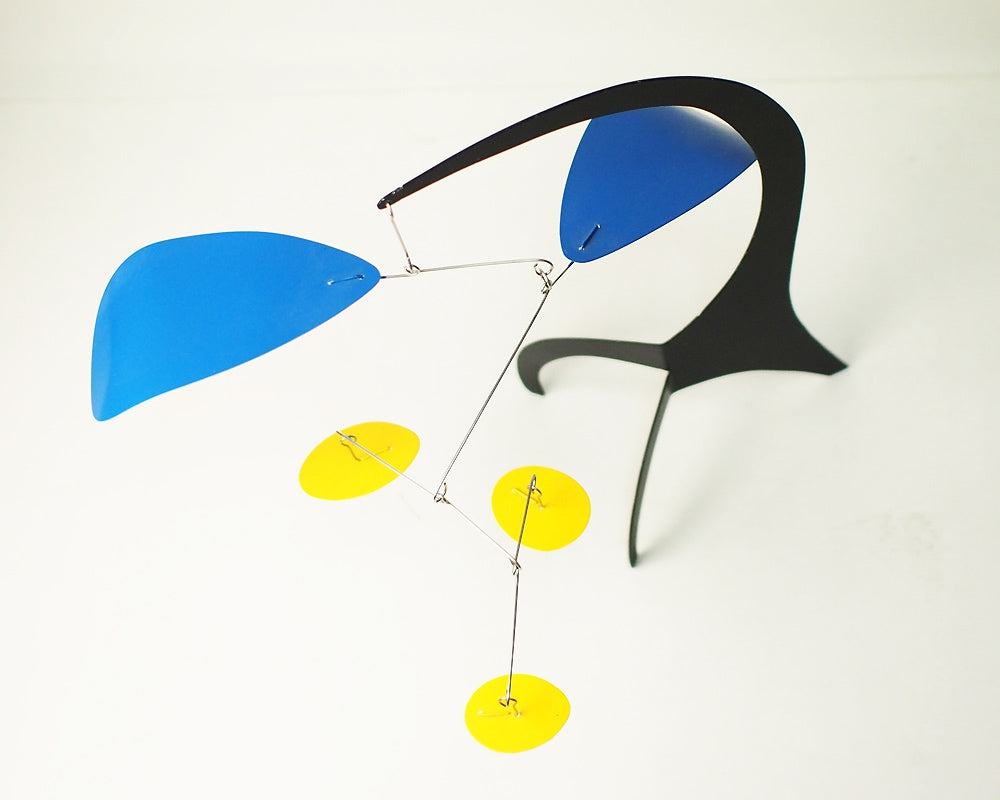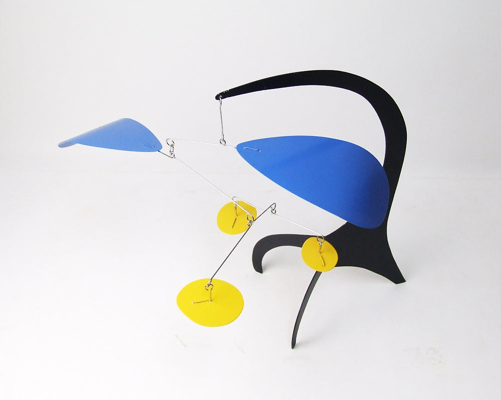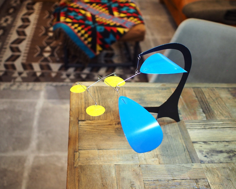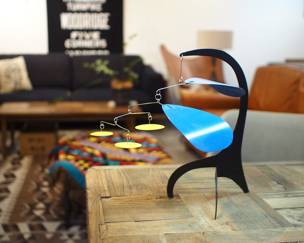 Dave Vande Vusse(デイブ・バンデ・ヴ−ス)のハンドメイドで作られるスタンディングモビールです。モビールといえばつり下げるハンギングモビールが主流ですが、この商品はデスクやテーブルの上に置くことの出来る、置き型のモダンなモビールです。デイブ・バンデ・ヴ−スはアレキサンダー・カルダーにインスパイアされ、アメリカ・ミシガン州で40年もの間、モビールを作り続けています。彼は熟練した技術をもって、空気の微妙な流れにより、不規則に旋回する美しいモビールをハンドメイドで製作しています。このデスクトップサイズは、小ぶりでデスクやテーブル上を飾るのに最適で、僅かな風によって動く様はお部屋のモダンなオブジェになってくれます。