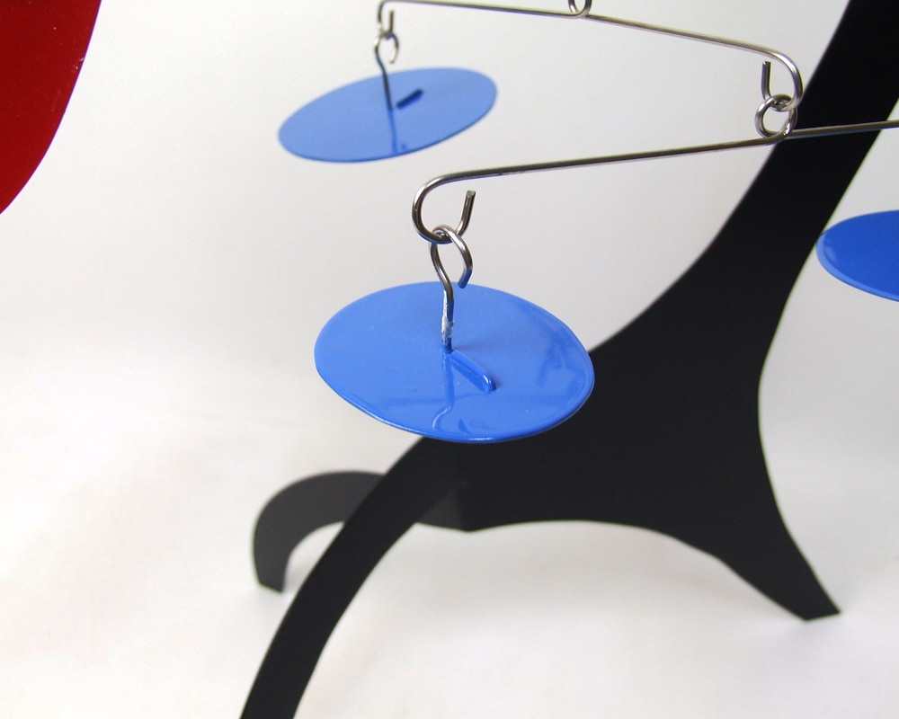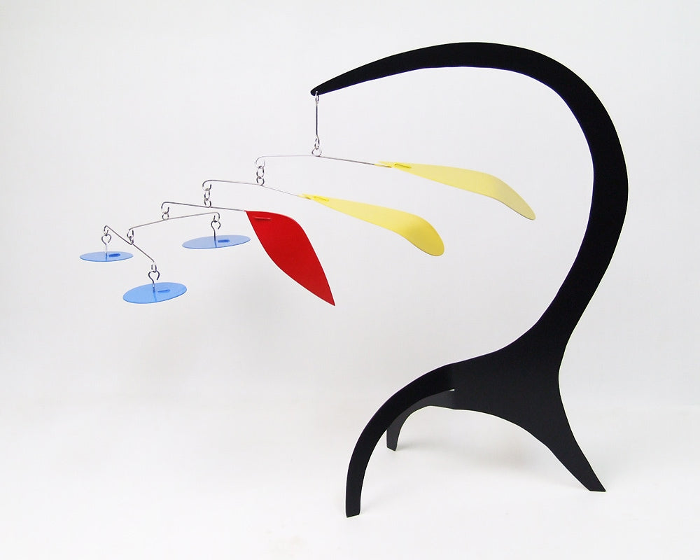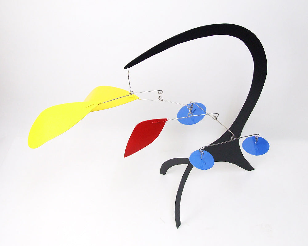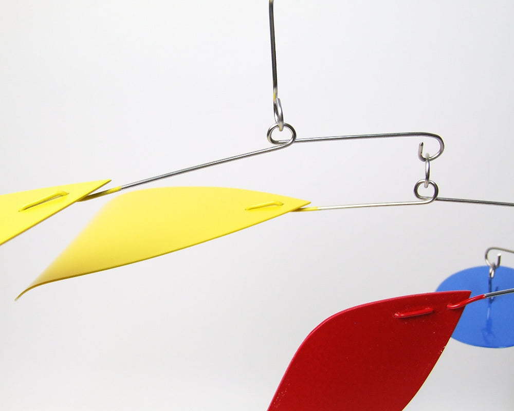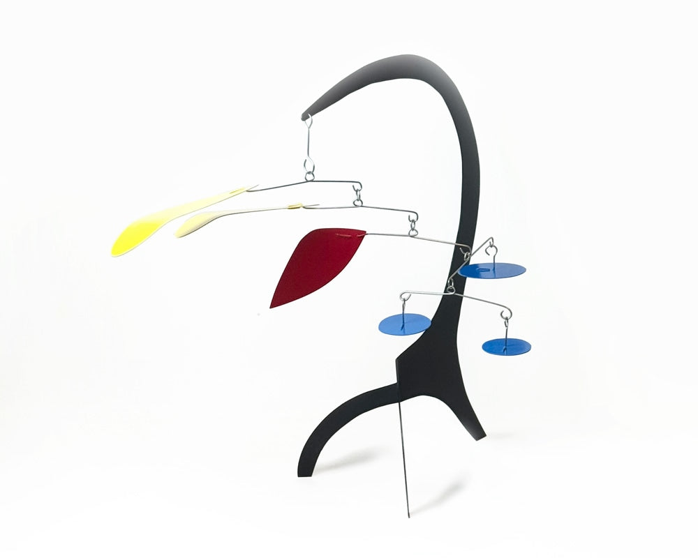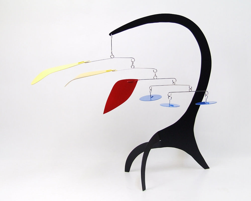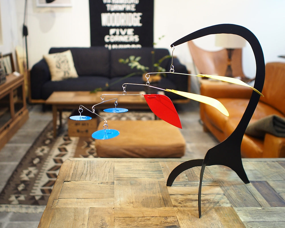 Dave Vande Vusse(デイブ・バンデ・ヴ−ス)のハンドメイドで作られるスタンディングモビールです。モビールといえばつり下げるハンギングモビールが主流ですが、この商品はデスクやテーブルの上に置くことの出来る、置き型のモダンなモビールです。デイブ・バンデ・ヴ−スはアレキサンダー・カルダーにインスパイアされ、アメリカ・ミシガン州で40年もの間、モビールを作り続けています。彼は熟練した技術をもって、空気の微妙な流れにより、不規則に旋回する美しいモビールをハンドメイドで製作しています。このミディアムサイズは存在感があるサイズで、キャビネット上やシェルフ上などを飾るのに最適で、僅かな風によって動く様はお部屋のモダンなオブジェになってくれます。