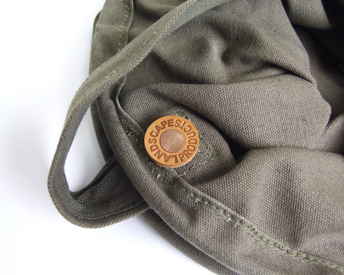 Landscape ProductsのPlaymountain morningシリーズの丈夫なキャンバスで作られたキャンバスバケットです。 ミリタリー規格でも使用されるウォーターバケットを、キャンバスバケットとしてリリースしています。 水を運べる他に工具やプランター代わりに活用できるユーティリティに優れた一品です。 非常に丈夫なコットンを使用したキャンバス生地で仕立てられており、使用しない時は小さく折り畳むことが可能。 前面には「Playmountain morning:PMM」のプリントに、ハンドル取り付け部には「Landscape Products」の革パッチに銅リベットを1点1点手作業で取り付けられ、細部までこだわりを感じる仕上がりです。 「Play mountain morning」とはスタイリスト作原文子さんのプロジェクト:マウンテンモーニングとLandscape Productsのアンテナショップ「Playmountain」との共作のアイテムです。 お部屋で小物の収納やプランターカバー、ランドリーでのピンチ入れ、アウトドアでとアイデア次第で様々な用途で使用できます。