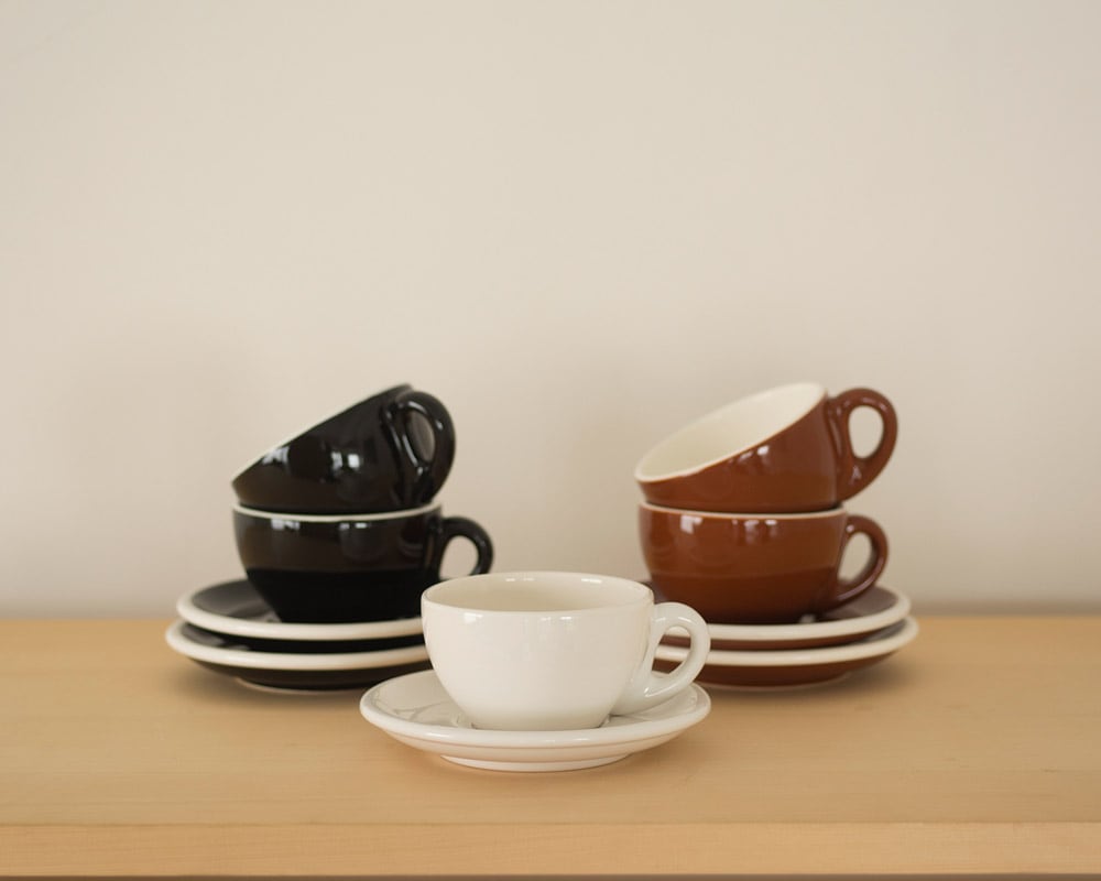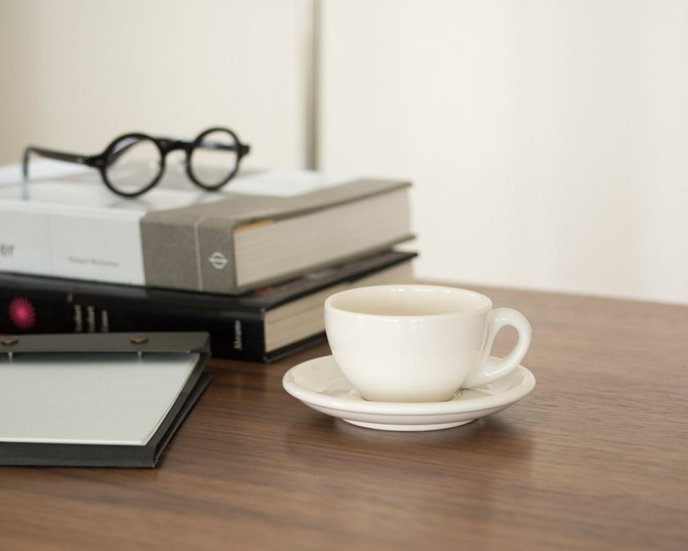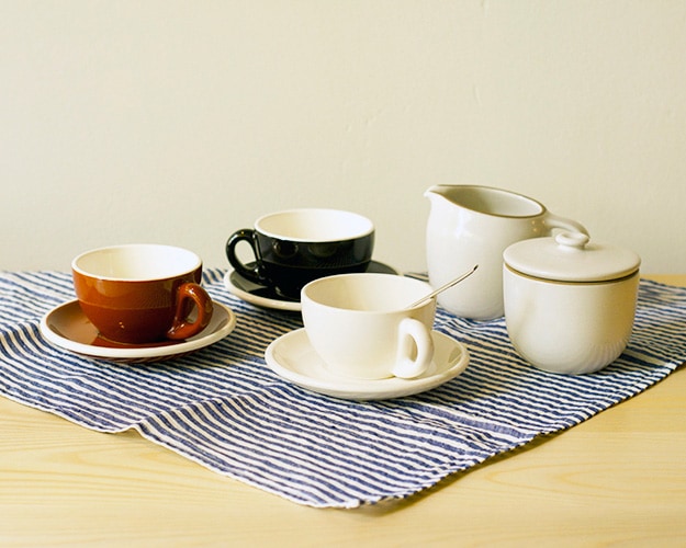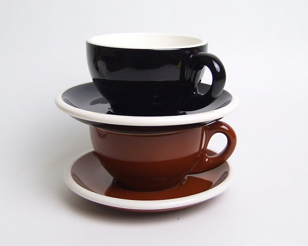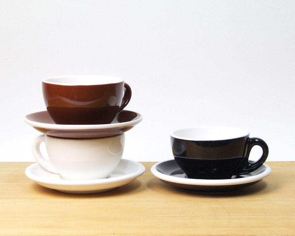 ランドスケーププロダクツ(Landscape products)のオリジナルカップ&ソーサーです。 惜しまれつつも生産終了となった、イタリアのF.A.C.社のACFカップ&ソーサーを思わせるたっぷりとしたボディとハンドルのフォルムと、クラシックな雰囲気のカラーリングが特徴。 寒い季節に、たっぷりの砂糖とミルクを入れたコーヒーをスプーンでカチャカチャと混ぜながらおしゃべりが弾む、 そんな風景が似合うコーヒーカップです。 クラフトの一個箱入りなのでギフト・ノベルティーにもおすすめです。 しっかりと肉厚もあり丈夫なので、カフェやレストランへのヘヴィーユースにも最適です。