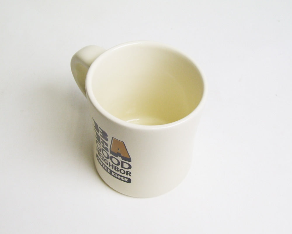 Landscape products(ランドスケーププロダクツ)のスタンドコーヒーショップ 「BE A GOOD NEIGHBOR COFFEE KIOSK」のオリジナルマグカップです。 アメリカのサードウェーブのコーヒースタンドでも主流になりつつある、大きめなサイズのUSAらしいダイナーマグです。 たっぷりのコーヒーを楽しむのに程良い大きめのサイズと、ぽってりとした肉厚で愛嬌のあるシェイプが印象的で、Made in Japan の質実剛健の造りも魅力です。 正面にはイラストレーターNoritake(ノリタケ)氏のイラスト、背面にはBE A GOOD NEIGHBOR COFFEE KIOSKのロゴがプリントされています。