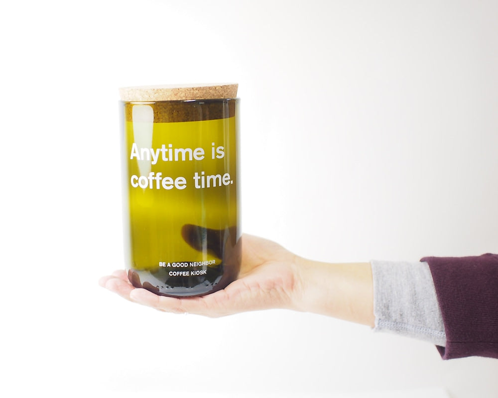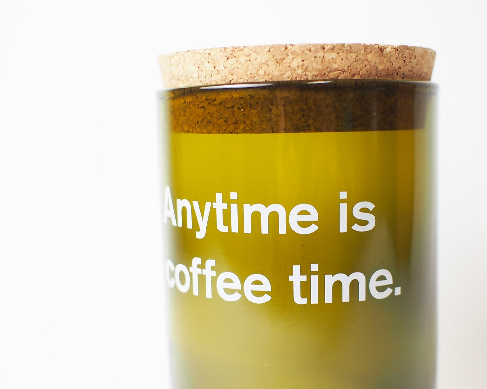 Landscape products(ランドスケーププロダクツ)のスタンドコーヒーショップ 「BE A GOOD NEIGHBOR COFFEE KIOSK」のオリジナルキャニスターです。 本体には通常の物より大きめのWine Punts/ワインプンツを使用し、正面には「Anytime is coffee time」のメッセージをプリント、ぽってりとしたフォルムが可愛らしくLandscape Productsらしいセンスを感じるキャニスターです。 ワインプンツとはコロラド州スプリングス使い終わったワインボトルをカットしてハンドメイドで作られた100%リサイクルのグラスで、ワインボトルのため底部に特徴があります。 その本体には密閉性の高いコルク蓋をつけ、BE A GOOD NEIGHBOR COFFEE KIOSK では、コーヒー豆を入れるキャニスターとして使用しています。 キッチンなどに並べておくだけでも絵になるこのキャニスターは、コーヒー豆以外にも様々な商品の収納などにお使いいただけます。