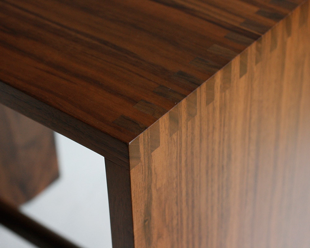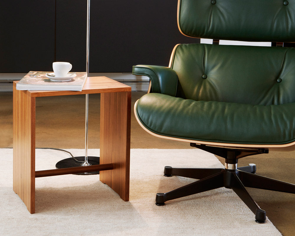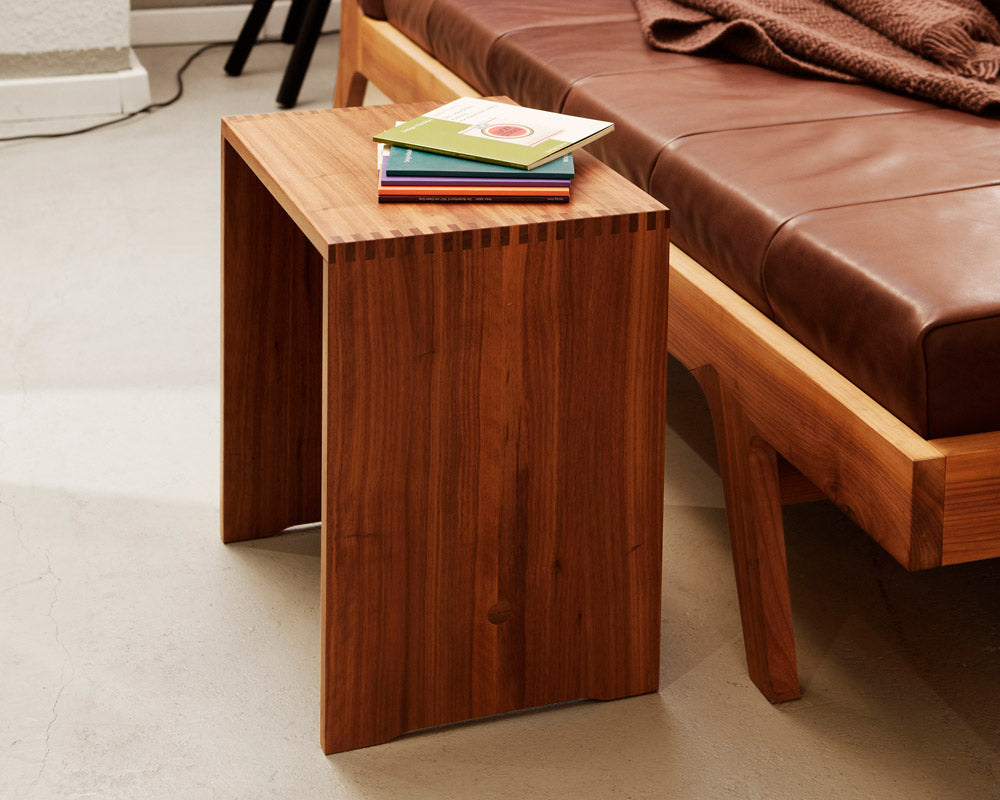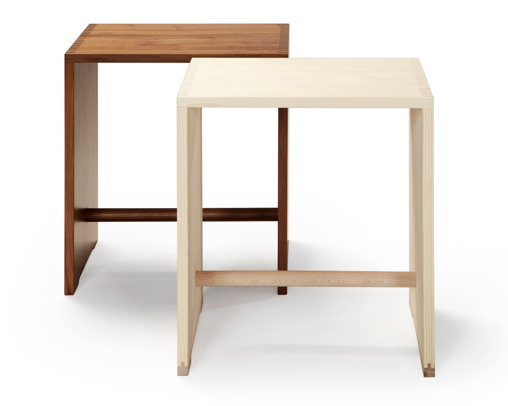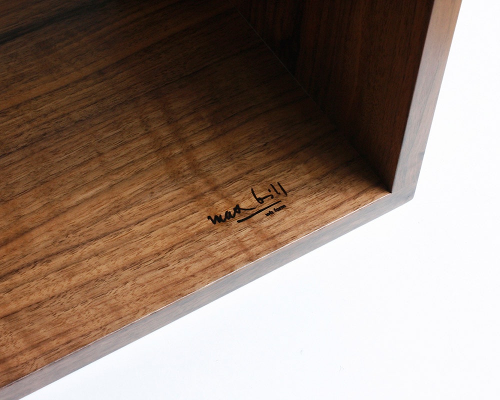 Max Bill (マックス・ビル)デザインのUlm Stool (ウルムスツール)のウォールナット仕様です。1953年、旧西ドイツのウルムに開設された「ウルム造形大学」は、バウハウスの理念を継承する革新的な教育機関でした。その初代学長をつとめたマックス・ビルが、学生達のために1954年にデザインした多目的スツールです。ワークテーブルや講義、カフェテラスなどに使えるスツール、サイドテーブル、持ち歩きやすい機能に、書籍をのせるトレイとしての機能など、多目的な要素をデザインに集約し「ウルムスツール」は誕生ました。当時のウルム造形大学では、それらの機能通り、椅子としてはもちろんサイドデスクや踏み台、また横向きにしてラック、さらに逆さまにして教科書の持ち運びなど幅広い場所で使用されていました。耐久性と使い心地を両立させたこの「ウルムスツール」クギを一切使わない木組み工法で作られています。「組継ぎ」「相互矧(は)ぎ」「くさび細継ぎ」と様々な技法が使われています。無塗装の通常モデルやカラーモデルとは異なり、このモデルはすべてのパーツがウォルナットで製造されています。表面はクリアのウレタンで仕上げられ、高級感のある美しい仕上がりです。無駄を極限までそぎ落としたミニマルなデザインは、バウハウスの概念をそのまま受け継いだ象徴的スツールといわれています。