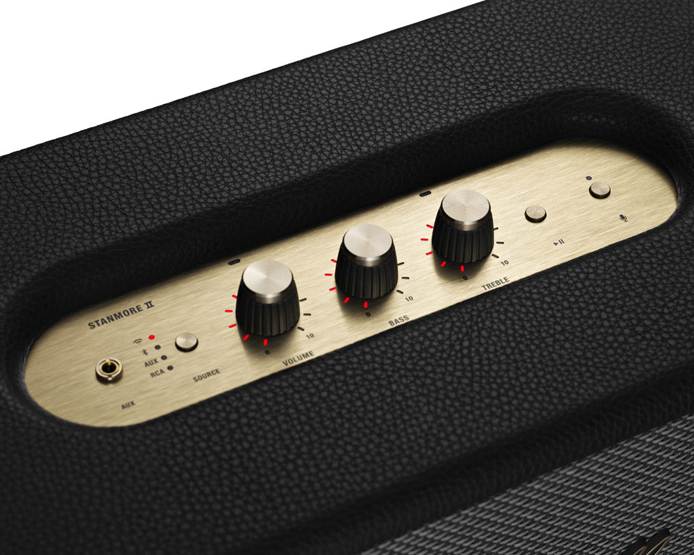 そのサイズからは信じられないサウンドが放たれる。「Stanmore2 BT」はラウドで、しかも正確な音を生み出すアクティブなステレオスピーカーです。そのクラシックなデザインは、ロックンロールの黄金時代に後押しされ、マーシャルアンプ伝統のインタラクション・ノブが今日までその歴史を刻んでいます。「Stanmore2 BT」には、環境への配慮によって使用していないときは消費電力を最小限に抑える2つのスタンバイモードが内臓されています。古典的なマーシャルデザイン Stanmore BTは古典的なマーシャルデザインが特徴です。ヴィンテージのフロントフレットや真鍮ディティール、そしてマーシャルのアイコンであるスクリプトロゴはマーシャルそのものです。BLUETOOTH Bluetooth対応のスマートフォン、タブレット、またはコンピュータを使用して、ワイヤレスで直接音楽をストリーミング再生することが可能です。3.5mm入力用ダブルエンドコイルケーブル ロックンロール黄金時代のエレキギターコードにインスパイアされた3.5mmプラグ付きダブルコイル・ステレオケーブルは、Bluetooth?非対応の音楽デバイも素晴らしいサウンドの世界へ導いてくれます。RCA インプット 「Stanmore2 BT」は 、CDプレーヤーやターンテーブル(RIAA付)などBluetooth非対応のアナログ機器をRCA入力で接続して楽しむことができます。