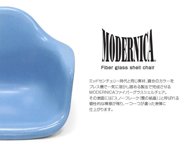 かつてチャールズ・イームズがデザインした「FRP(ガラス繊維強化プラスチック)」を使用したミッドセンチュリーを代表するプロダクト「シェルチェア」。そのオリジナルのアームシェルチェアを完璧とも言える生産手法により現代へと蘇らせた「モダニカ」の「ファイバーグラスアームシェルチェア」です。 イームズの代表作でもある「シェルチェア」は、当時開発されたばかりのFRPを使うことで、自由な曲面を製作することができるようになり、高い耐久性と量産性を兼ね備えたこと、用途に応じたさまざまな脚を組み合わせることでできるなど、他には類を見ない発想で20世紀を代表する名作となりました。「モダニカファイバーグラスシェルチェア」は、その「シェルチェア」の生産を1950年代当時から請け負っていた「Zenith(ゼニス)社」の金型や機械を買い取り、当時のままの世界唯一の専門機器を使用して、当時のままの生産手法を使い、同社が誇る熟練の職人たちが一つ一つ手作業で作られています。 現在生産される「シェルチェア」の中で、最も当時のオリジナルに近い製品であることに間違いはありません。 豊富なカラーのシェル/座面と、約20種類にも及ぶ様々なベース/脚を組み合わせることで、ダイニング、リビング、カウンター、書斎など、どんなシーンやライフスタイルにも合わせてお使いいただけます。(ベースの種類は「ベース(脚部)一覧」をクリックしてご確認いただけます。代表(基本)価格は、エッフェルベースまたはローロッドベース付きの価格です)
