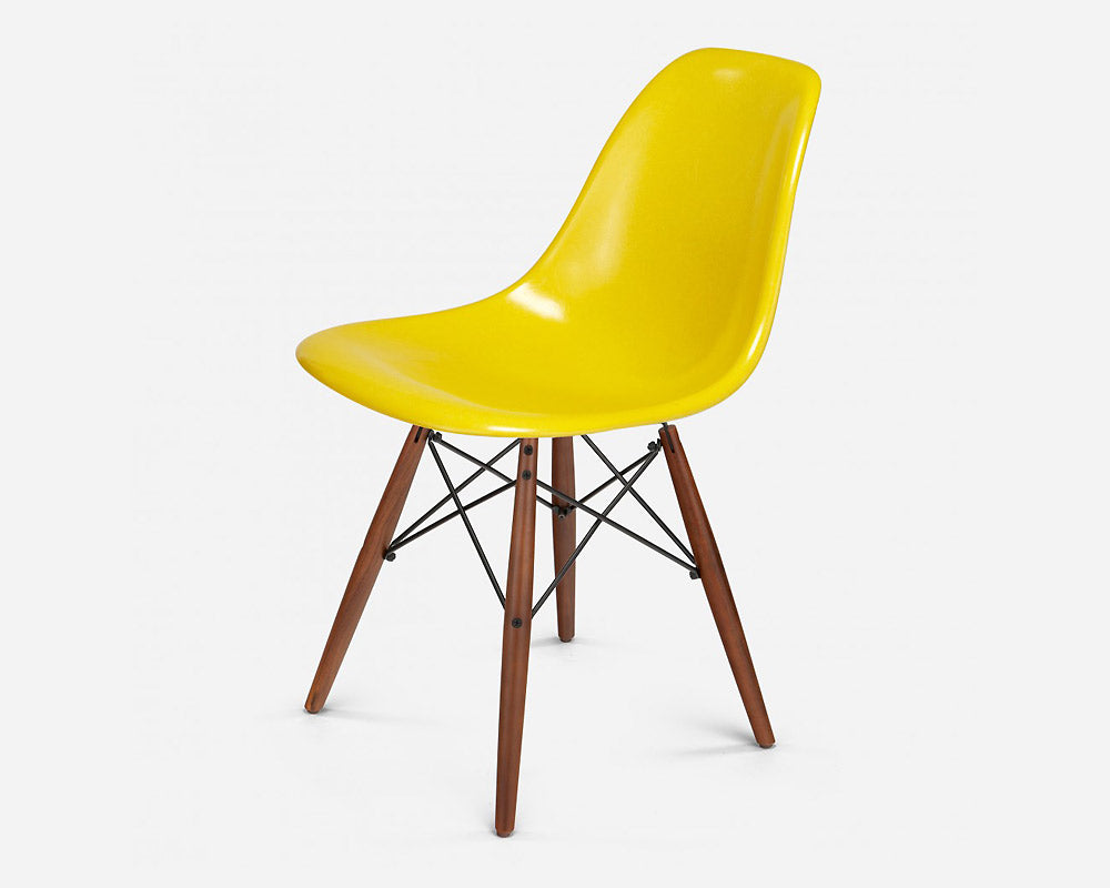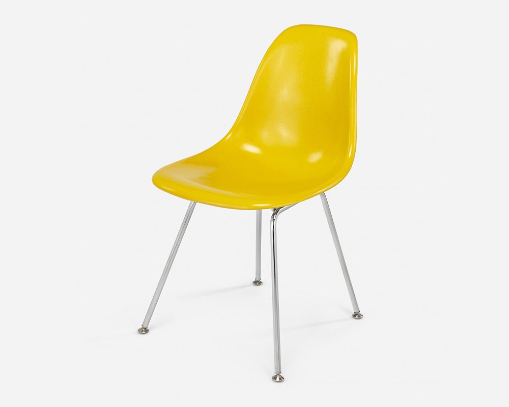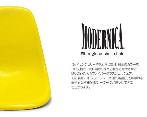 かつてチャールズ・イームズがデザインした「FRP(ガラス繊維強化プラスチック)」を使用したミッドセンチュリーを代表するプロダクト「シェルチェア」。そのオリジナルのサイドシェルチェアを完璧とも言える生産手法により現代へと蘇らせた「モダニカ」の「ファイバーグラスサイドシェルチェア」です。 イームズの代表作でもある「シェルチェア」は、当時開発されたばかりのFRPを使うことで、自由な曲面を製作することができるようになり、高い耐久性と量産性を兼ね備えたこと、用途に応じたさまざまな脚を組み合わせることでできるなど、他には類を見ない発想で20世紀を代表する名作となりました。「モダニカファイバーグラスシェルチェア」は、その「シェルチェア」の生産を1950年代当時から請け負っていた「Zenith(ゼニス)社」の金型や機械を買い取り、当時のままの世界唯一の専門機器を使用して、当時のままの生産手法を使い、同社が誇る熟練の職人たちが一つ一つ手作業で作られています。 現在生産される「シェルチェア」の中で、最も当時のオリジナルに近い製品であることに間違いはありません。 豊富なカラーのシェル/座面と、約20種類にも及ぶ様々なベース/脚を組み合わせることで、ダイニング、リビング、カウンター、書斎など、どんなシーンやライフスタイルにも合わせてお使いいただけます。 サンフラワーイエローは太陽に向かって元気に伸びるヒマワリをイメージして作られました。鮮やかでミッドセンチュリーらしいシェルチェアはインテリアのさし色に使え空間を明るくしてくれます。(ベースの種類は「ベース(脚部)一覧」をクリックしてご確認いただけます。代表(基本)価格は、エッフェルベースまたはローロッドベース付きの価格です)