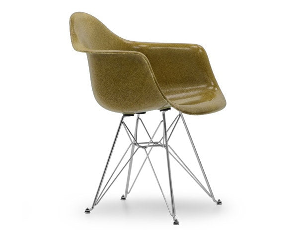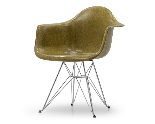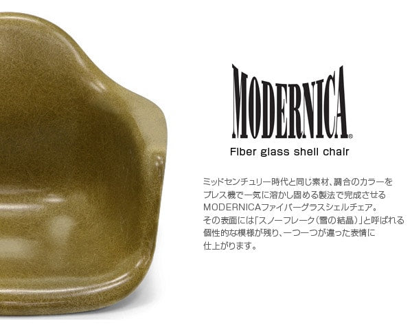 かつてチャールズ・イームズがデザインした「FRP(ガラス繊維強化プラスチック)」を使用したミッドセンチュリーを代表するプロダクト「シェルチェア」。そのオリジナルのアームシェルチェアを完璧とも言える生産手法により現代へと蘇らせた「MODERNICA(モダニカ)」の「ファイバーグラスアームシェルチェア」です。 イームズの代表作でもある「シェルチェア」は、当時開発されたばかりのFRPを使うことで、自由な曲面を製作することができるようになり、高い耐久性と量産性を兼ね備えたこと、用途に応じたさまざまな脚を組み合わせることでできるなど、他には類を見ない発想で20世紀を代表する名作となりました。「モダニカファイバーグラスシェルチェア」は、その「シェルチェア」の生産を1950年代当時から請け負っていた「Zenith(ゼニス)社」の金型や機械を買い取り、当時のままの世界唯一の専門機器を使用して、当時のままの生産手法を使い、同社が誇る熟練の職人たちが一つ一つ手作業で作られています。 現在生産される「シェルチェア」の中で、最も当時のオリジナルに近い製品であることに間違いはありません。 豊富なカラーのシェル/座面と、約20種類にも及ぶ様々なベース/脚を組み合わせることで、ダイニング、リビング、カウンター、書斎など、どんなシーンやライフスタイルにも合わせてお使いいただけます。 オリーブは大人の雰囲気を感じさせる落ち着いたカラーです。何色とも言えない中間色は和洋問わず空間に溶けこんでくれます。ブラック塗装のベースや木製ベース をセットする事でよりヴィンテージ感のある渋い表情へと変わります。(ベースの種類は「ベース(脚部)一覧」をクリックしてご確認いただけます。)