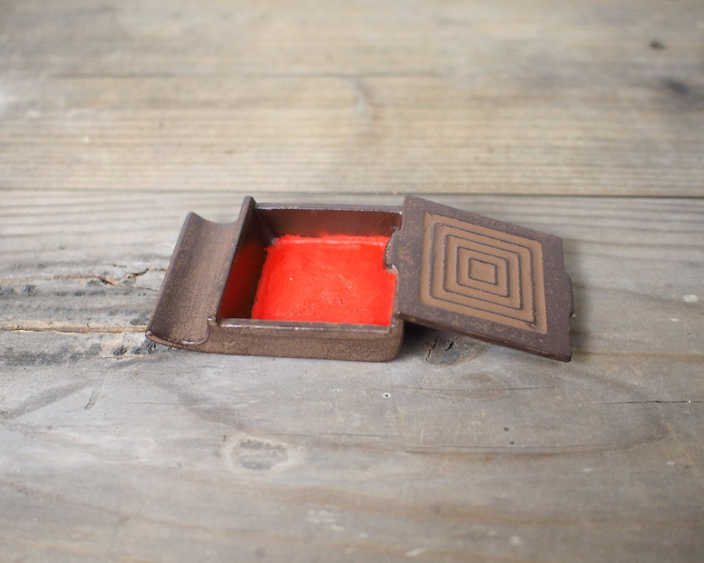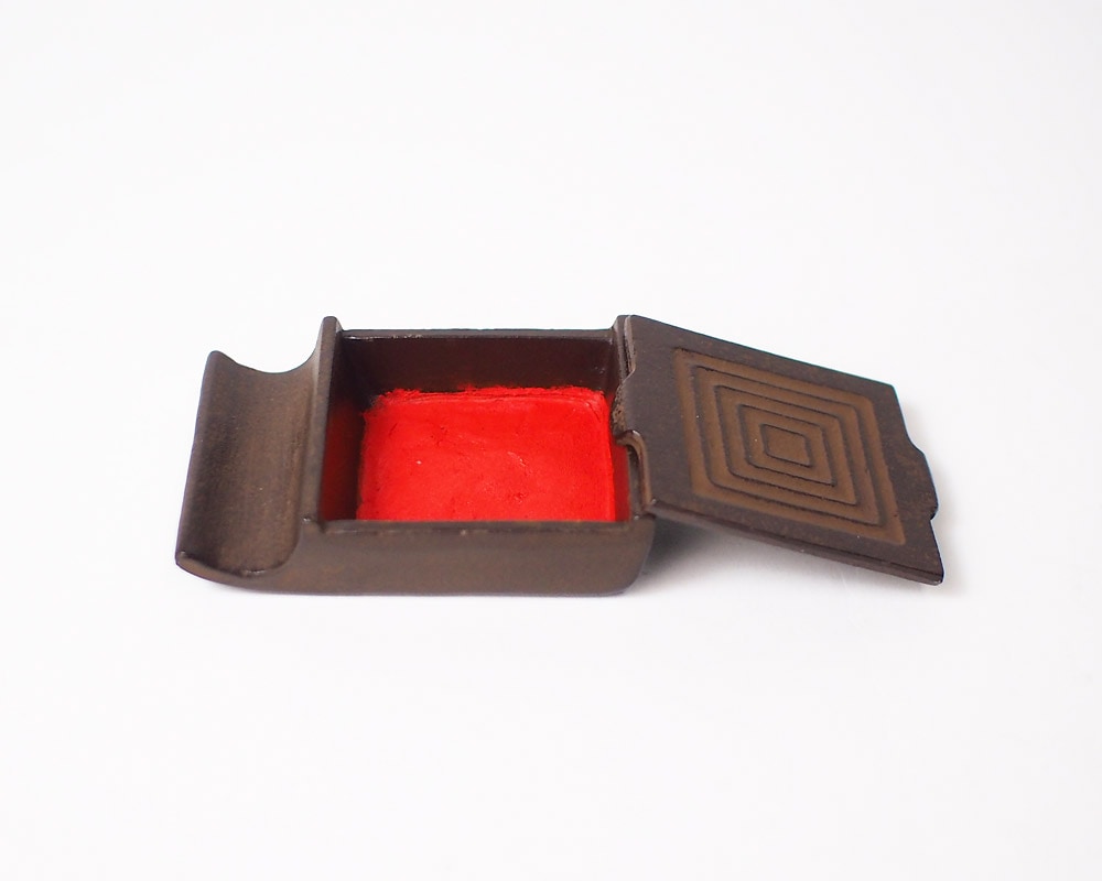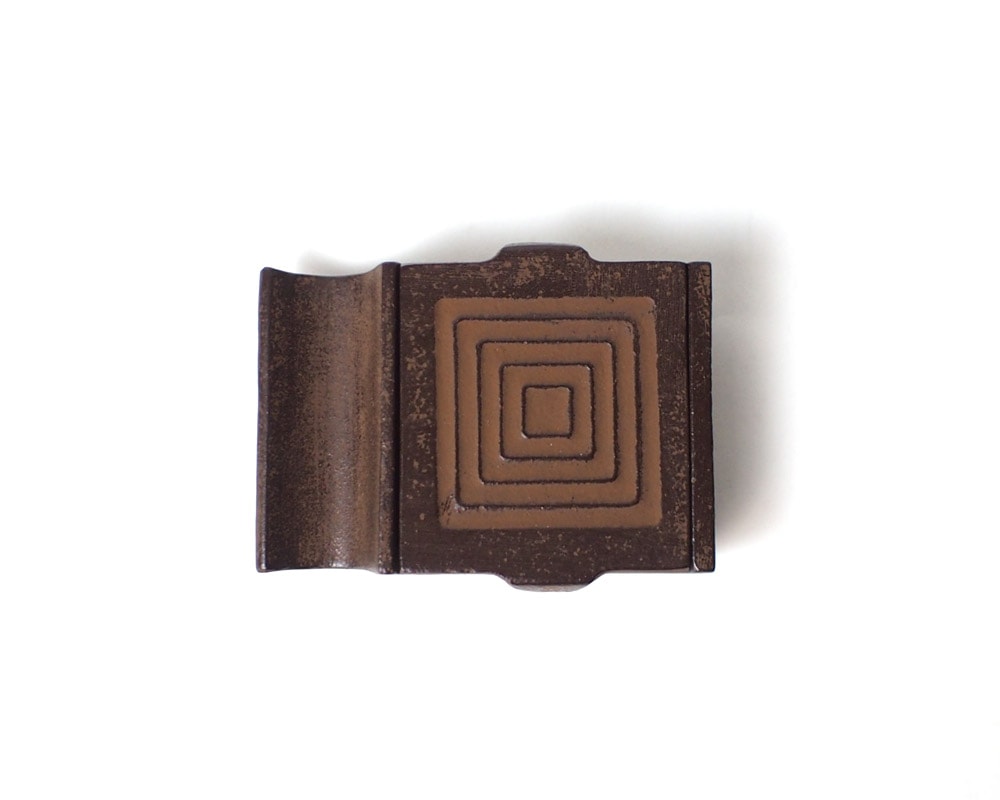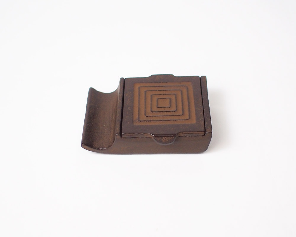 1970年頃にクラフトデザイナー馬場忠寛氏によりデザインされたもので、盛岡・南部鉄器の朱肉と印鑑置き「郷愁」です。 馬場忠寛氏は、日本クラフト協会の理事長を務めるなど、デザインの普及と地方産業の活性化に力を注いできたクラフトデザイナーで、岩手県盛岡市の伝統工芸である南部鉄器のデザインにも古くから取り組まれ、これらの作品の多くは1970年代にデザインされたものです。 伝統的な鉄瓶が主だった当時としては斬新かつモダンだったために多くの人の目に触れることなく製造が終了していました。 長い間眠っていた作品を1990年代にMEISTER/マイスターが復刻を手掛け、現在も当時と変わらぬ方法で製造されています。 そこにあるだけでオブジェにもなるデザインは、見事なまでに現代にマッチし、デザインを通して南部鉄器の良質を伝えてくれます。