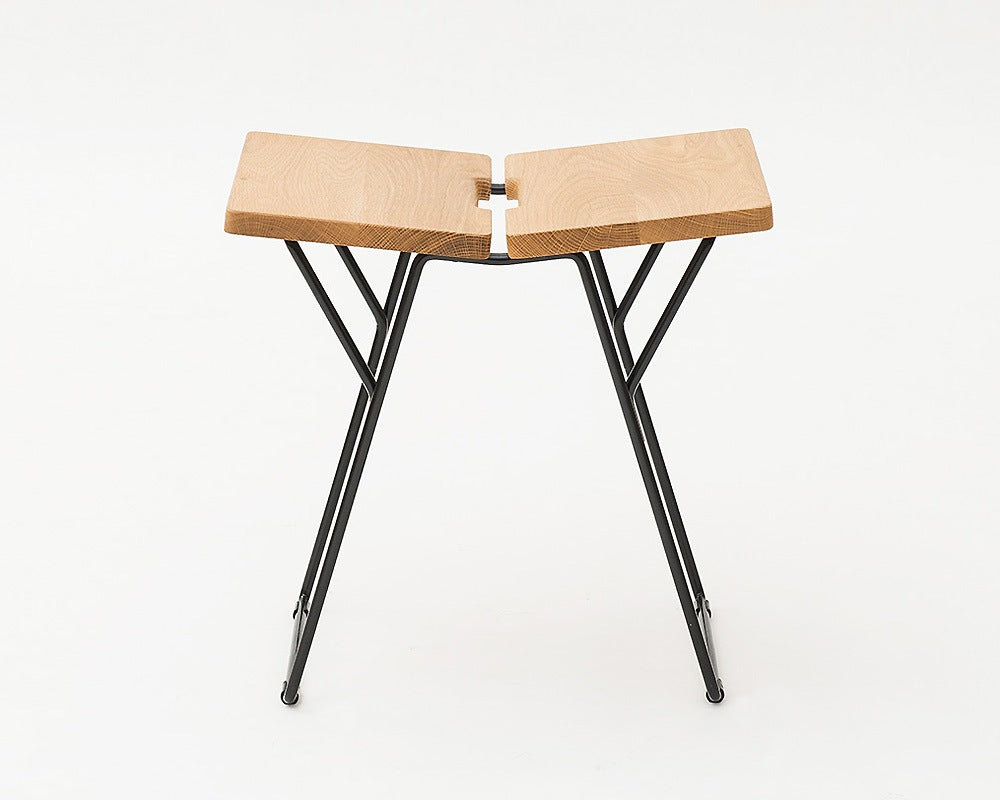 渡辺力デザインの木と鉄という異素材を組み合わせたシンプルで美しいフォルムのスツールです。1954年に建築家 清家 清氏が設計した住宅用の椅子として、渡辺力氏がデザインしたスツールです。氏の代表作であるトリイスツールを思わせる構造で、20mm厚の無垢板を使用した座面とスチールロッドの脚部が、直線的で端正なフォルムを生み出しています。座りやすさを意識した座面の角度や、持ち運びを容易にする座面中央の持ち手部分など、細かな配慮が感じられます。2005年、半世紀の時を経て再製品化された傑作スツールです。