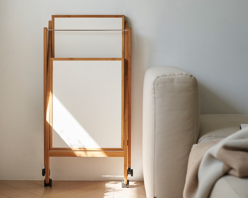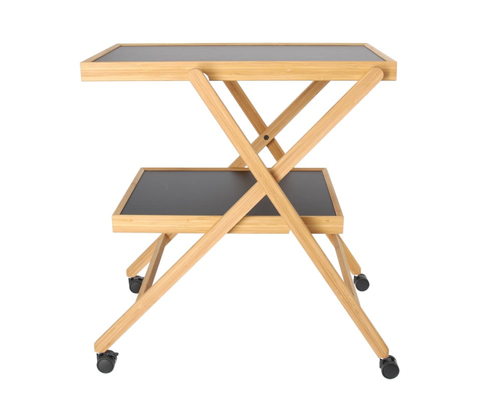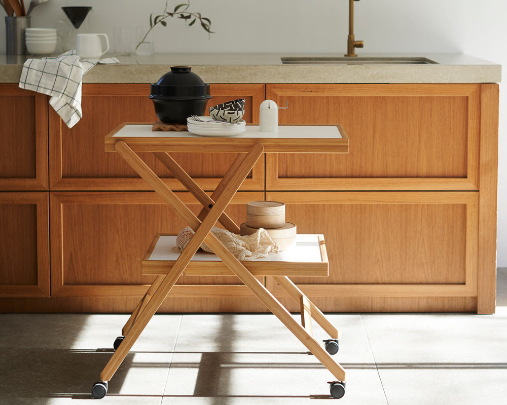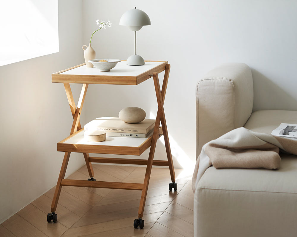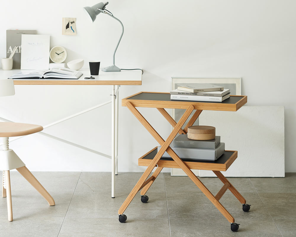 フィンランドのデザイナー「ミスカ・クンツィ」がデザインを担当した、堅牢な竹素材のトローリー「 Taitto/タイット」です。竹集成材の堅牢な性質を生かし、最小限の素材とパーツで構成することで実現した、軽やかな骨格構造のトローリーです。樹木に比べて成長が早い竹は、近年注目を集めているサステナブル(持続可能)な素材。日本産の竹素材、卓越したクラフトマンシップと北欧デザインが融合した、シンプルでありながらも巧妙さと温もりを併せ持った上質なプロダクトです。上下2段の天板は、指紋がつきにくく掃除がしやすいメラミン化粧合板製で、天板上のものが落下しにくいように天板と側面の木部との間には段差が設けられています。下段の天板は、サイドテーブルとして使用する際に脚に邪魔にならないよう、上段に比べてやや小さく設計されています。天板はフレームのステンレスロッドを引っ掛けて固定します。竹の上品できめ細やかな手ざわりを引き立たたせるナチュラルワックス仕上げ。直線的な竹の繊維の美しさが際立ちます。キッチンやワークスペースでトローリーとして、またリビングではサイドテーブルとして様々なシーンでお使いいただけます。
