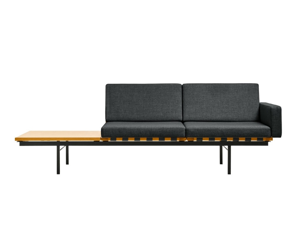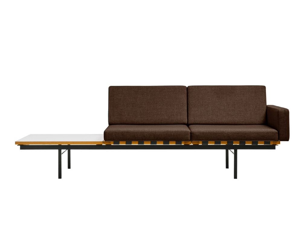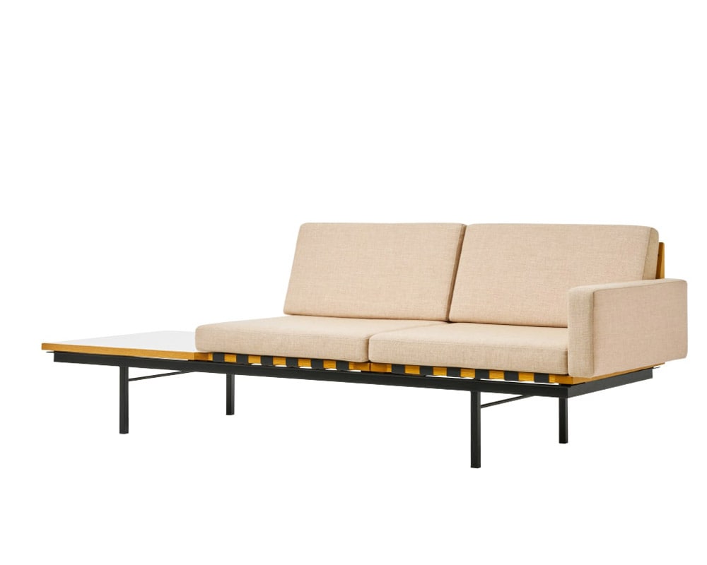 1960年にイギリスのデザイナー、Robin Day/ロビン・デイによってデザインされたシーティングシステム「Form Group/フォームグループ」を、ロビン & ルシアン・デイ財団監修のもと、復刻再生産しました。英国ミッドセンチュリー期に活躍したロビン・デイの名作ソファです。スチール製のフレームとクッションフォームやテーブルを、フレキシブルに組み合わせることにより、多様なバリエーションができるよう設計されており、ライフスタイルに合わせた仕様をお選びいただけます。1961年にデザイン・センター賞を受賞したロビン・デイの代表作のひとつです。従来の木材やスプリングを使用する伝統的なソファ製造の手法に代わり、ラバー製のウェビングテープでシートクッションを支える構造を採用。本来、ソファの内部構造で用いられるウェビングテープを表面に出し、デザインの一部として昇華させたことは、発表当時、最も先進的であるとして評価されました。「レフトアームソファ ウィズテーブル 2シーター」は2人掛けの片肘ソファです。左サイドがテーブルになっており、お気に入りのオブジェを置いてインテリアを楽しんだり、コーヒーテーブルとしてソファで過ごす心地よい時間をサポートしたりと、デザイン性と実用性を兼ね備え、さまざまなシーンでお使いいただけます。座面は広々とゆったりくつろげる広さで、脚を崩したり伸ばしたりとリラックスした姿勢をとることも可能です。また、程よい硬さと弾力でしっかりと体を支えてくれるため、足腰に余計な負担がかからず、体が沈み込み過ぎないため立ち上がる際もスムーズです。個性がありながらも洗練されたデザインは、モダンで上質な空間を演出します。