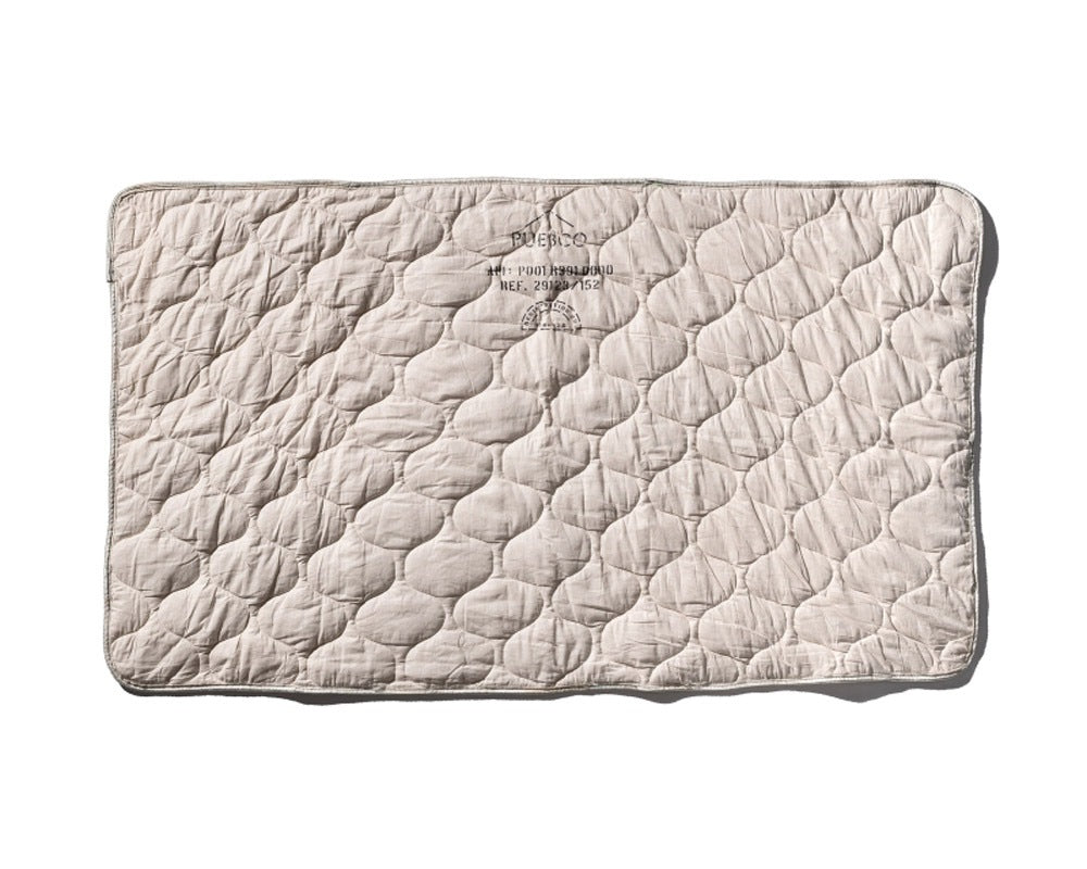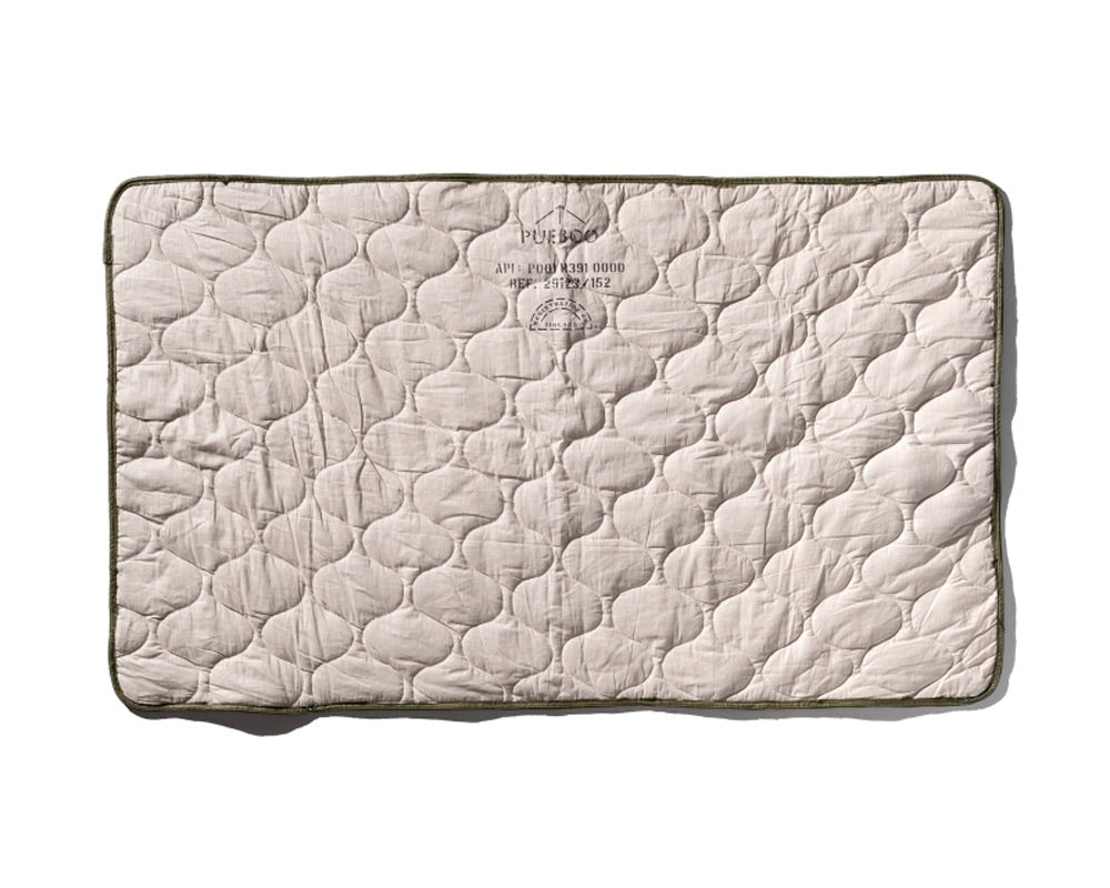 PUEBCO(プエブコ)のユーズドのパラシュート素材をパイピングに再利用した、キルティングのブランケットです。 PUEBCOは、日常と非日常の境界を、インテリアとして空間に描き出すデザインプロダクトの提供がコンセプト。 プエブコのコンセプトでもある「リサイクル」で作られた中綿の入ったキルトブランケットです。 プエブコらしいミリタリーテイストのステンシルがアクセントになっています。 アウトドアに持ち出してブランケットとしての使用はもちろん、お部屋でのブランケットや、ラグマットとしてお使いいただくのもおすすめです。