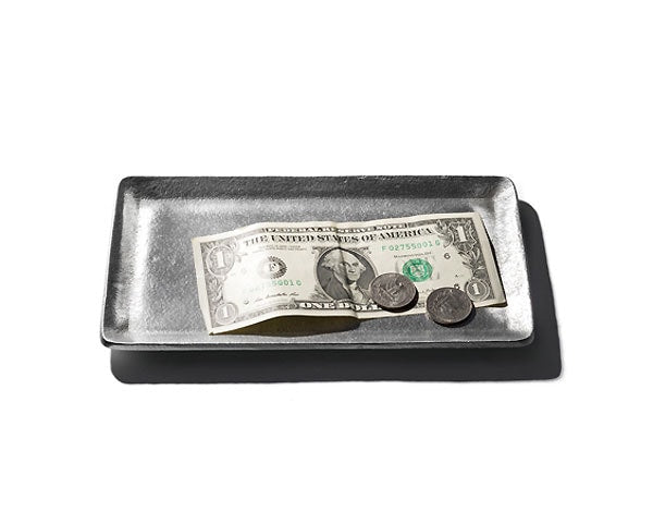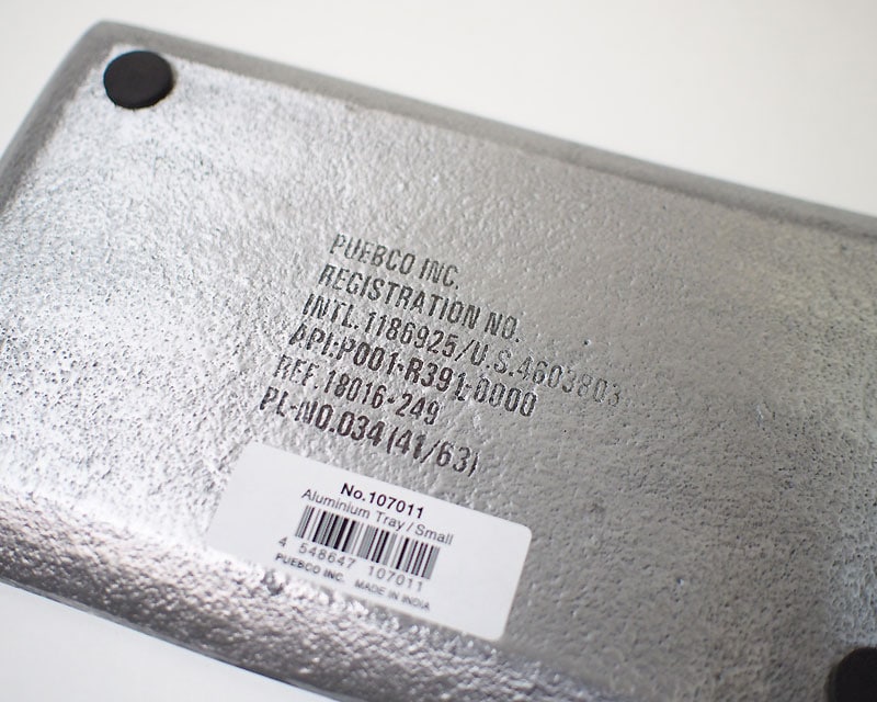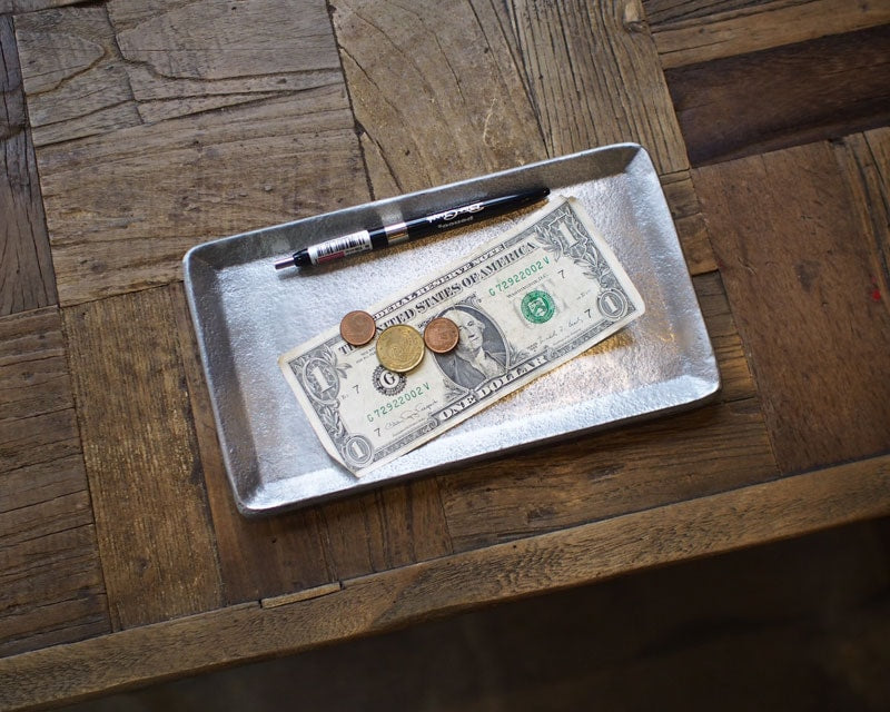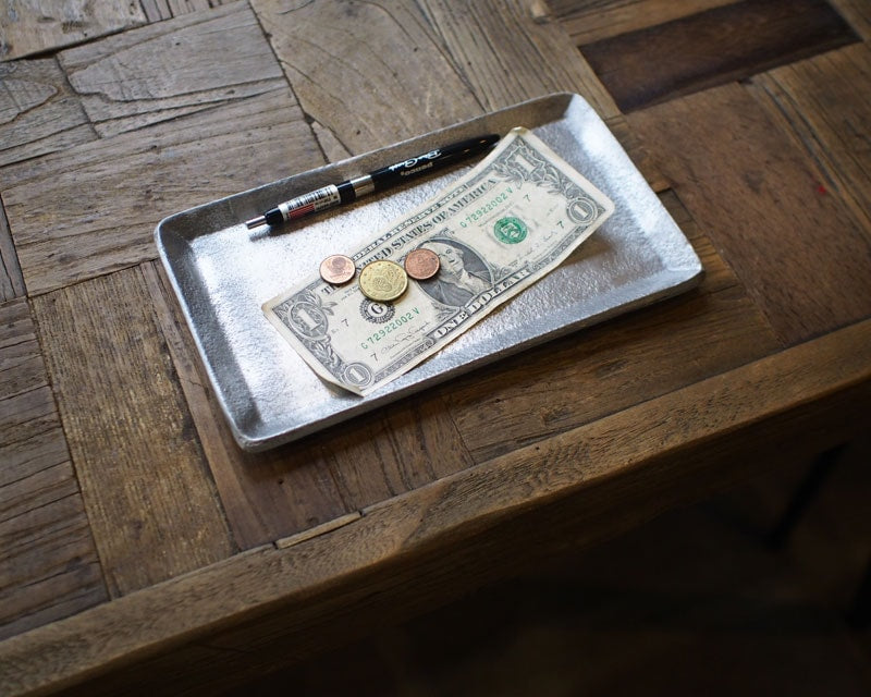 プエブコのアルミ鋳物作られた無骨なトレイ「ALUMINIUM TRAY/アルミニウムトレイ」です。 アルミで作られた軽量かつ重厚感、存在感のあるトレイです。 キャッシュトレイ、コイントレイやペントレイ、玄関先にポケットに入っているものをザクッと置くトレイとして。 表情は一つ一つ違い、無骨な工業製品ぽいデザインながら、どこか温かい雰囲気も持ち合わせています。
