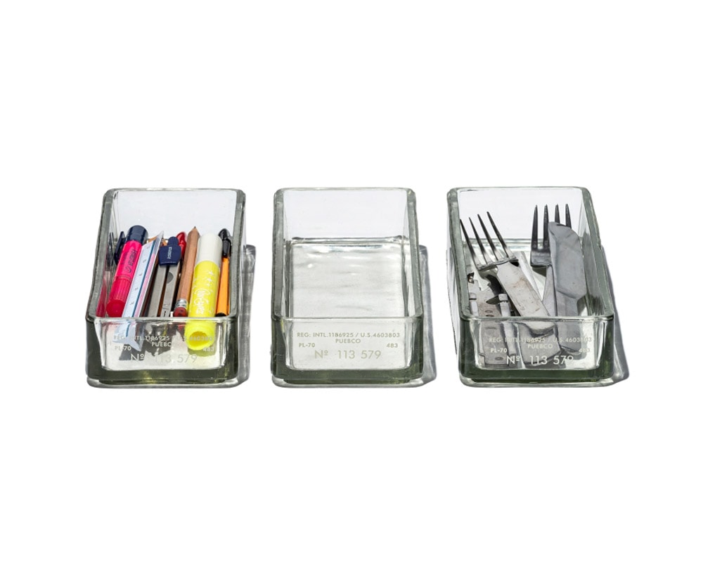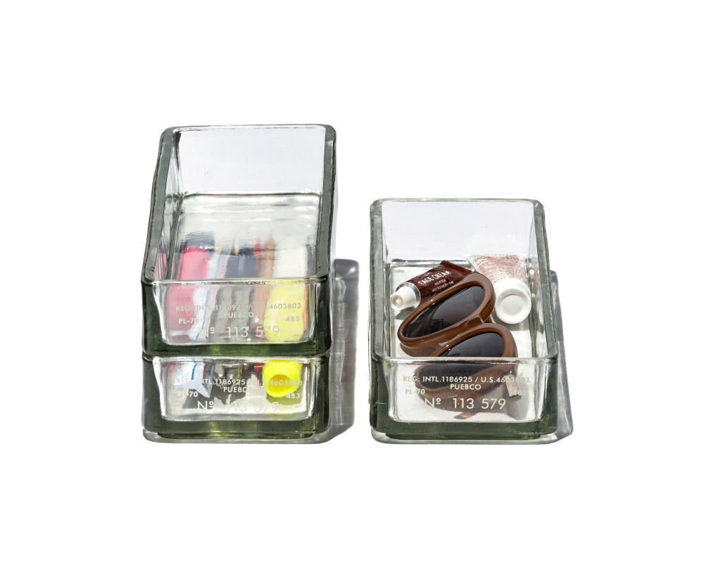 PUEBCO/プエブコのリサイクルガラスで作られたスタッキングの出来るオーガナイザーです。 世の中にはデスク回りやキッチン回りで収納に使用するスタッキングトレーやオーガナイザーは多々ありますが、どれもプラスチックのチープなモノがほとんどです。 このガラスで作られたオーガナイザーは、出しておいて収納に使うだけで絵になる存在感です。 分厚く重厚感のあるガラスで出来ていて、カトラリーや筆記具、ステーショナリーなどの収納に最適。 スタッキングしても中に何が入っているのかが分かりやすく、正面にはプエブコらしくプリントも施されています。