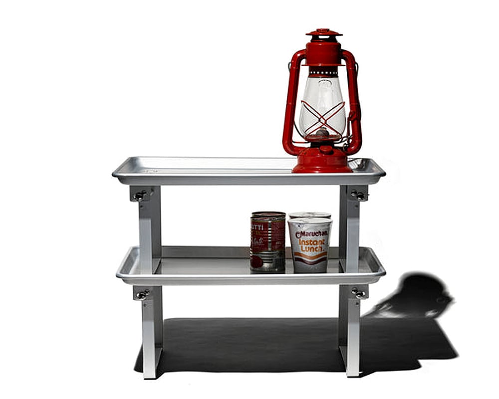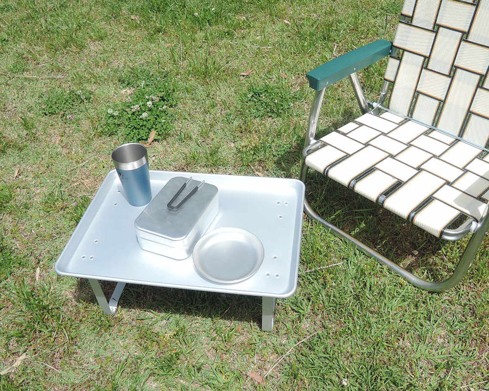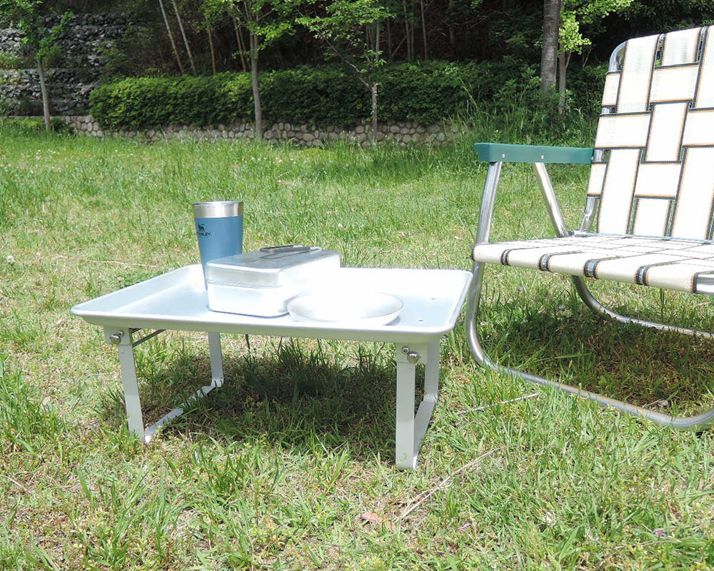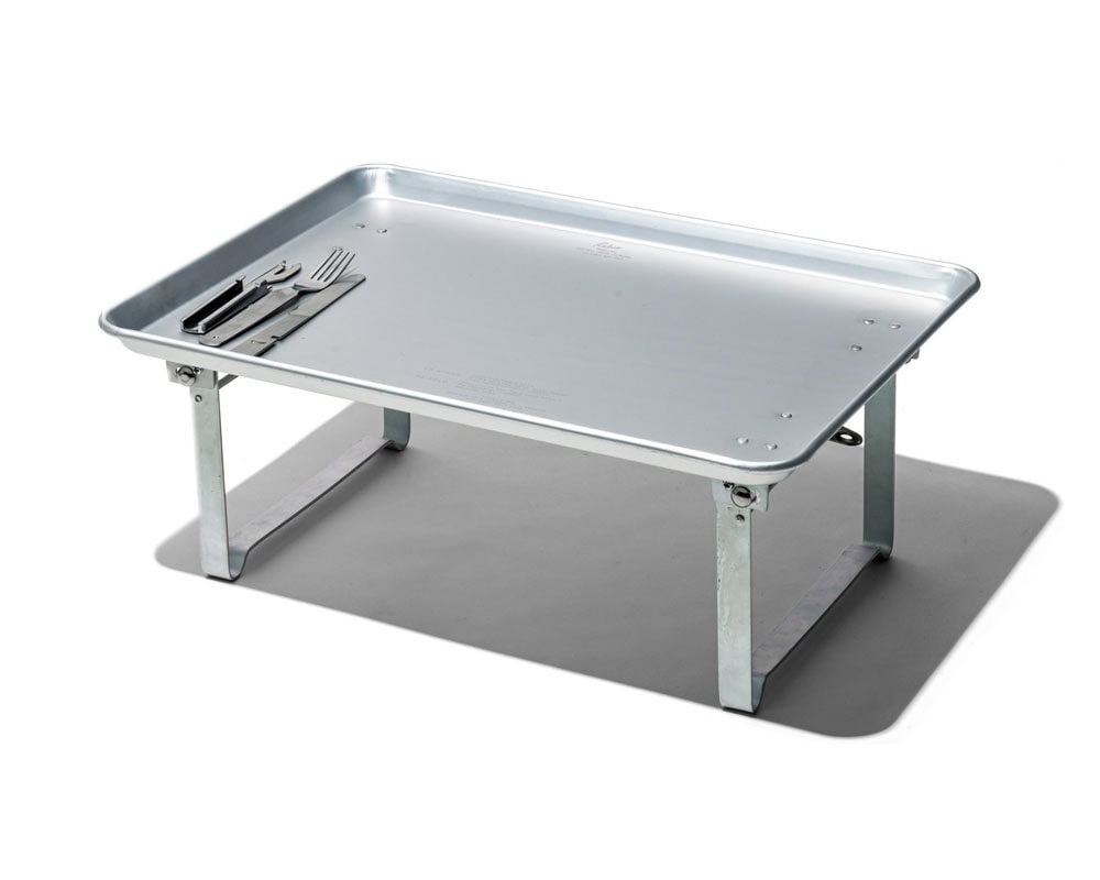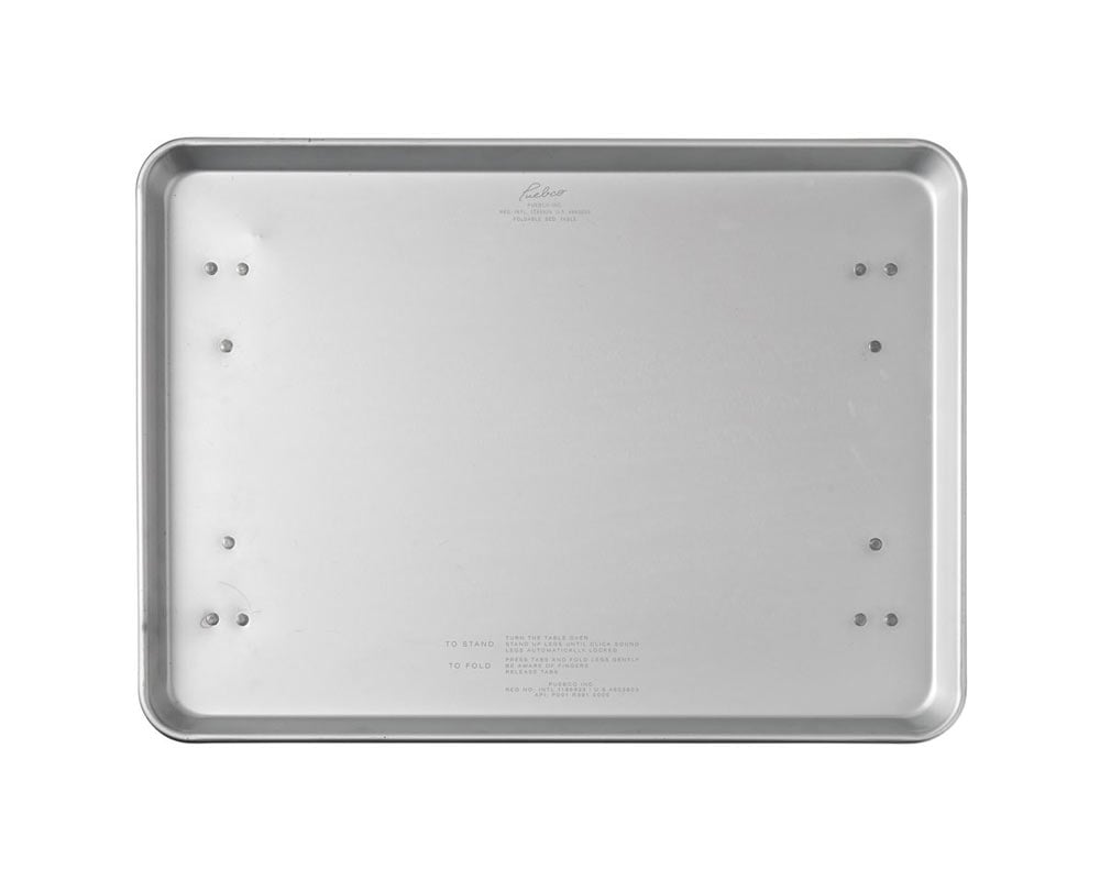 PUEBCO(プエブコ)のアルミでできた非常に軽く、持ち運びに便利なフォールディングテーブル「FOLDABLE BED TABLE」です。 アルミのトレイに折り畳みの脚を取り付けた構造で、軽量で、持ち運びに便利ながら頑丈な作りになっています。 キャンプやアウトドアに最適なこのフォールディングテーブルは、天板がトレイ状になっているため、載せたものの落下を防ぐような利点もあります。 脚部は軽い力で開き、しっかりと固定が出来る構造になっており、折り畳み時も簡単に収納できます。 キャンプや、アウトドア以外でも、お部屋で、ちょっとしたちゃぶ台として、サイドテーブルや来客時のサブテーブルとしてもお使いいただけます。