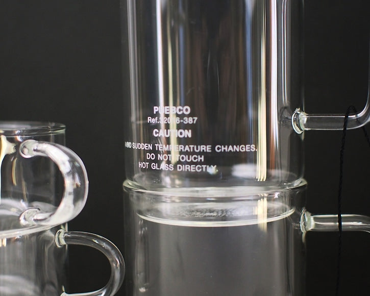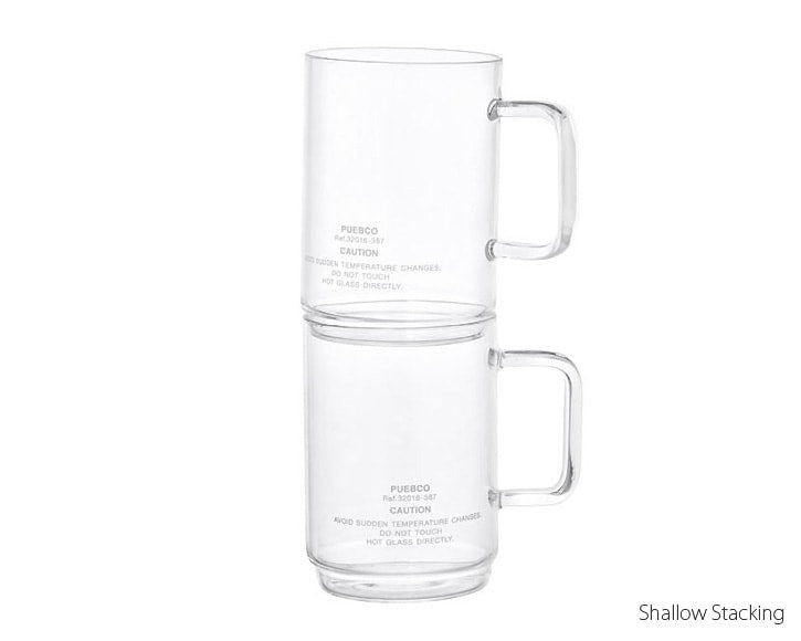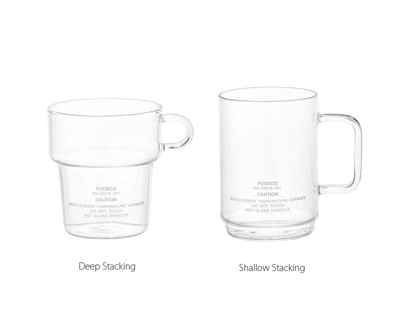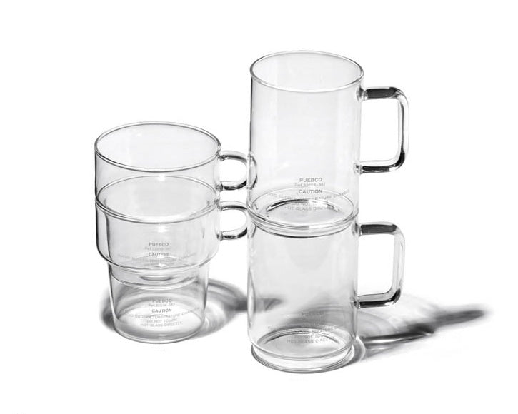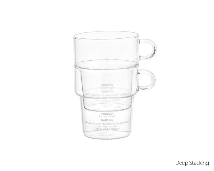 PUEBCO(プエブコ)の耐熱ガラスを使用したスタッキングガラスマグです。 ビーカーや試験管などに使用されるなどでも使われるホウケイ酸ガラスで作られていますので、ホットドリンクにもお使いいただけます。薄く口当たりの良い飲み心地で、電子レンジも使用可能。陶器のマグ同様に温め直すこともできます。また、スタッキングができるため、収納時もかさばらず便利で、お手頃な価格なので来客用に複数揃えておいても良いかもしれません。 形状はDEEP(ディープ)スタッキングとSHALLOW(シャロー)スタッキングの2種類。SHALLOWは使いやすい形状ですが2個程度しかスタッキング出来ませんので、収納重視の方はDEEPをおすすめします。
