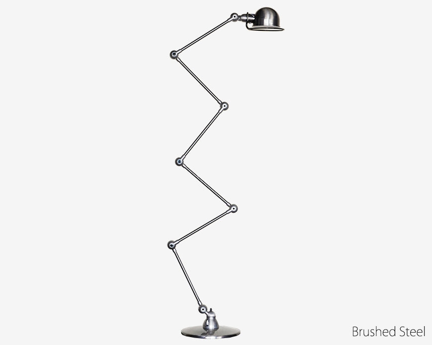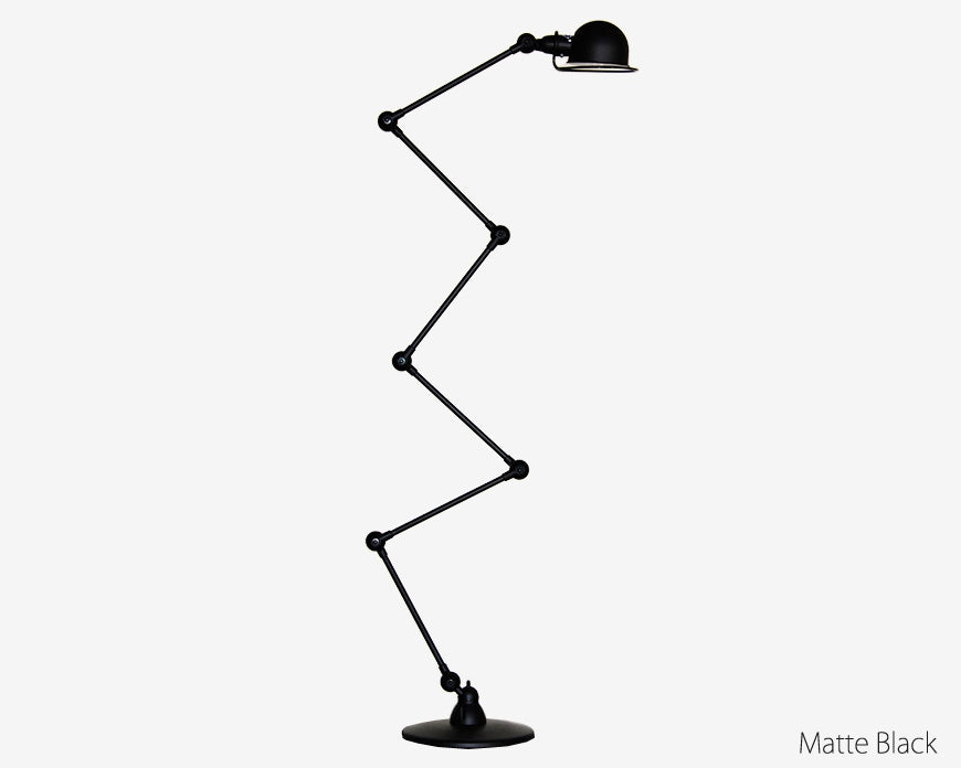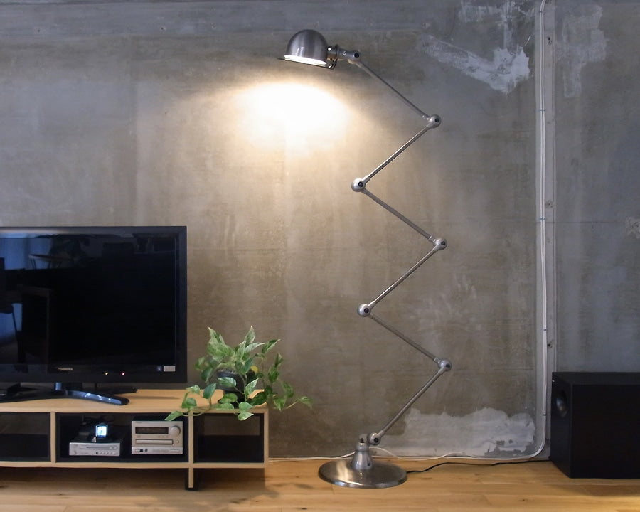 1950年にデザインされたフランス・Jielde(ジェルデ)社の6本のアームを使ったフロアランプ ジグザグです。その機能性と独特の工業的なスタイルで、デザイナーやスタイリスト達が一般の家庭での使用を提案するようになり、1950年以来稀にみるロングセラーを続けています。ポンピドーセンターの展覧会に出展されたり、パリ ミュージアム オブデコレイティブ アートのコレクションに選ばれたりと高い評価を得ています。6本あるジグザグのアームは機械的な存在感があるだけでなく、様々な形に調節して使用する事ができるため機能的でもあります。ジョイント部に配線が通っていない独自の構造のため、アームを自在に動かしても断線の心配がありません。ジグザグのアームはJieldeの特許構造だからこそ実現できる形。シェードは360度回転させることができます。独特の機能美に、インテリアのアクセントにもなるカラーリングが、インテリア上級者のコーディネイトを実現してくれます。