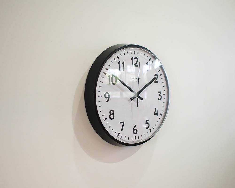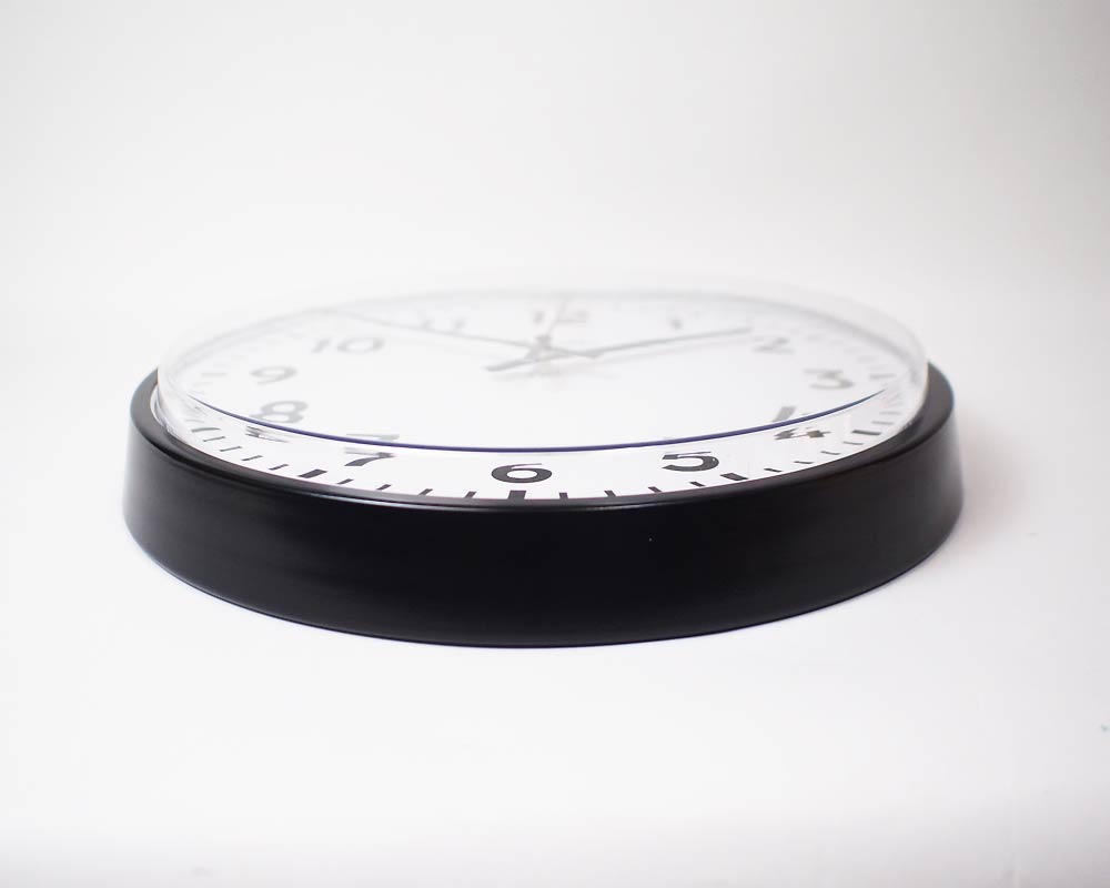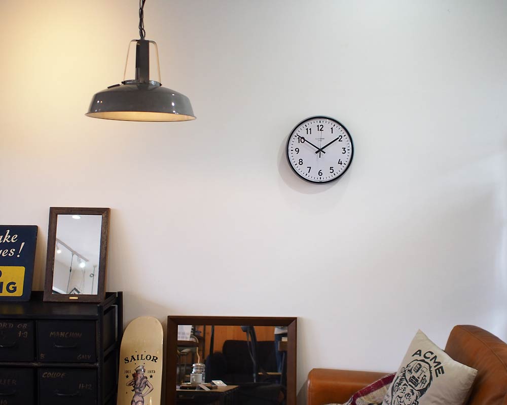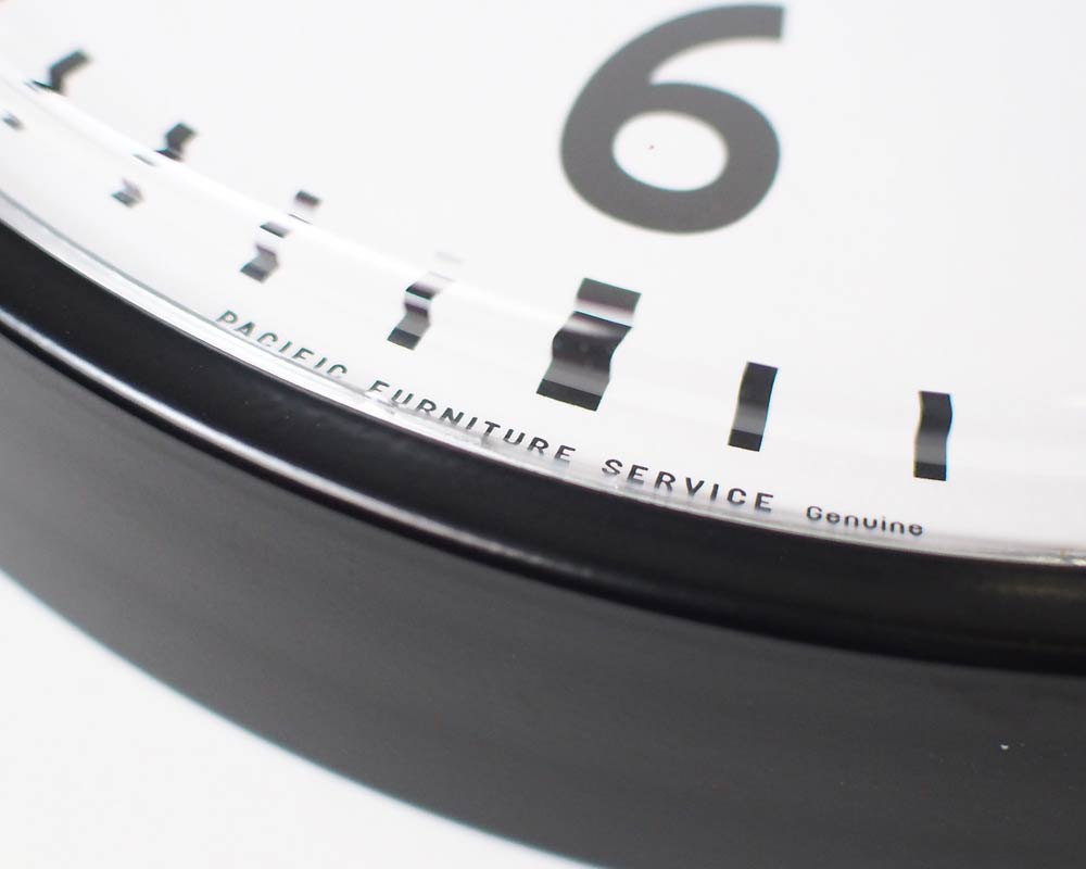 Pacific Furniture Service/パシフィックファニチャースサービスとイギリスのE.A.COMBS/E.A.コームス社と共同開発したウォールクロック/掛け時計です。1895年に創業し現在もイギリスで製作し、公共機関や工業用の大時計、スポーツ用のストップウォッチから家庭用の壁掛け時計まで広く供給している、ロンドンに拠点を置くE.A. COMBS社とP.F.S.が共同開発した掛け時計です。一瞥で時間を認識できるよう、余計なデザインを排除して時計本来の機能を追求しています。Bar/棒指標とArabic/数字指標の2種類からお選びいただけ、Arabic/数字指標はさらにフォントとフレームカラーが違うA,Bの2種類をご用意。共に潔い程の視認性のよい機能的な文字盤になっています。(こちらはArabic/数字指標のAタイプです) サイズは家庭にピッタリな12.5インチ(315mm)で、マットブラックの金属ボディにドーム型の樹脂製風防を備えます。すべてドイツ製のムーブメントを使用しています。※仕様変更により以前のモデルから文字盤を目に優しいオフホワイト色になりました。