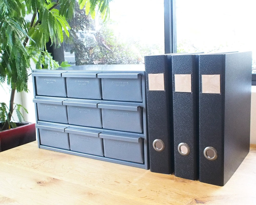 1922年に設立された、アメリカ・ダーム社(DURHAM)の細かなパーツを整理することができる卓上サイズのドロワーキャビネットです。工具や細かなパーツを収納するためのスチール製引き出しです。アメリカのガレージや工場で使用されており、非常に頑丈に作られています。工具やパーツだけでなく、名刺や文房具を収納するのにもぴったりです。全体のサイズはデスクやシェルフの上に置いてもかさばらない大きさで、ベッドサイドやドレッサー周りにもおすすめです。上部に4ヶ所の天穴が空いているので、上下に重ねてボルト等で連結する事もできます。今では少なくなったメイド・イン・USAで、アメリカらしい無骨で工業的な作りが非常に良いです。