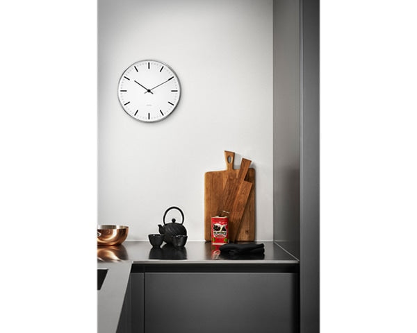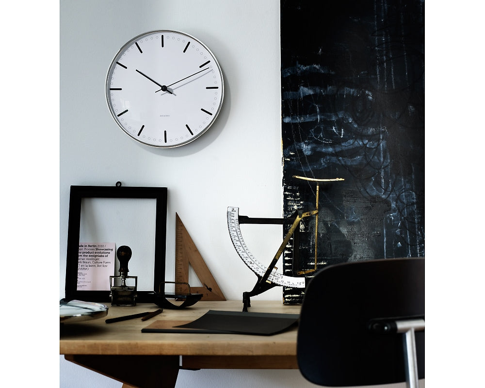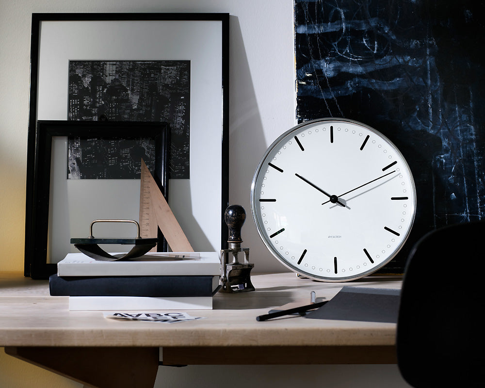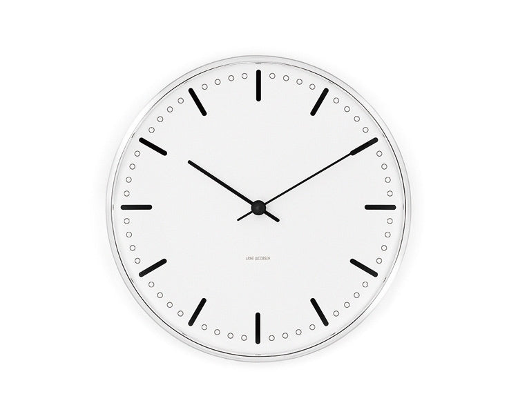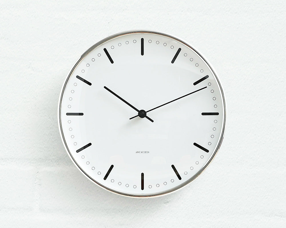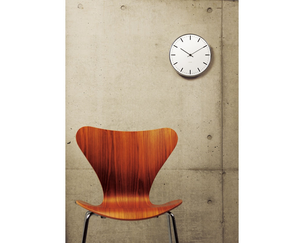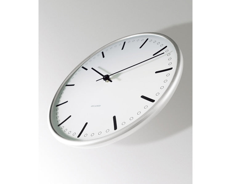 アルネ・ヤコブセンが1955年に建築されたデンマークのロドヴール市庁舎用のためにデザインされた 「CITYHALL CLOCK(シティーホールクロック)」をRosendahl社が忠実に再現したウォールクロックです。建築からインテリアに至るまで、トータルに手掛けた20世紀デンマークを代表する巨匠アルネ・ヤコブセンの思想は、ミニマリズムで極限まで装飾をそぎ落として完成させたカタチこそもっとも美しくて機能的、という考えです。この「CITYHALL CLOCK」もその代表たる作品で、視認性を最優先していて、用いられた色彩はホワイトと反射の無いマットブラックのみ。針もアワーマーカーも全て長形のトラック形状、分目盛りは丸だけというまさに実用重視のデザイン。ただ、それが美しいと感じるのが氏のデザイン力の素晴らしいところでしょう。表面のガラス風防は美しく湾曲し、そのガラス風防と反対に湾曲した文字盤が、側壁無しで滑らかに接する美しい仕上げは、厚みを感じさせないデザインで、名作と呼ぶにに相応しい非の打ち所の無い完成度です。本体は壁面から数cm浮いた状態になるため、壁面に柔らかな陰影を落とし、絶妙な立体感を演出してくれるのも特長です。