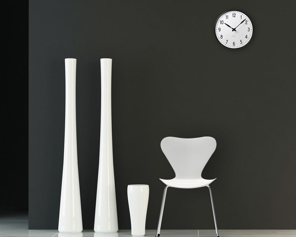 1943年にラウリッツ・クヌーセンとのプロジェクトで製作され、テーブルクロックとして初めて市場に出た幻のアルネ・ヤコブセンデザイン「STATION(ステーション)」のウォールクロックです。当時、手書き風の柔らかなフォントがヨーロッパの主流となり多く使われている中、ヤコブセンはドイツ バウハウスの哲学でもある機能美の流れを組んだデザイン性よりも視認性を重視するフォントを採用し、最もシンプルでどんな空間にも馴染むクロックを発表したことから由来します。このクロックデザインは発表後瞬く間にデンマーク国内へ広がっていくこととなります。国民の大多数が利用する時計を目にする必要がある場所「駅」、このシンプルで普遍的な時計デザインは鉄道の駅に採用され、まるでそれが最初からそこにあったかのように自然に馴染み、多くの人に時間を伝えるための大切な道具となりました。ラウリッツ・クヌーセンの博物館にはコレクションとしてSTATIONと同フォントのクロックが並んでいます。建築からインテリアに至るまで、トータルに手掛けた20世紀デンマークを代表する巨匠アルネ・ヤコブセンの思想は、ミニマリズムで極限まで装飾をそぎ落として完成させたカタチこそもっとも美しくて機能的、という考えです。表面のガラス風防は美しく湾曲し、そのガラス風防と反対に湾曲した文字盤が、側壁無しで滑らかに接する美しい仕上げは、厚みを感じさせないデザインで、名作と呼ぶにに相応しい非の打ち所の無い完成度です。本体は壁面から数cm浮いた状態になるため、壁面に柔らかな陰影を落とし、絶妙な立体感を演出してくれるのも特長です。