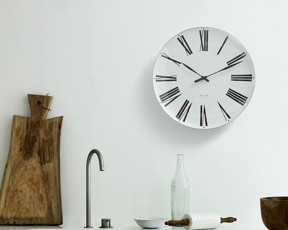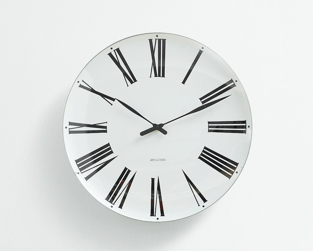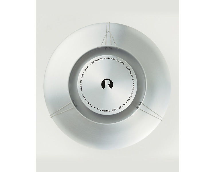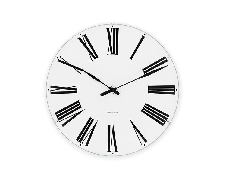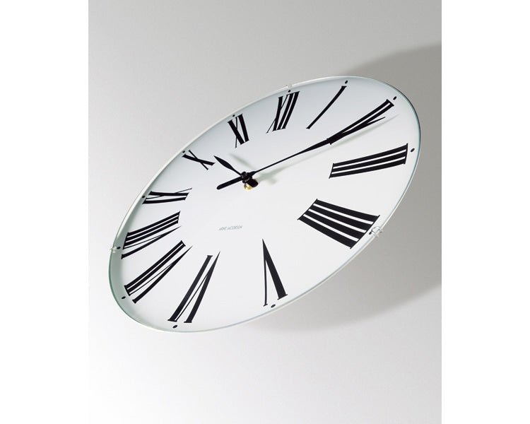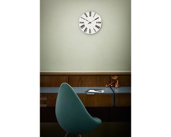 アルネ・ヤコブセンが1941年にオーフス市庁舎を設計した際に手掛けた名作「ROMAN CLOCK(ローマンクロック)」をRosendahl社が忠実に再現したウォールクロックです。建築からインテリアに至るまで、トータルに手掛けた20世紀デンマークを代表する巨匠アルネ・ヤコブセンの思想は、ミニマリズムで極限まで装飾をそぎ落として完成させたカタチこそもっとも美しくて機能的、という考えです。ケースとの一体型を実現した文字盤に直接インデックスを描くことで、独特の立体感を演出しています。また、ガラスの湾曲もオリジナルに忠実に再現。オーフス市庁舎は中に飾られる家具や照明はもちろん、灰皿やドアノブに至るまで手掛けられ、トータルデザインという完璧主義へのこだわりが姿を現しはじめた建築物です。表面のガラス風防は美しく湾曲し、そのガラス風防と反対に湾曲した文字盤が、側壁無しで滑らかに接する美しい仕上げは、厚みを感じさせないデザインで、名作と呼ぶにに相応しい非の打ち所の無い完成度です。本体は壁面から数cm浮いた状態になるため、壁面に柔らかな陰影を落とし、絶妙な立体感を演出してくれるのも特長です。