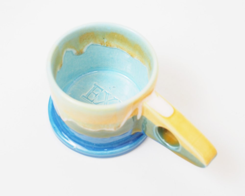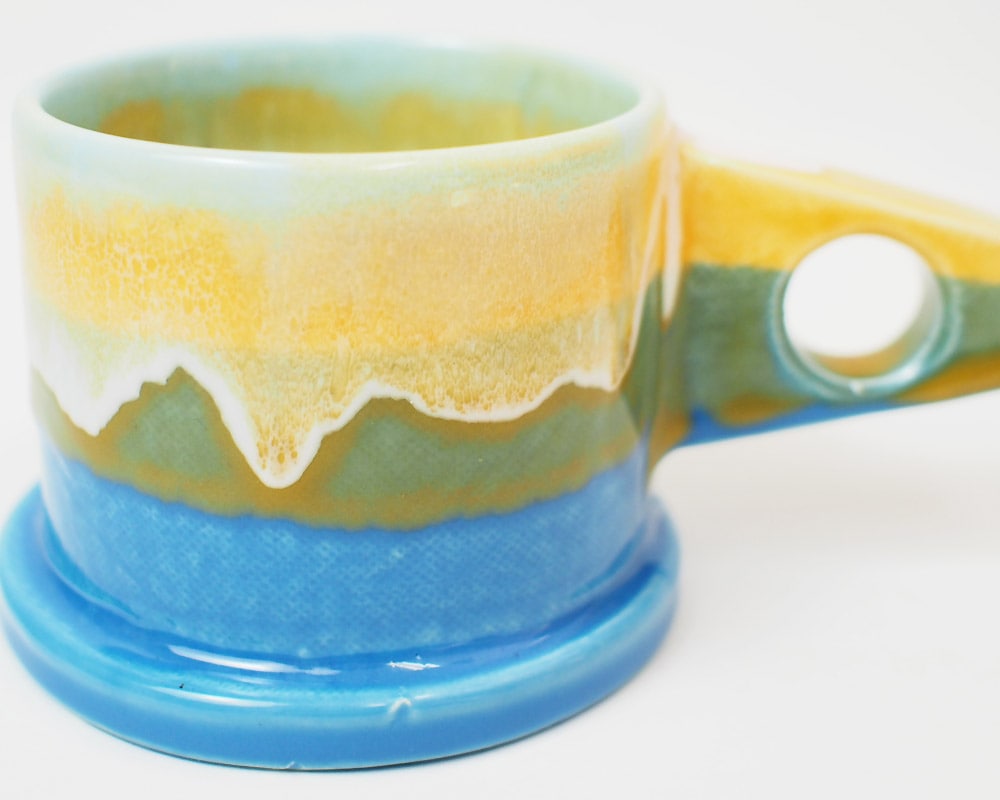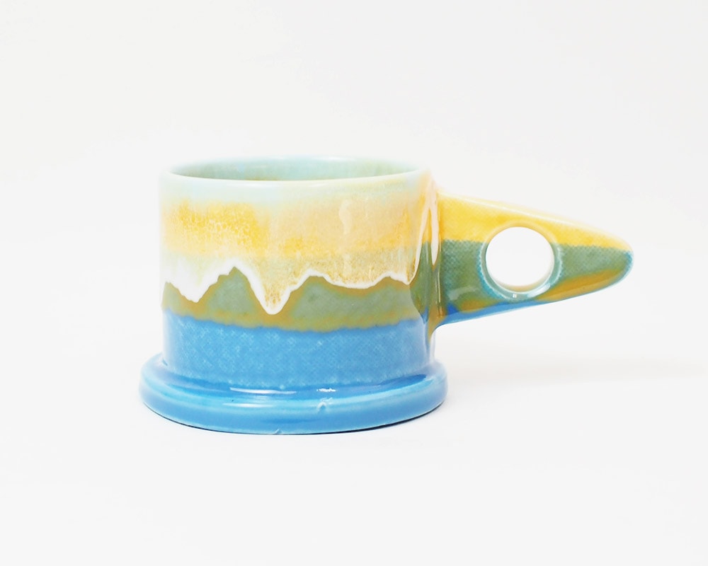 ポストモダンを彷彿させる独創的なフォルム。「ECHO PARK POTTERY(エコ・パーク・ポタリー)」のマグカップ。 Peter Shire(ピーター・シャイヤー)は、現在ロサンゼルスのスタジオで様々な作品を製作するアーティスト。 彼は80年代イタリアのポストモダンの代表的なデザインチーム「Memphis」のメンバーの中で唯一のアメリカ人でもありました。 そのPeter Shireが主宰するEcho Park Potteryのマグはポストモダンを彷彿させる、独特なかたちや釉薬が掛けられた、とても魅力的なものとなっています。 キャンバスで付けられたテクスチャー、2色での分け掛けやスプラッターと呼ばれる跳ね掛けによる色付けも、空間を鮮やかにしてくれます。 また、裏面には、Peterの遊び心が感じられるスタンプが施されこのマグをより愛着の湧くポイントにしてくれます。 そして何より、見た目からは想像できない使い勝手の良さも特徴です。