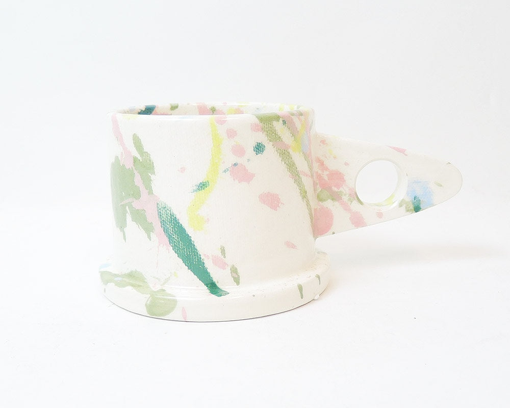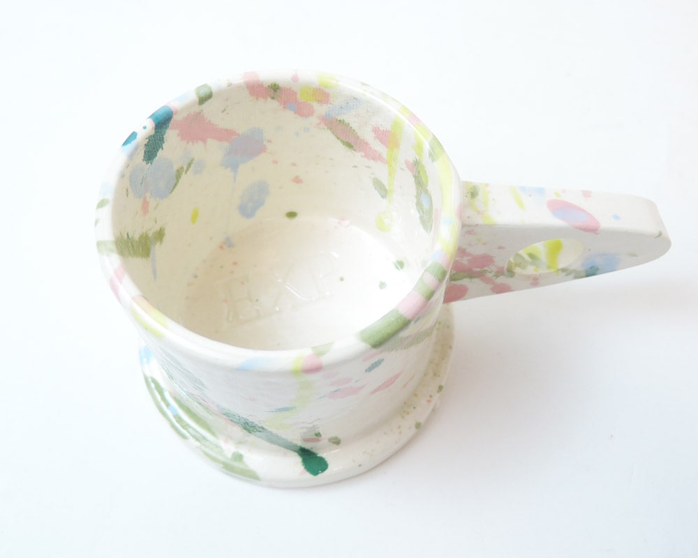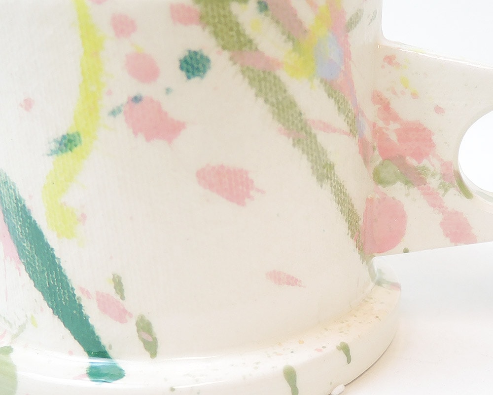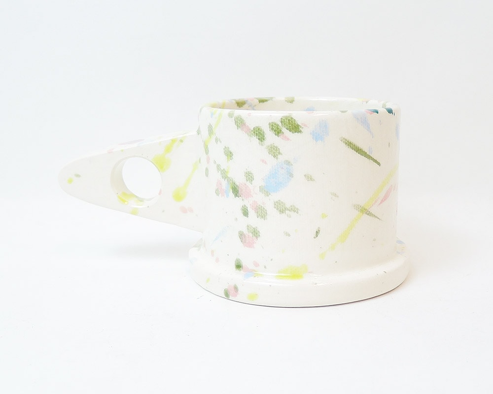 ポストモダンを彷彿させる独創的なフォルム。「ECHO PARK POTTERY(エコ・パーク・ポタリー)」のマグカップ。 Peter Shire(ピーター・シャイヤー)は、現在ロサンゼルスのスタジオで様々な作品を製作するアーティスト。 彼は80年代イタリアのポストモダンの代表的なデザインチーム「Memphis」のメンバーの中で唯一のアメリカ人でもありました。 そのPeter Shireが主宰するEcho Park Potteryのマグはポストモダンを彷彿させる、独特なかたちや釉薬が掛けられた、とても魅力的なものとなっています。 キャンバスで付けられたテクスチャー、2色での分け掛けやスプラッターと呼ばれる跳ね掛けによる色付けも、空間を鮮やかにしてくれます。 また、裏面には、Peterの遊び心が感じられるスタンプが施されこのマグをより愛着の湧くポイントにしてくれます。 そして何より、見た目からは想像できない使い勝手の良さも特徴です。