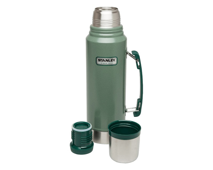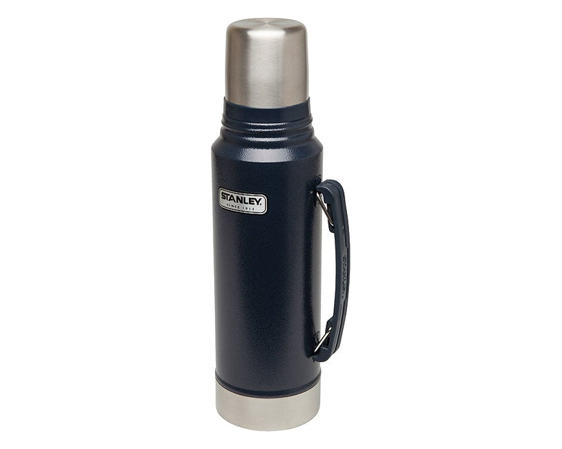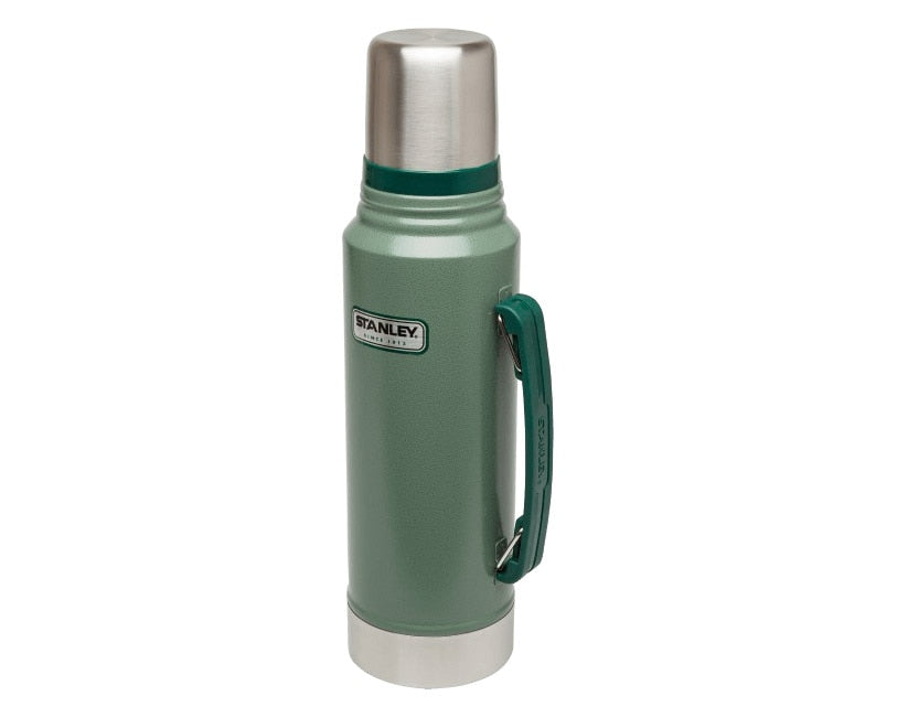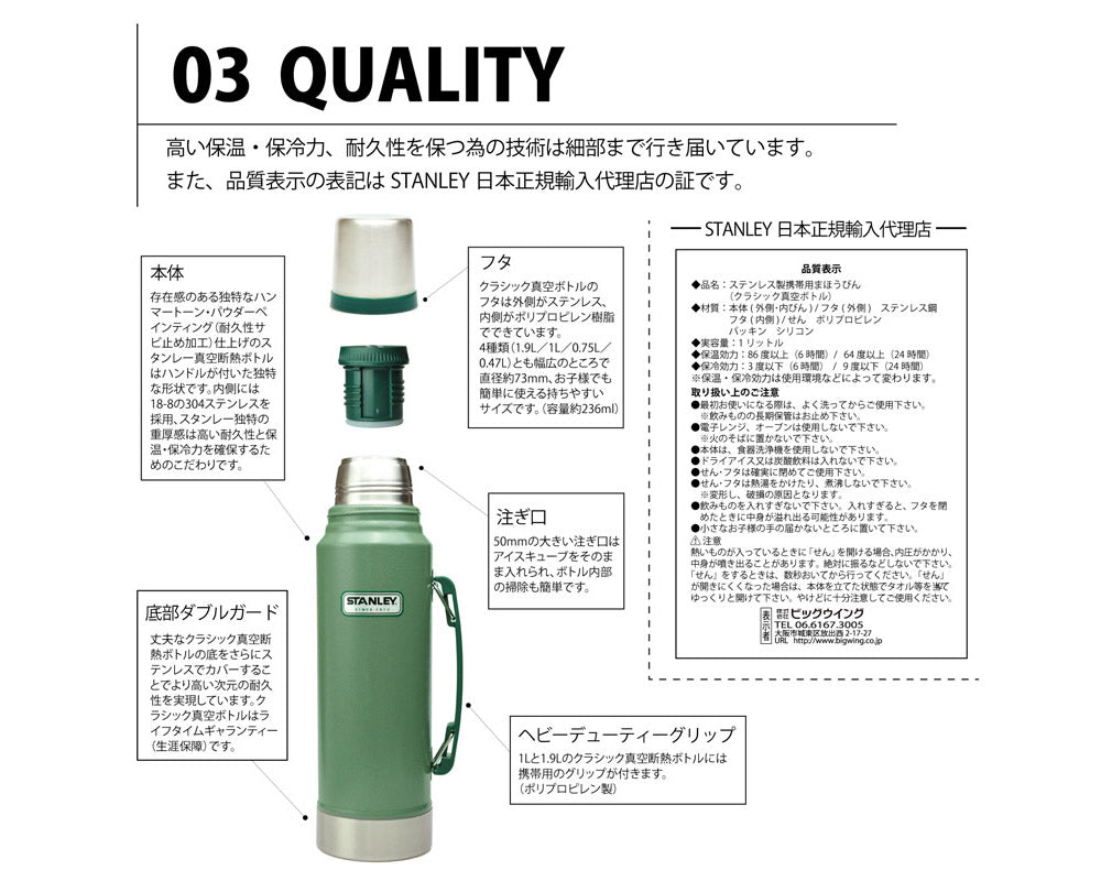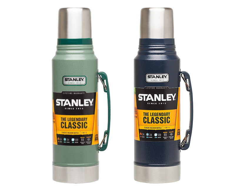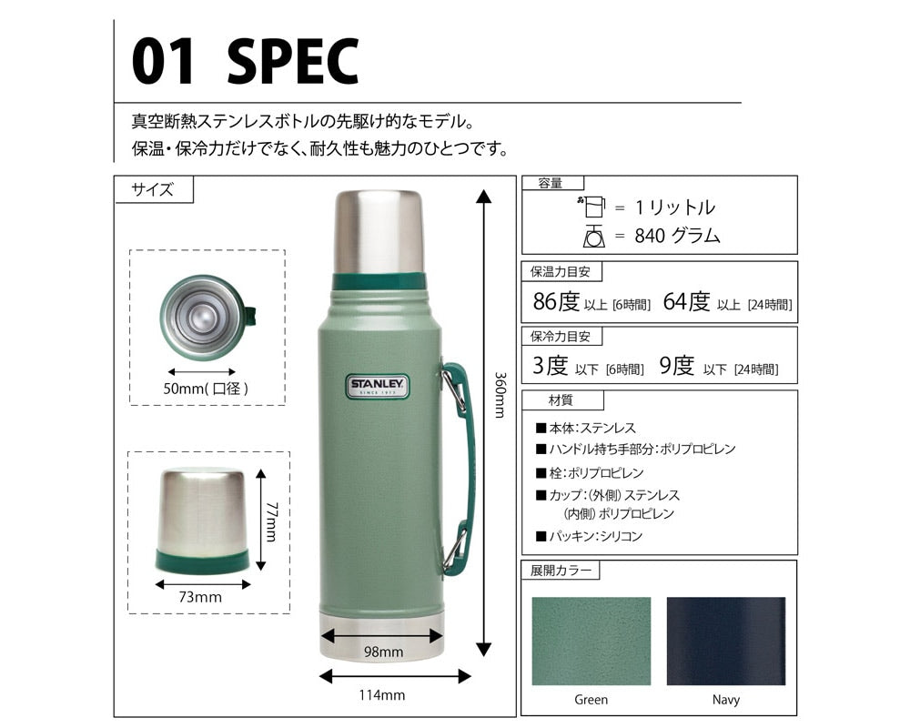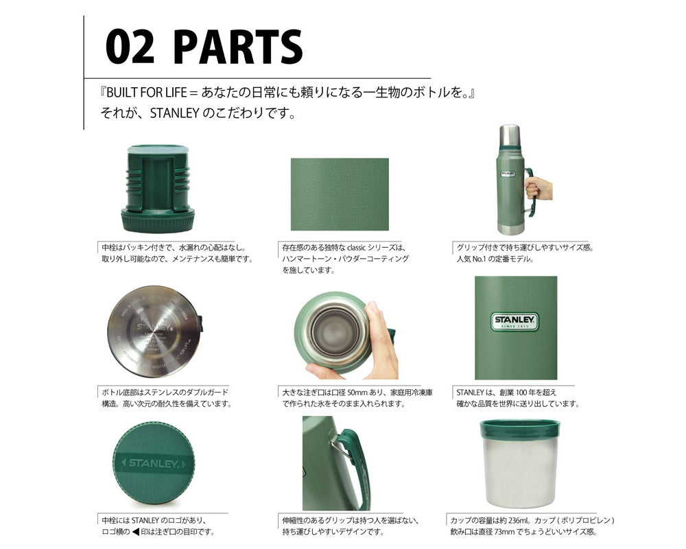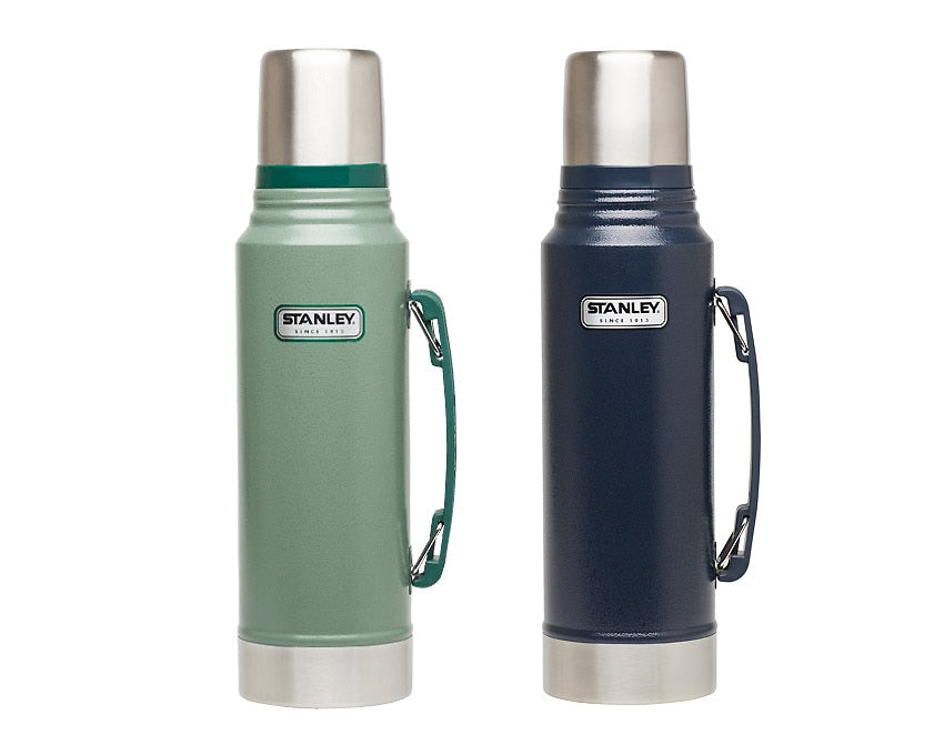 シンプルな構造が、堅牢で高い機能性を生み出すロングセラー「STANLEY(スタンレー)」のクラシックボトル、しっかりした容量と持ち運びに優れるハンドルの付いた 1Lです。デザインと耐久性、高い保温力を兼ね備えたSTANLEYのステンレスボトル(魔法瓶)は細部にまでこだわりぬいた作りになっています。注ぎ口が大きく安心して飲み物を注ぐことができ、氷も入るサイズで、ほぼ継ぎ目のない構造は隙間に水が入り込まず、また洗いやすいため衛生面にも優れます。さらにその構造は、外気の熱を入れず、中の飲み物の熱を逃がさないため、優れた保温・保冷力を発揮します。底部に木炭シリカを用いることで、保温力、クッション性を持たせ、その上にステンレスカバーでダブルガードされた本体は、高さ12,000mから落としても割れないと言われているほどの耐久性があります。所有することにも喜びを感じるこのステンレスボトルは、アウトドアに最もふさわしい水筒としてお勧めできます。