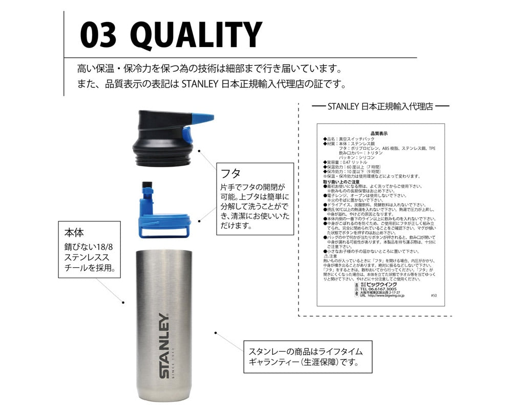 シンプルな構造が、堅牢で高い機能性を生み出す「STANLEY(スタンレー)」の真空シリーズから新しくリリースされた、軽く清潔にタウンユースでも使いやすい真空断熱マグです。デザインと耐久性、高い保温力を兼ね備えたSTANLEYのステンレスボトル(魔法瓶)は細部にまでこだわりぬいた作りになっています。より軽くなったプッシュボタン プッシュ式のボタンは、女性やお子様も少しの力で開閉可能に進化しています。片手で使うことを想定した使いやすいデザインです。より清潔に使用できる新機能 飲み口を埃などからガードするフタが付きました。簡単に開閉することができ、より清潔にご利用いただけます。また、取っ手がついているのでカラビナやストラップ等でバッグに付けたり、軽く指に引っ掛けて持ち運びができます。高い保温・保冷性能 ステンレス真空断熱構造で、高い保温保冷性能を有しています。また、フタを外すと開口が広いので、氷も簡単に入れられます。さらに広い開口は洗いやすく、フタも分解できるのでお手入れも簡単です。軽く、持ち運びやすく使いやすいデザインは、アウトドアやレジャー意外に、タウンユースやオフィスなどでもお使いいただくのもおすすめです。