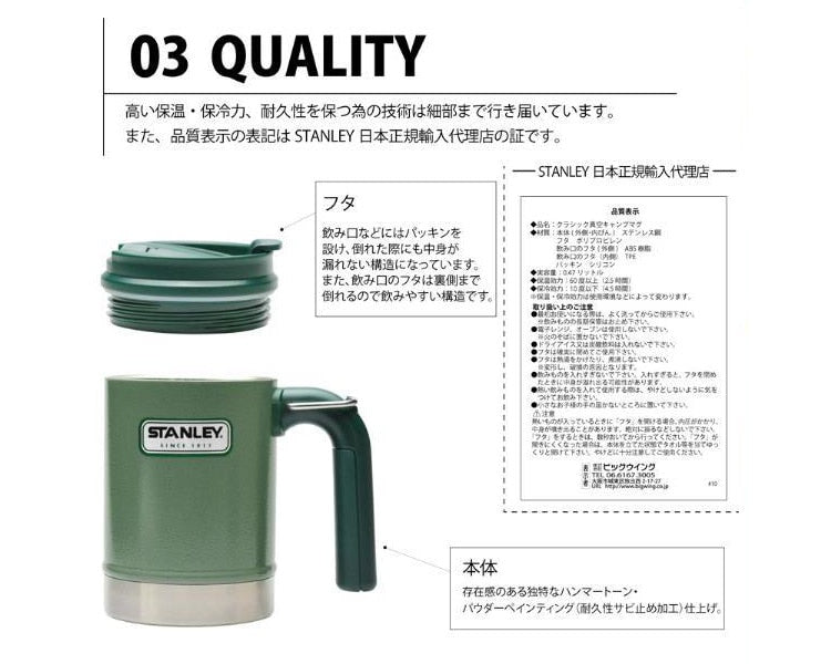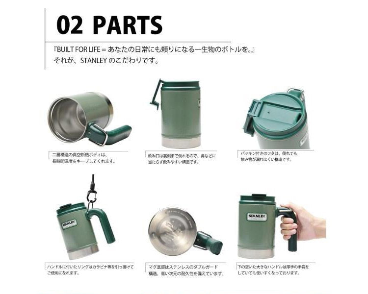 シンプルな構造が、堅牢で高い機能性を生み出す「STANLEY(スタンレー)」のハンドルが付いた大容量の真空キャンプマグです。デザインと耐久性、高い保温力を兼ね備えたSTANLEYのステンレスボトル(魔法瓶)は細部にまでこだわりぬいた作りになっています。注ぎ口が大きく安心して飲み物を注ぐことができ、氷も入るサイズで、ほぼ継ぎ目のない構造は隙間に水が入り込まず、また洗いやすいため衛生面にも優れます。可動式で漏れ防止機能付きのフタを装備しており、下の空いた大きなハンドルは厚手の手袋をしていても使いやすいデザインになっています。ハンドルに付いたDリングにカラビナ等を引っ掛けて、リュックなどに吊り下げて持ち運びするなどの用途にご使用いただけます。