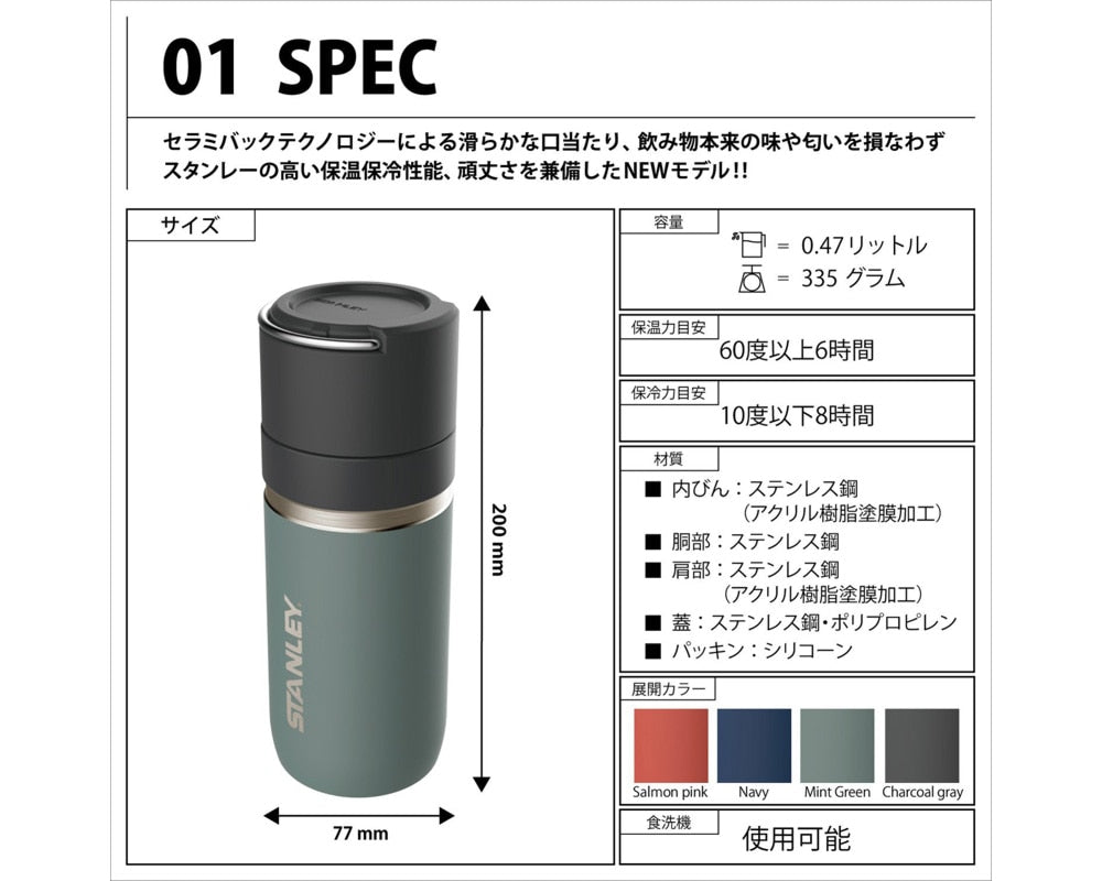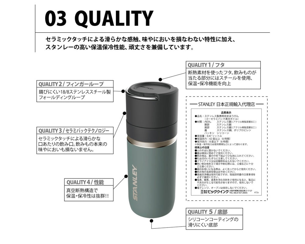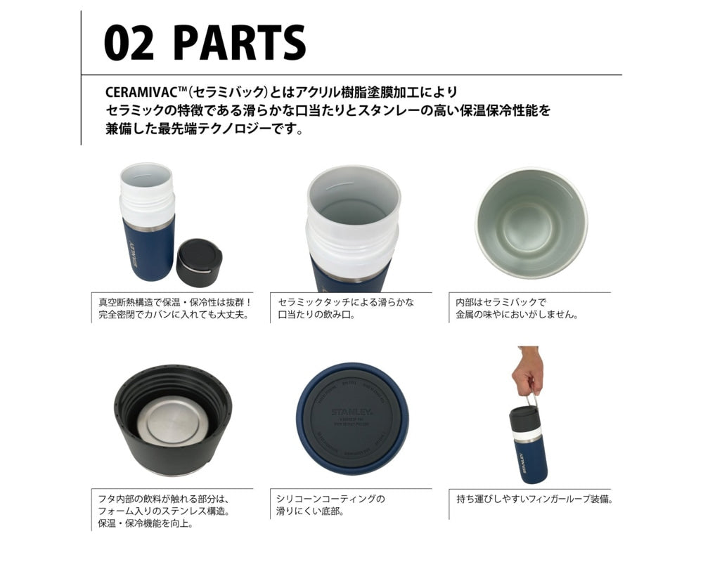 「STANLEY(スタンレー)」の高い保温保冷性能、頑丈さはそのままに、セラミックタッチによるなめらかな感触で、味やにおいを損なわない特性もつCERAMVAC/セラミバックを採用したシリーズです。いつでもどこでも気軽に使えるマルチユースを目的として開発されたモデル「ゴーシリーズ」のCERAMVAC/セラミバックを採用したドリンクボトルです。新採用CERAMVAC/セラミバック セラミバックとは、アクリル樹脂塗膜加工によりセラミックの特徴である滑らかな口当たりを実現しています。セラミバックは内部まで施され、飲料への金属の味やにおいなどが移ることを防いでいます。高い保温・保冷機能 STANLEY(スタンレー)の技術が生かされたステンレス真空断熱構造で、高い保温保冷性能を有しています。また、フタを外すと開口が広いので、氷も簡単に入れられます。さらに広い開口は洗いやすく、フタも分解できるのでお手入れも簡単です。フタの飲料が直接当たる部分には、フォーム入りのステンレス構造で保温保冷性能を高める工夫が施されています。手軽に持ち運べる 持ち運びやすくできるフィンガーループをフタに装備。錆びにくいステンレスを採用し、アウトドアやレジャー意外に、タウンユースやオフィスなどでもお使いいただくのもおすすめです。