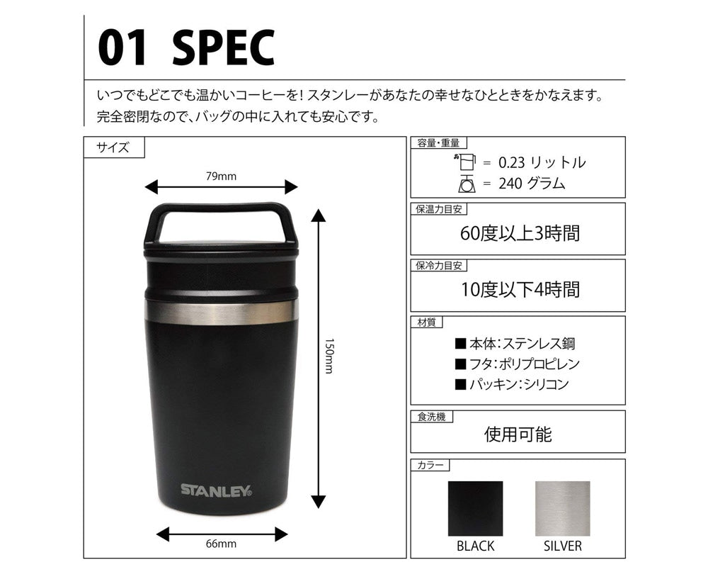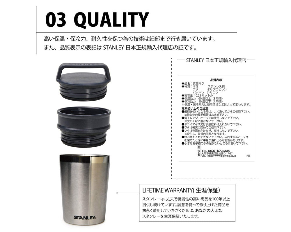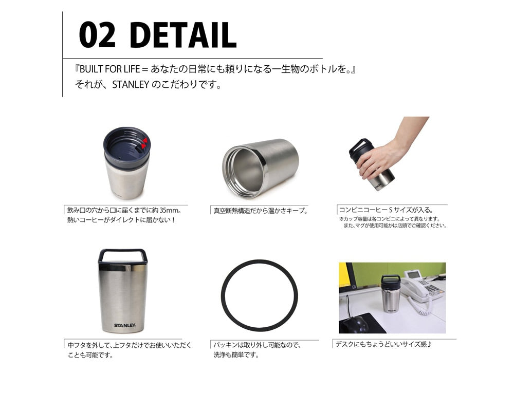 シンプルな構造が、堅牢で高い機能性を生み出す「STANLEY(スタンレー)」の真空シリーズ。スタンレー真空マグは携帯しやすい真空断熱構造のコンパクトマグです。1人用のコーヒーメーカーにも対応したコンパクトな飲み切りサイズで、バッグに入れても安心の漏れ防止加工(完全密閉)。万能なフタは飲み方の使用方法は2種類。飲み口の付いたフタ は外出先でも飛び散りにくいです。本体には軽くて錆びにくい18/8ステンレス使用。BPAフリーです。コンビニのコーヒーなんかもちょうど入るサイズで、1つ持っていると非常に便利な携帯マグです。