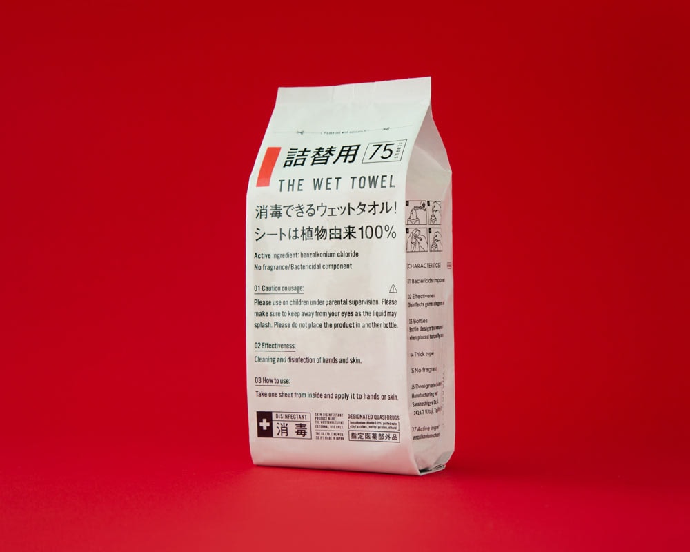 手がしっかりときれいになっている安心感。ウェットティッシュに最も必要な機能は、拭いたところを清潔にすることだと考えました。「THE WET TOWEL/ザ・ウェットタオル」は「消毒」できることが何よりの特長。シートに染み込ませた水溶液には殺菌成分を配合しています。一般的なウェットティッシュに多い「除菌」とは、拭った部分の菌をある程度取り除くこと。一方「消毒」とは、菌を取り除くだけでなく、有害な細菌の毒性を無力化させることを意味しています。食中毒の原因となる黄色ブドウ球菌やサルモネラ菌、大腸菌など様々な菌に対して消毒効果を発揮する『THE WET TOWEL』の水溶液は、病院で医療器具を洗浄するときに使う消毒液と同じもの。薬機法に則して、厚生労働省から指定医薬部外品の認可を得ています。お出かけ先の食事前のお手拭きをはじめ、様々な用途に安心してお使いいただけます。こだわりの厚手シートは、100%植物由来の不織布。吸水性に長けたパルプを、繊維が長いレーヨンで挟み込んだ三層構造をしています。この構造により『THE WET TOWEL』のシートは名前の通り、やぶれにくく高い保液性を誇ります。土佐和紙の漉き合わせの技を不織布に取り入れた高品質な商品を多数手がける、三和製紙グループの三昭紙業株式会社による製造です。未開封の状態の保管期限は約3年。非常時の備えにも適しています。※この商品にはアルコールが含まれています。ニスやペンキの塗装面、白木、壁紙、スチロール製品、革製品などには使用できません。