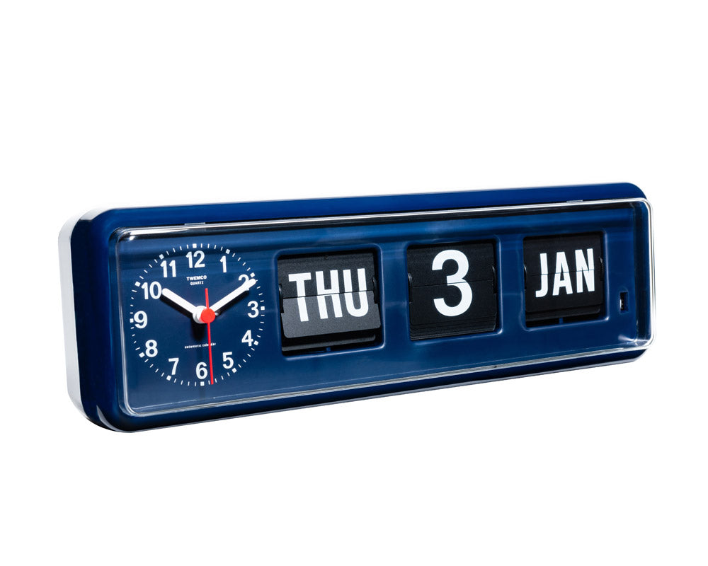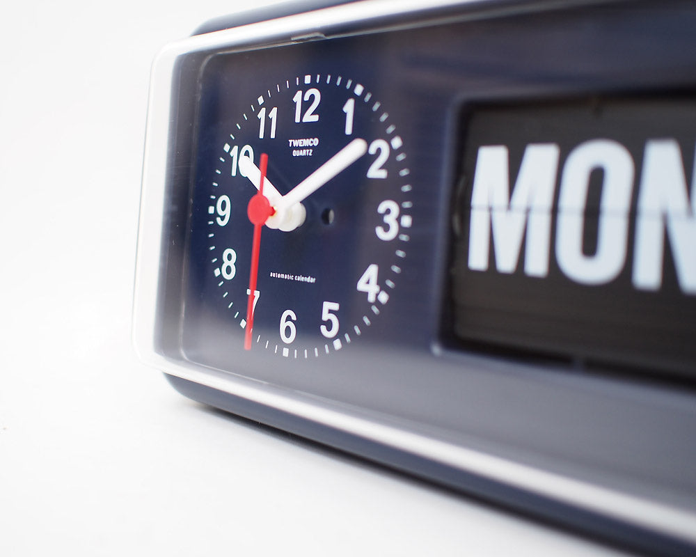 1969年設立のTWEMCO(トゥエンコ)社のカレンダークロックBQ-38をベースに、今のインテリアに馴染むようにネイビーにカラー別注したオートカレンダー付クロックです。 シンプルなデザインと作りの確かさが人気のTWEMCO。このBQシリーズはアナログ時計にクォーツムーブメントを搭載し、カレンダー機能はフルオートマチック(閏年対応)になります。 その人気モデルBQ-38をネイビーカラーに別注。試行錯誤し何度も試作を重ねたカラーは深く美しいネイビーに仕上がっています。 また、背面には壁掛け用の穴も設置されていて、壁掛け時計としても使用可能です。