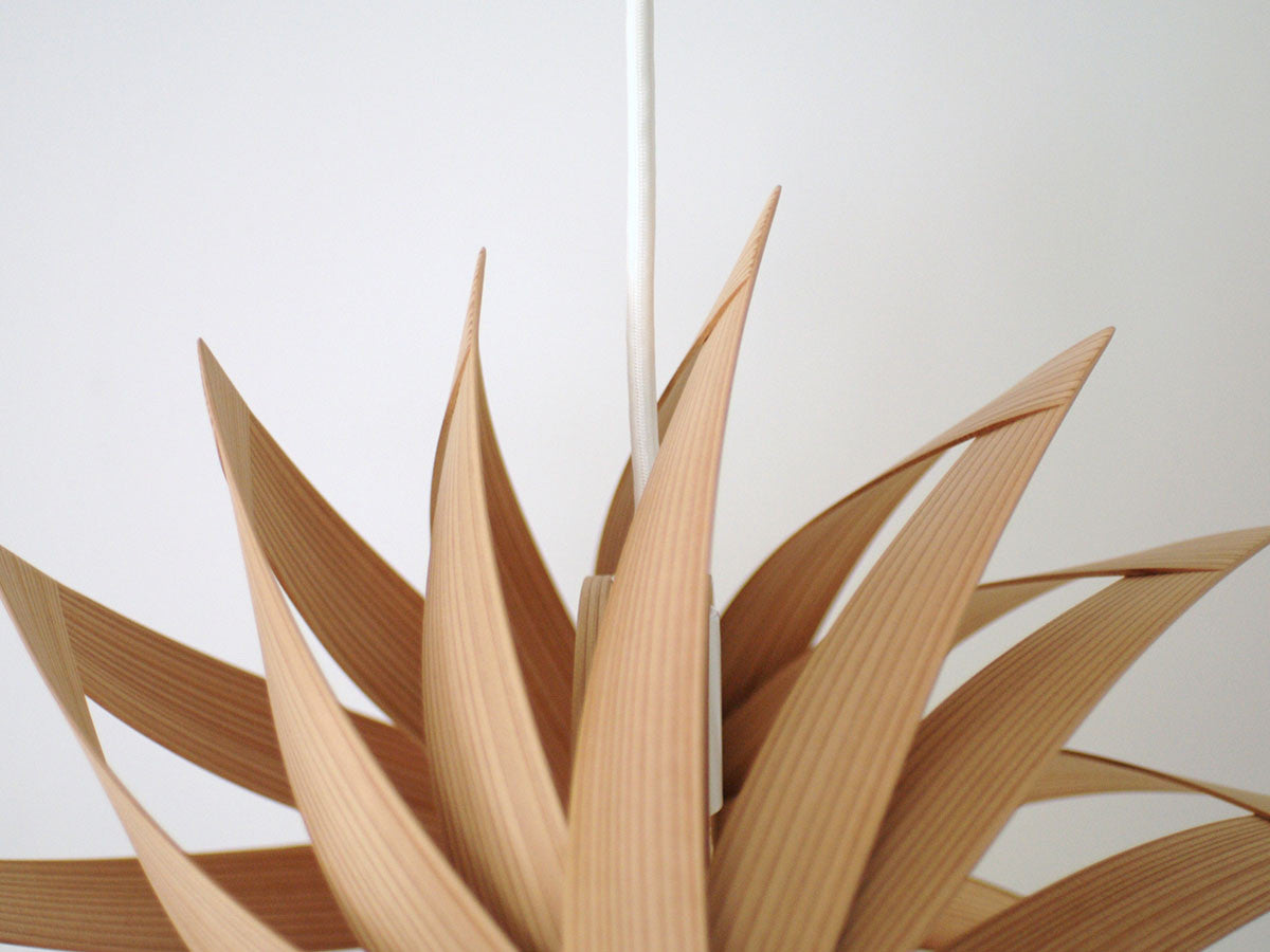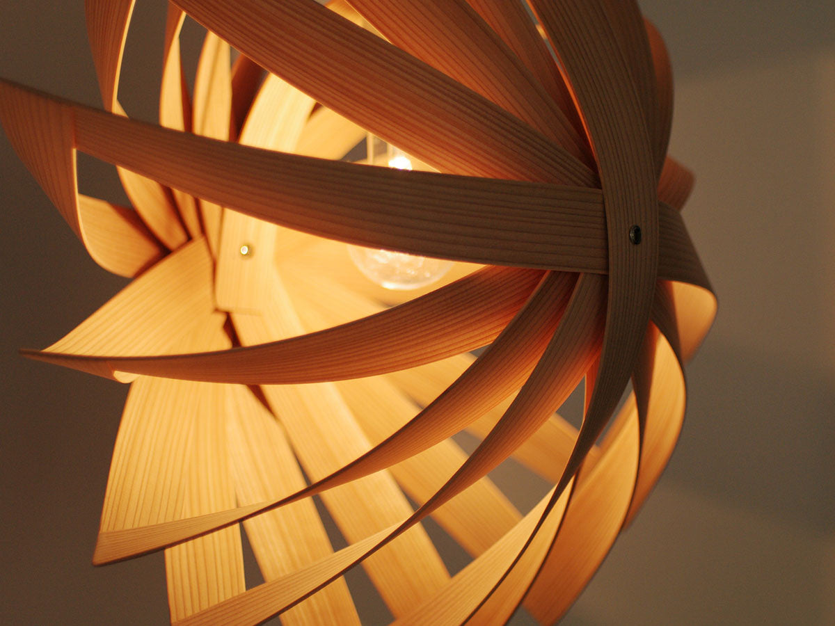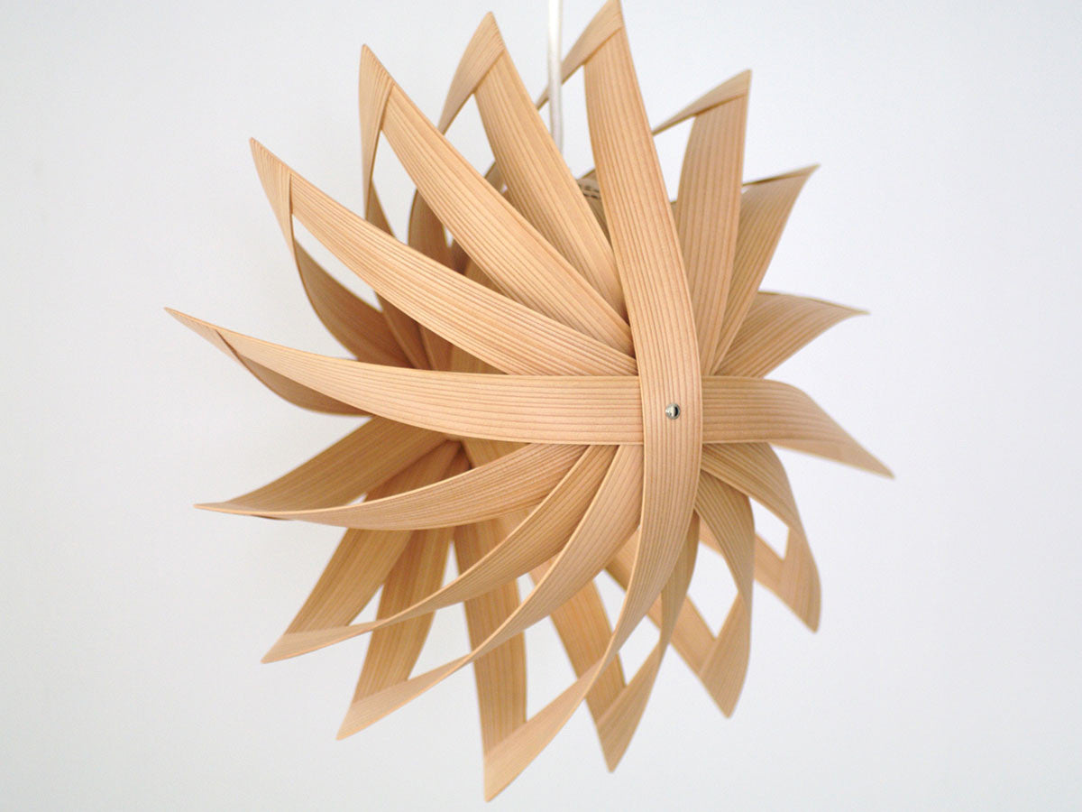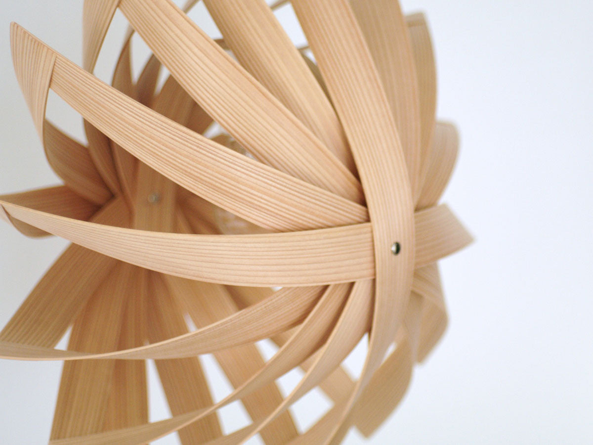 日本の伝統工芸「曲げわっぱ」の技法を用いた作品。秋田杉の単板を熱湯の中で曲げながら、おひつや茶筒を作る「曲げわっぱ」。秋田杉を無塗装で使用することで、独特の風合いと香りが生まれ、視覚と嗅覚を刺激します。デザインだけでなく、曲げ・貼付け・組立てに至るすべての工程を作家である谷氏本人が制作しています。“ 日本のインテリアのほとんどが輸入物であり、今では日本の伝統工芸も下火になりつつある。その日本の伝統工芸を海外の人が買っていき、また新たな形として日本に「逆輸入」として登場する。なぜ日本に住みながら身近にある「日本の良い物」に気が付かないか、自分の作品を通してもっと多くの人に日本の伝統工芸を知ってもらいたい、そう考えました。実際、自分自身伝統工芸に触れる為に秋田に修行に行き、「曲げわっぱ」という伝統に触れて来ました。今までのインテリアは視覚的な情報でしかなかった物を「曲げわっぱ」に使われる素材、秋田杉から出る香りで嗅覚的情報、人間の五感のうちの二つで感じるインテリアを実現させました。”(照明作家 谷俊幸)