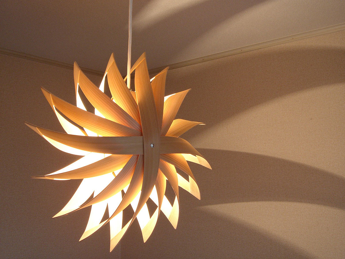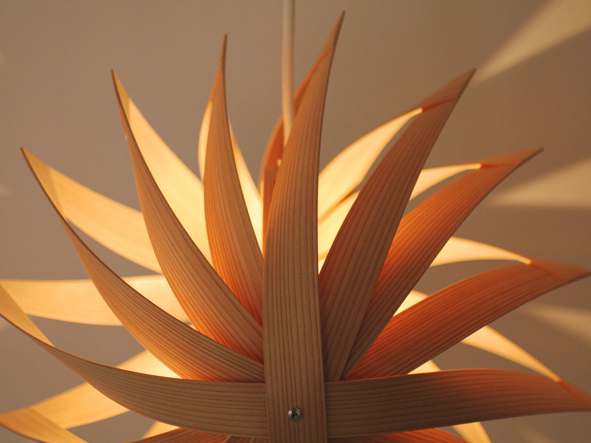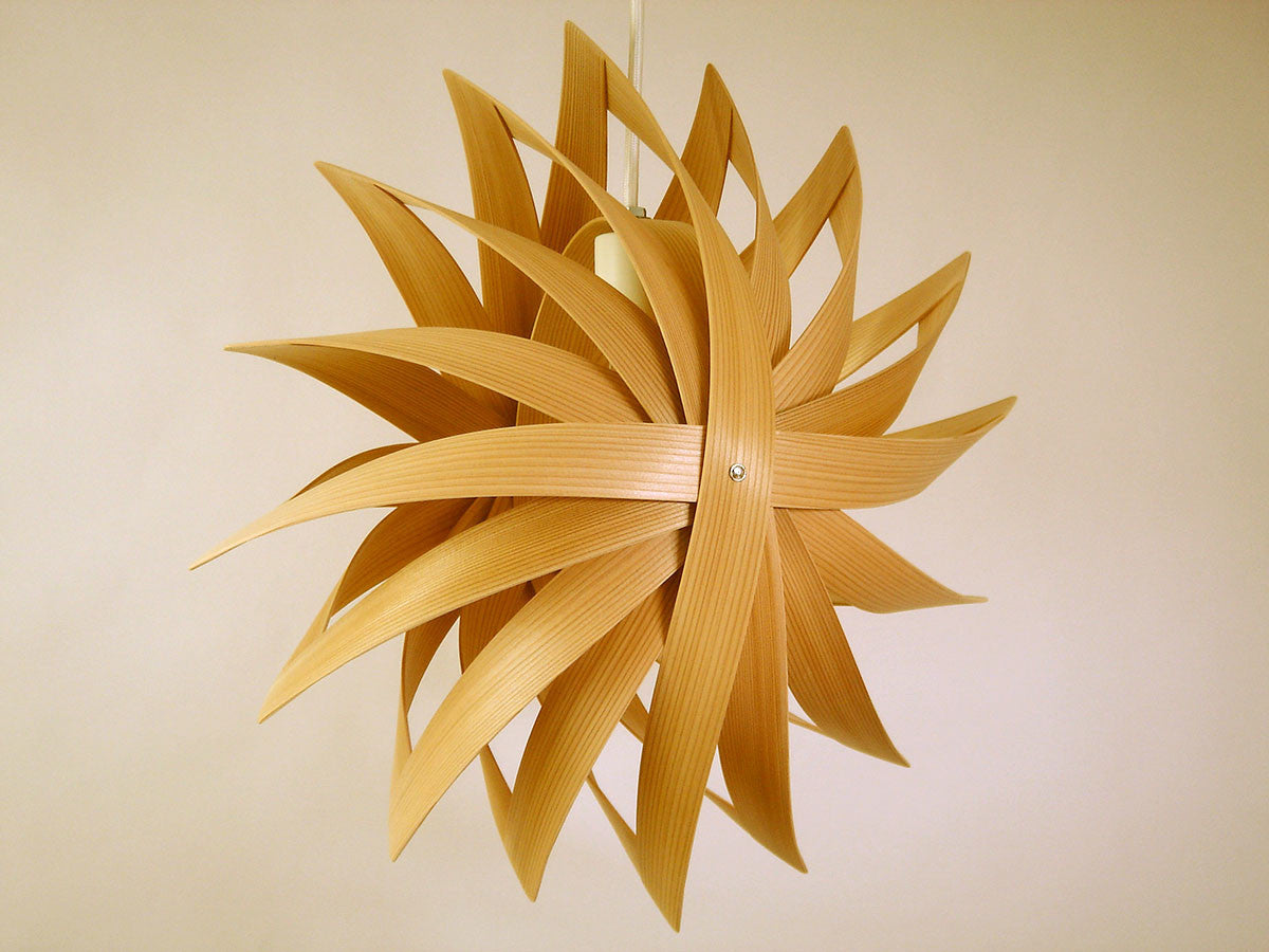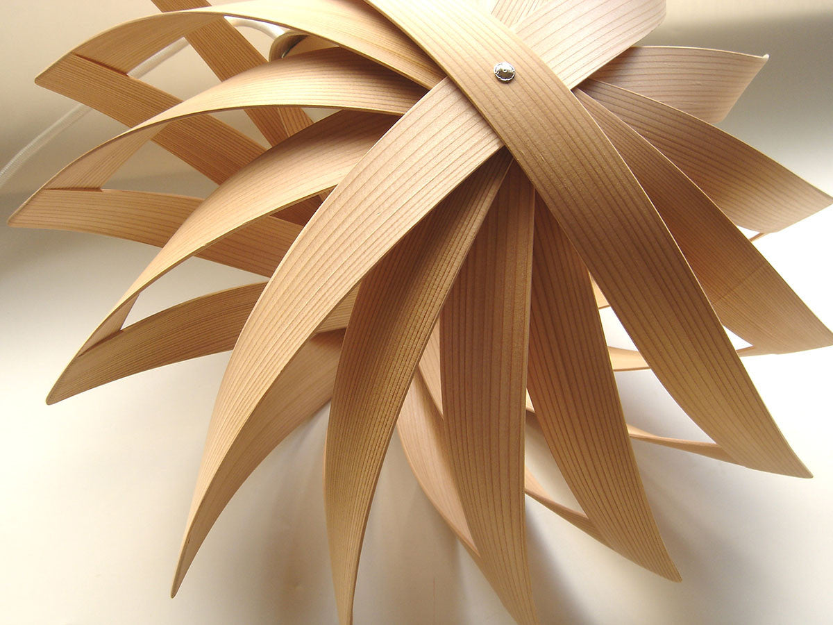 日本の伝統工芸「曲げわっぱ」の技法を用いた作品。秋田杉の単板を熱湯の中で曲げながら、おひつや茶筒を作る「曲げわっぱ」。秋田杉を無塗装で使用することで、独特の風合いと香りが生まれ、視覚と嗅覚を刺激します。デザインだけでなく、曲げ・貼付け・組立てに至るすべての工程を作家である谷氏本人が制作しています。“ 日本のインテリアのほとんどが輸入物であり、今では日本の伝統工芸も下火になりつつある。その日本の伝統工芸を海外の人が買っていき、また新たな形として日本に「逆輸入」として登場する。なぜ日本に住みながら身近にある「日本の良い物」に気が付かないか、自分の作品を通してもっと多くの人に日本の伝統工芸を知ってもらいたい、そう考えました。実際、自分自身伝統工芸に触れる為に秋田に修行に行き、「曲げわっぱ」という伝統に触れて来ました。今までのインテリアは視覚的な情報でしかなかった物を「曲げわっぱ」に使われる素材、秋田杉から出る香りで嗅覚的情報、人間の五感のうちの二つで感じるインテリアを実現させました。”(照明作家 谷俊幸)