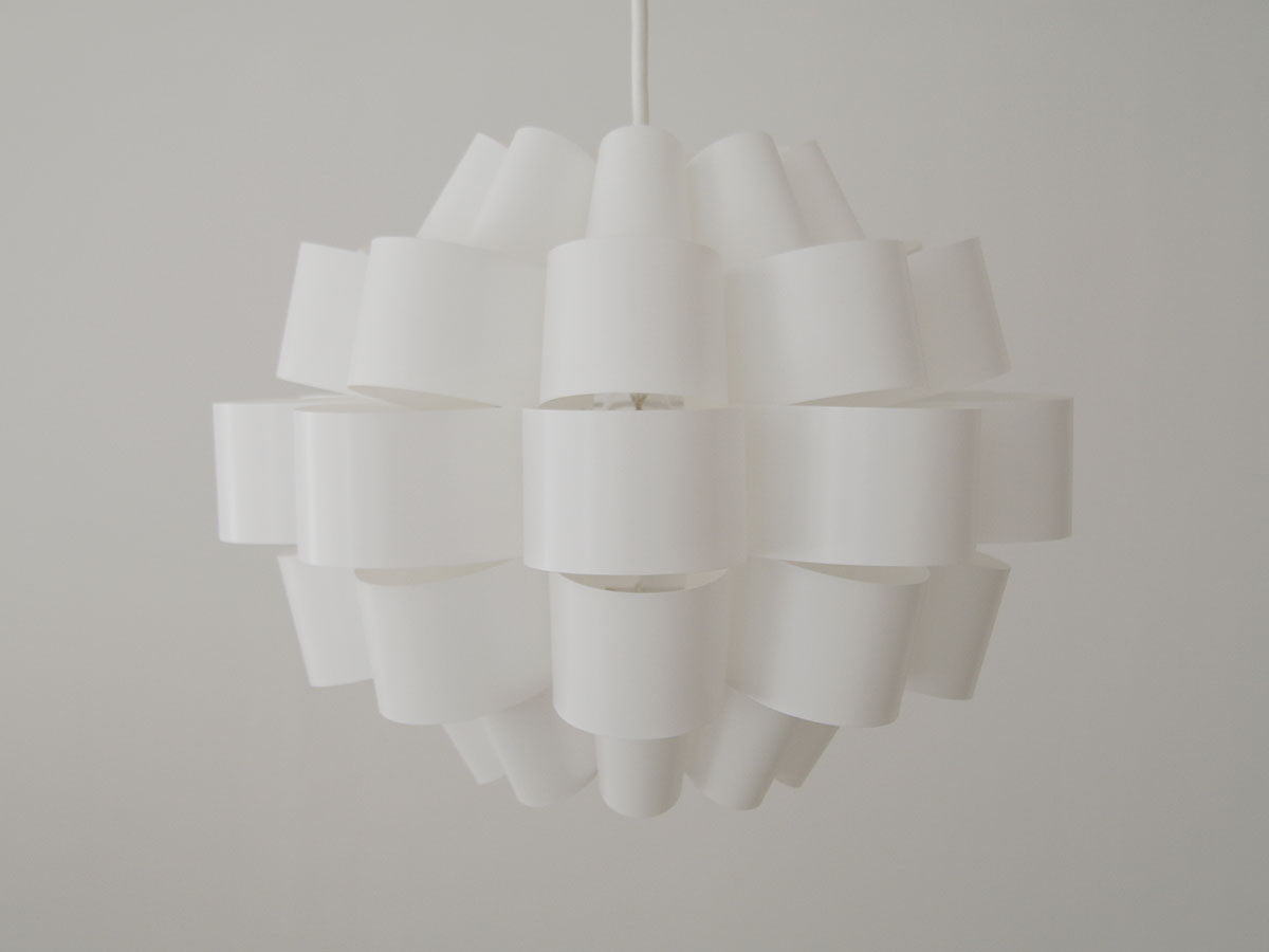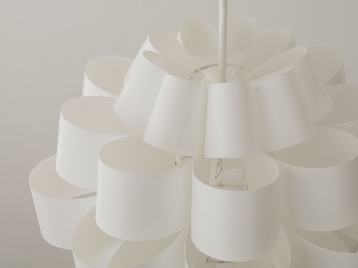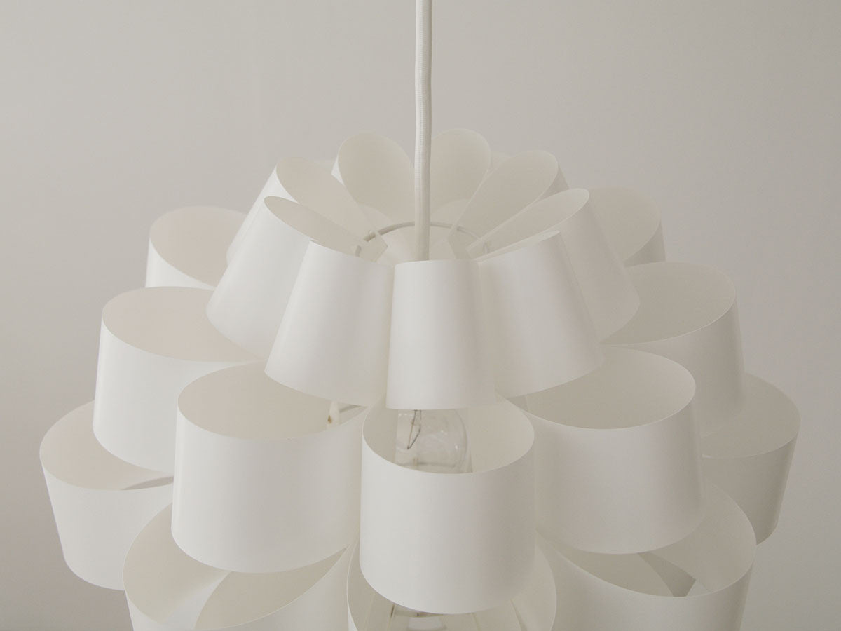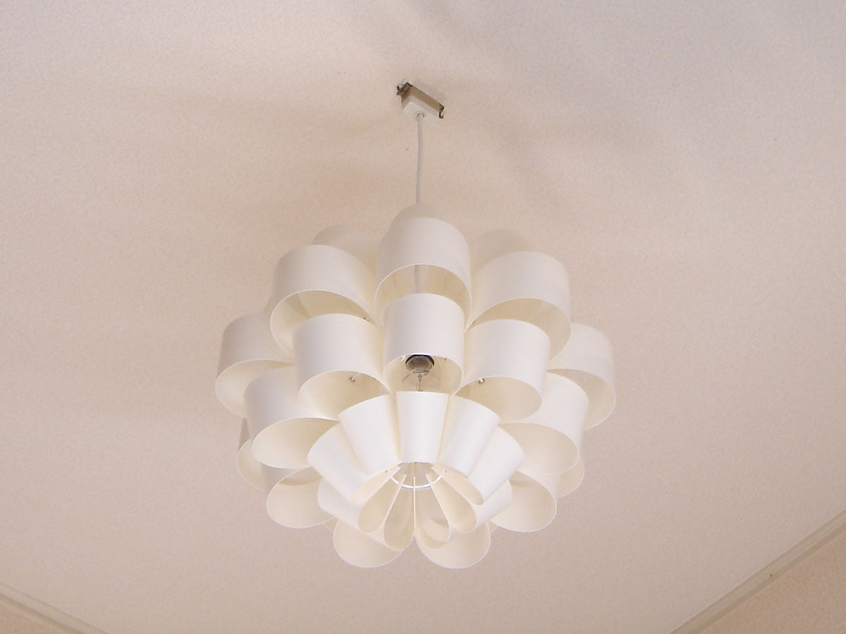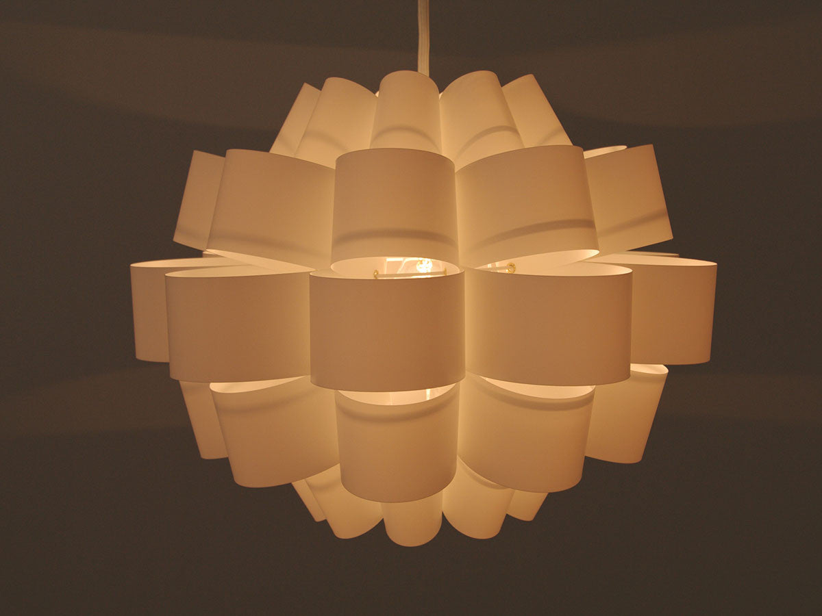 1950年前後に流行したミッドセンチュリーテイストを感じさせるランプです。素材に工業製品などに用いられるP.P.(ポリプロピレンシート)を使うことで、光りは柔らかく、そして暖かく変化し、和紙に似た特有の効果を発揮します。ランプによって生まれる光と影が、花のように壁や床に広がります。